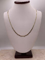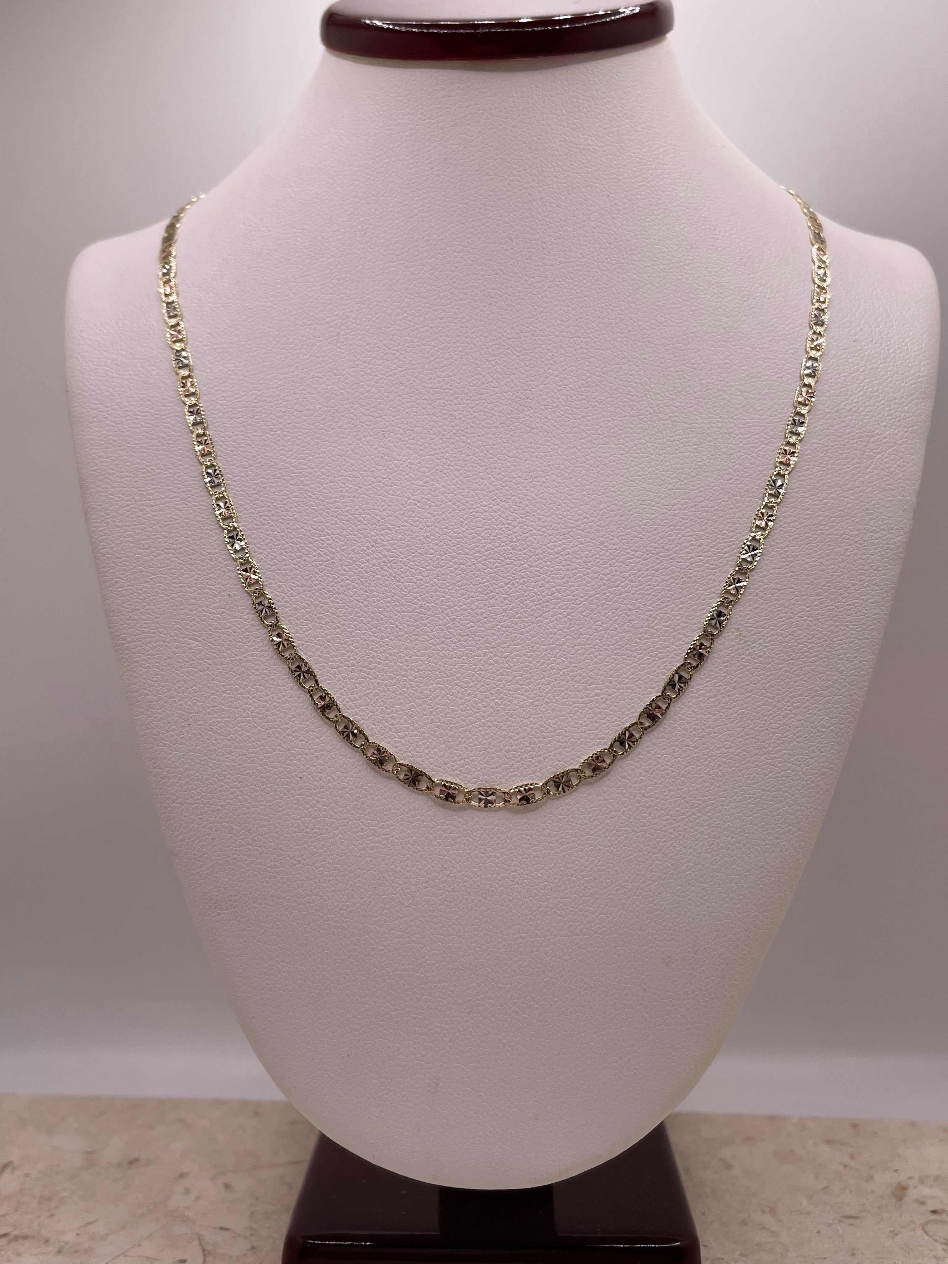 Elevate your jewelry collection with this exquisite 14k gold Valentino chain. Featuring a stunning tri-color design—yellow, white, and rose gold—with intricate diamond-cut detailing, this 2.6mm chain exudes sophistication and elegance.