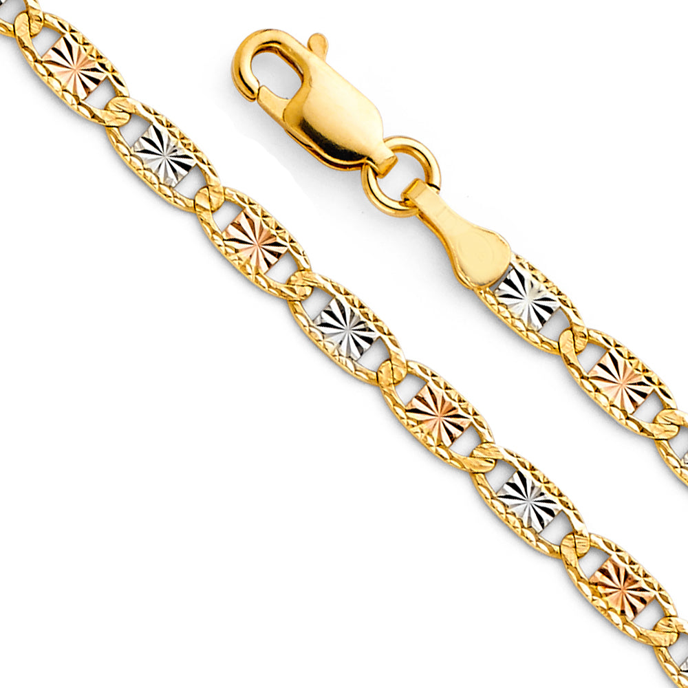 Elevate your jewelry collection with this exquisite 14k gold Valentino chain. Featuring a stunning tri-color design—yellow, white, and rose gold—with intricate diamond-cut detailing, this 3.2mm chain exudes sophistication and elegance.