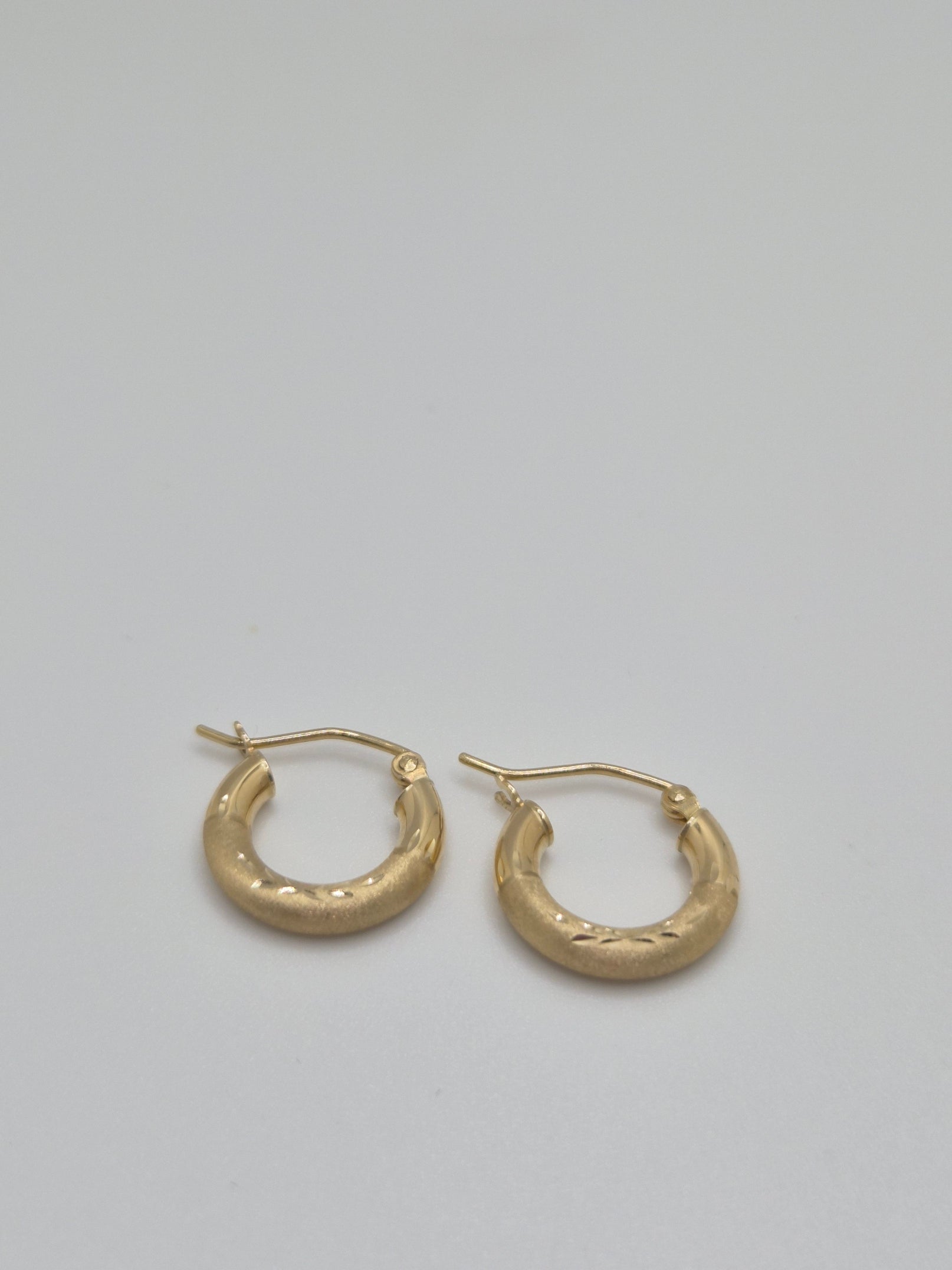 Small but mighty ✨ These 14K yellow gold mini hoops feature a subtle diamond-cut pattern with a soft satin finish that gives off the perfect golden glow. Their 15mm size and 3mm thickness make them a timeless everyday staple — lightweight, classic, and just the right touch of sparkle.