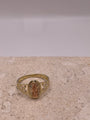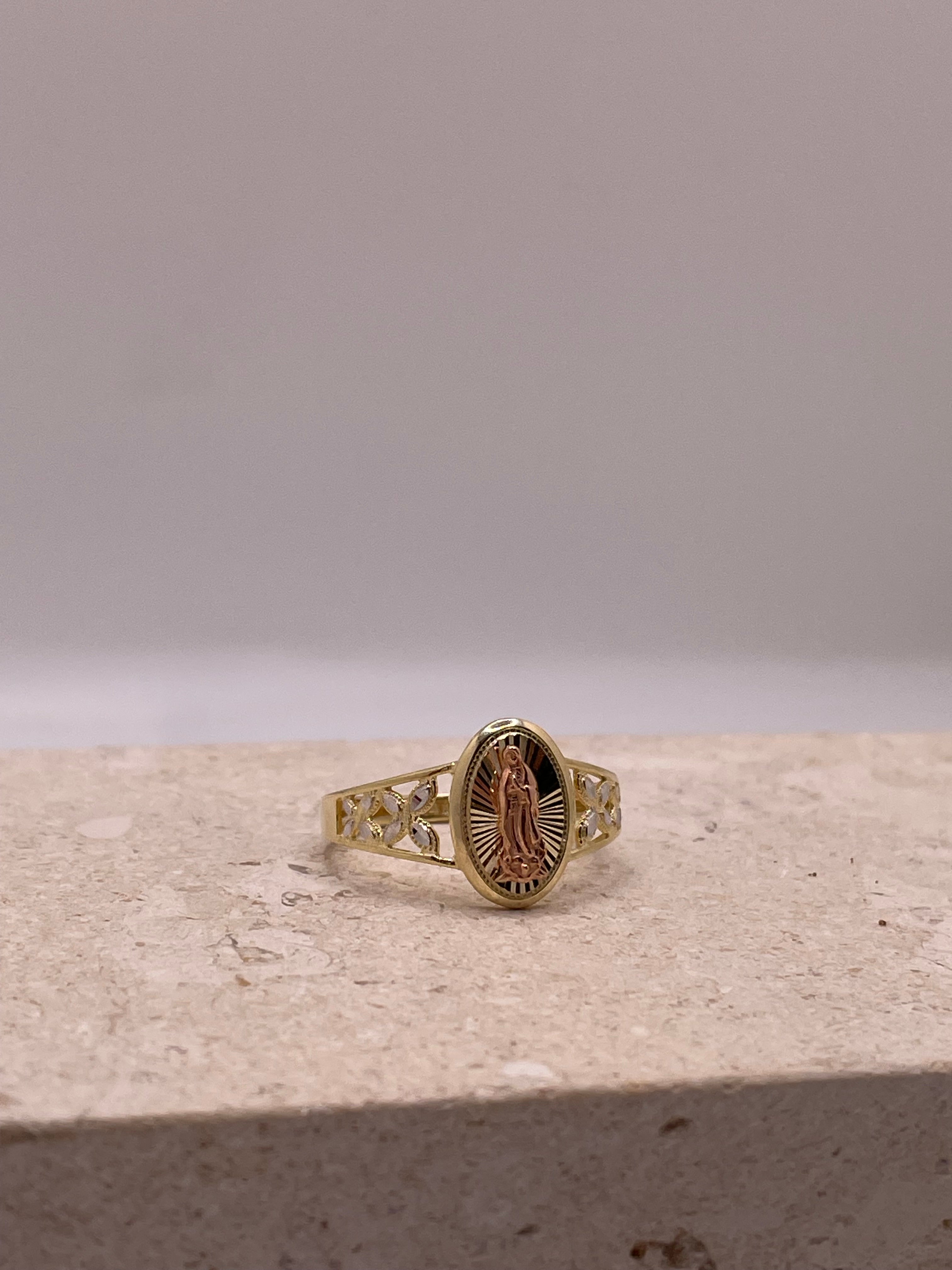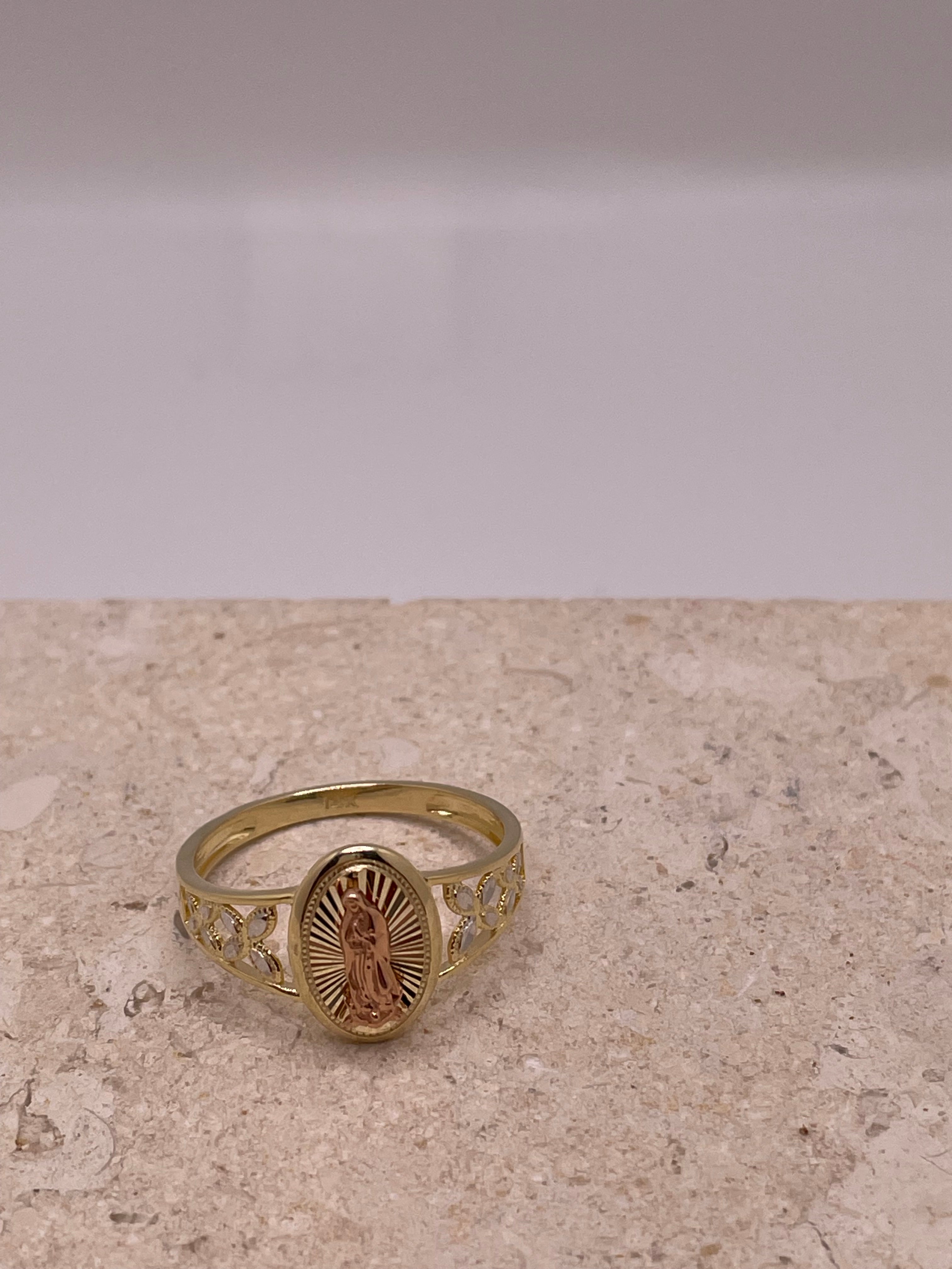 This beautiful 14K gold ring features the Virgencita at its center, encased in a stunning oval of rose gold. Surrounding her is a delicate diamond-cut design that adds intricate detail and sparkle. On both sides, you'll find gorgeous flowers with a unique cut-out design, enhancing the ring's elegance and charm.