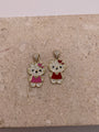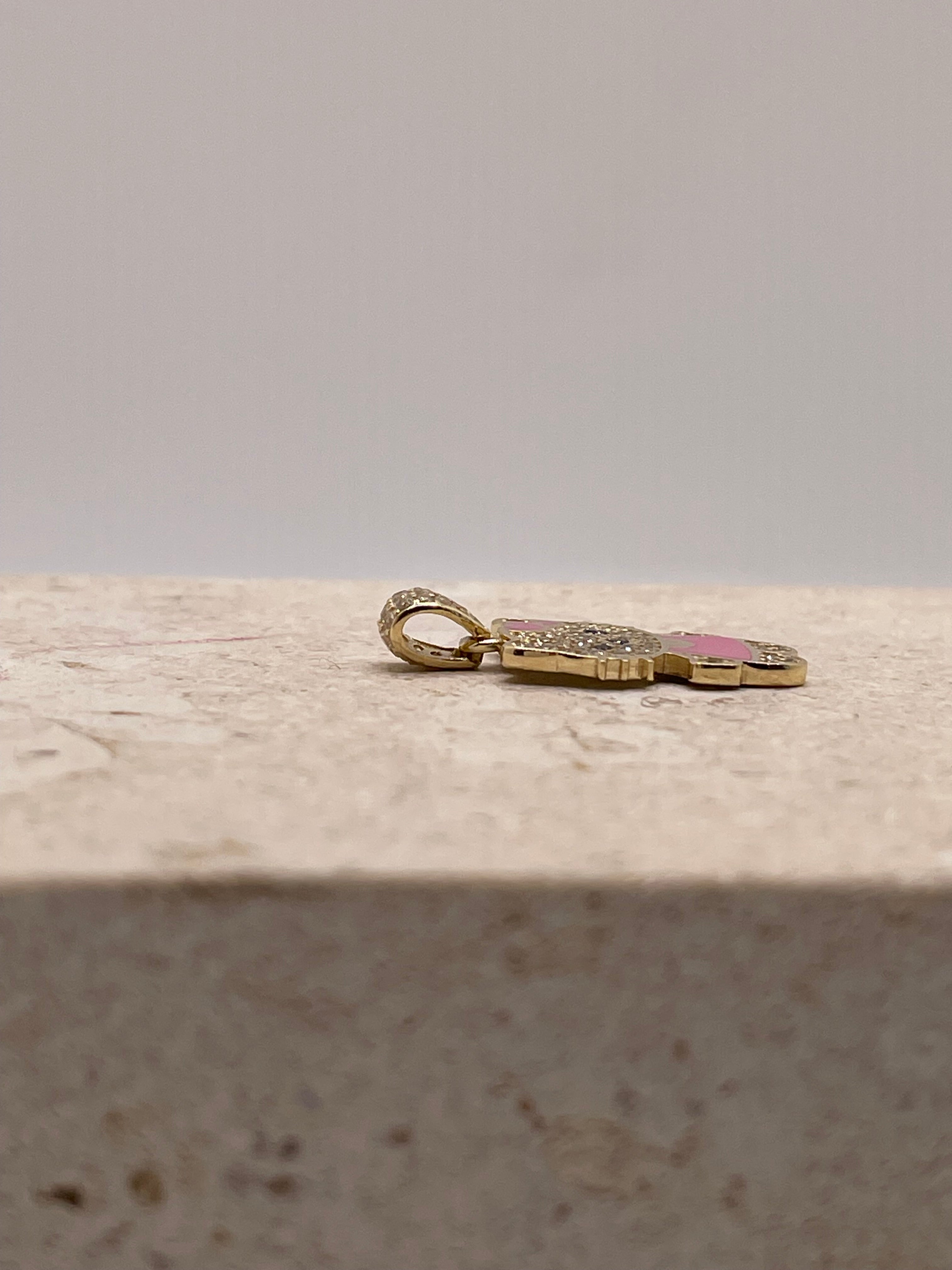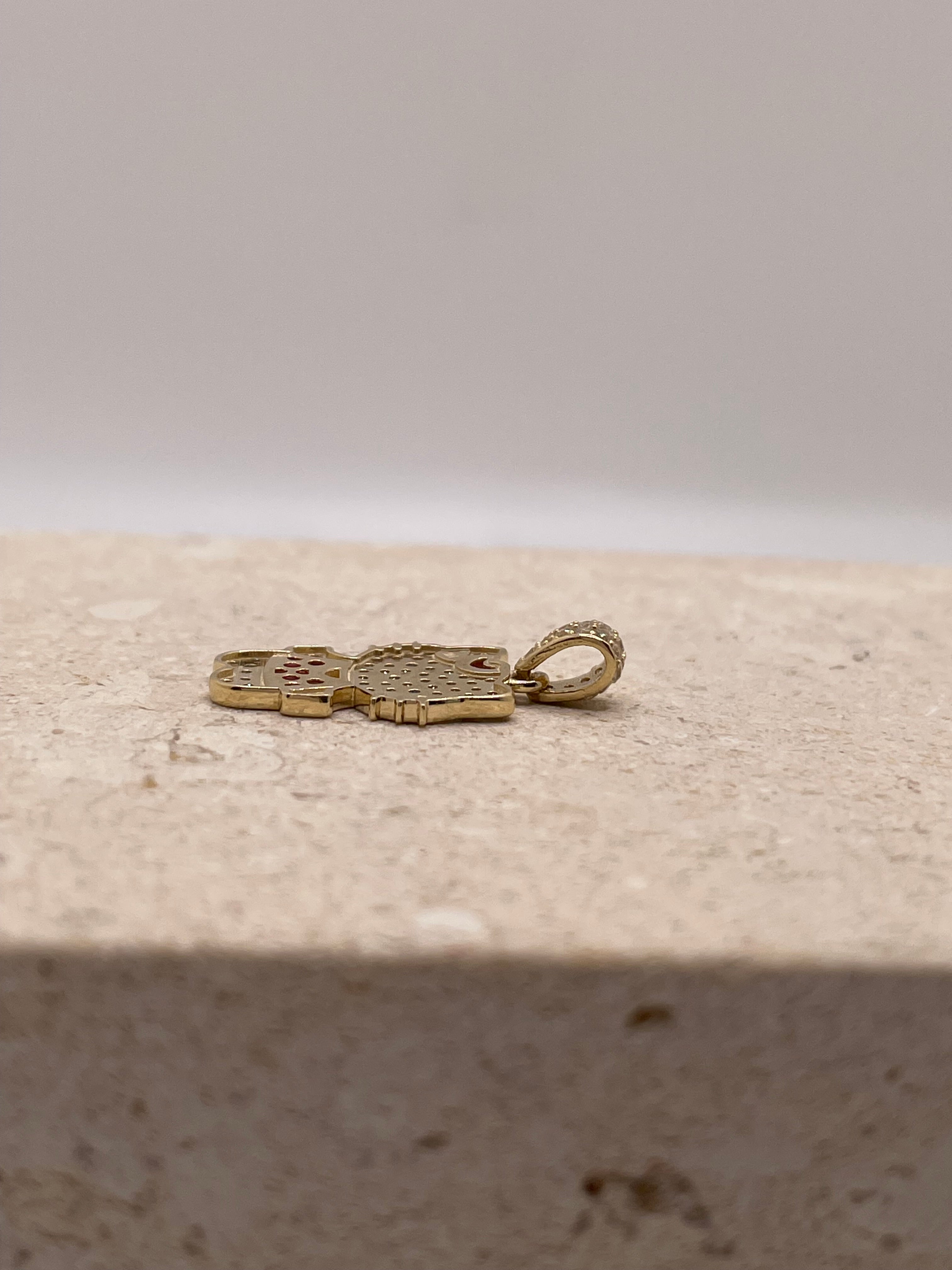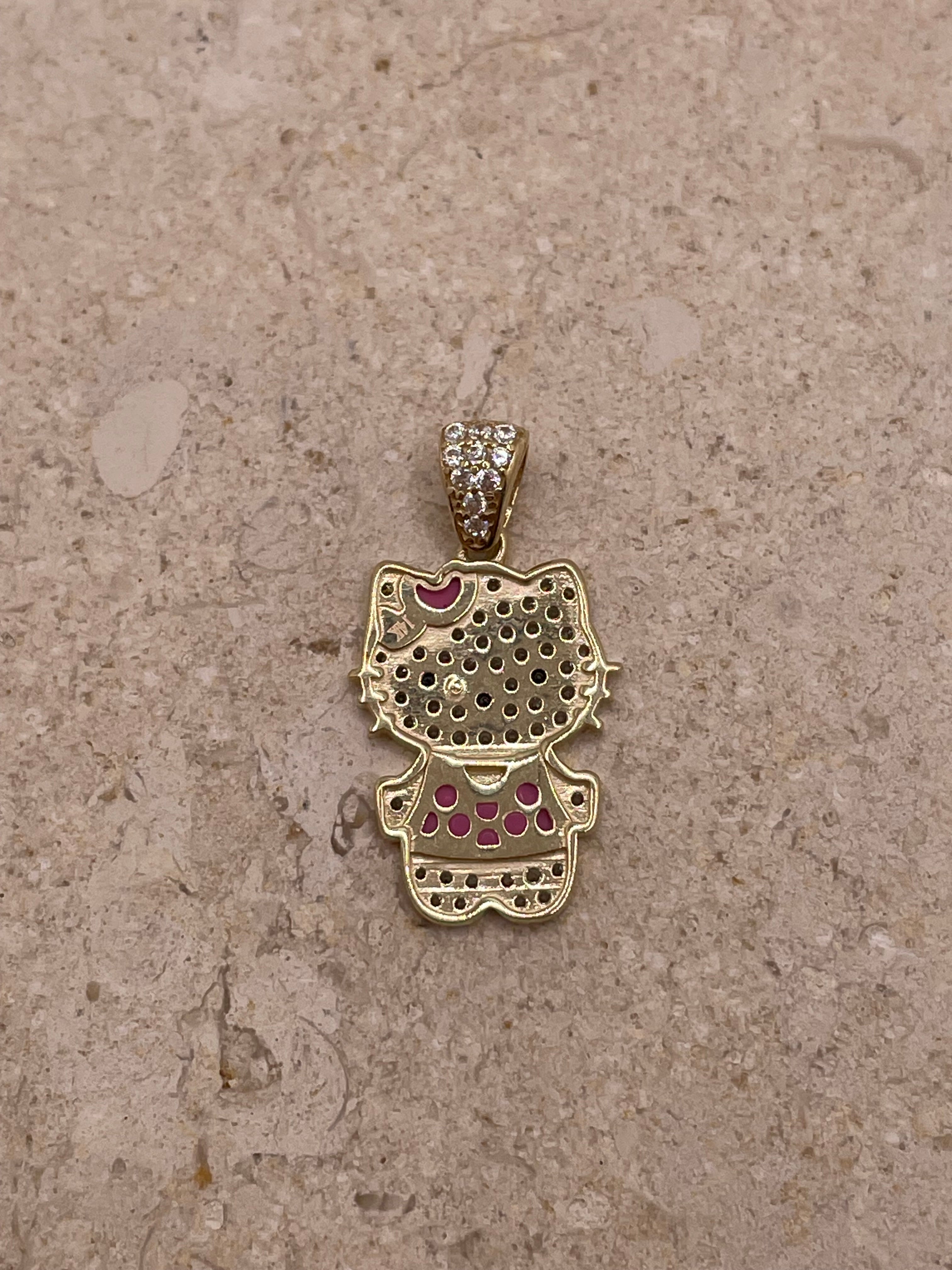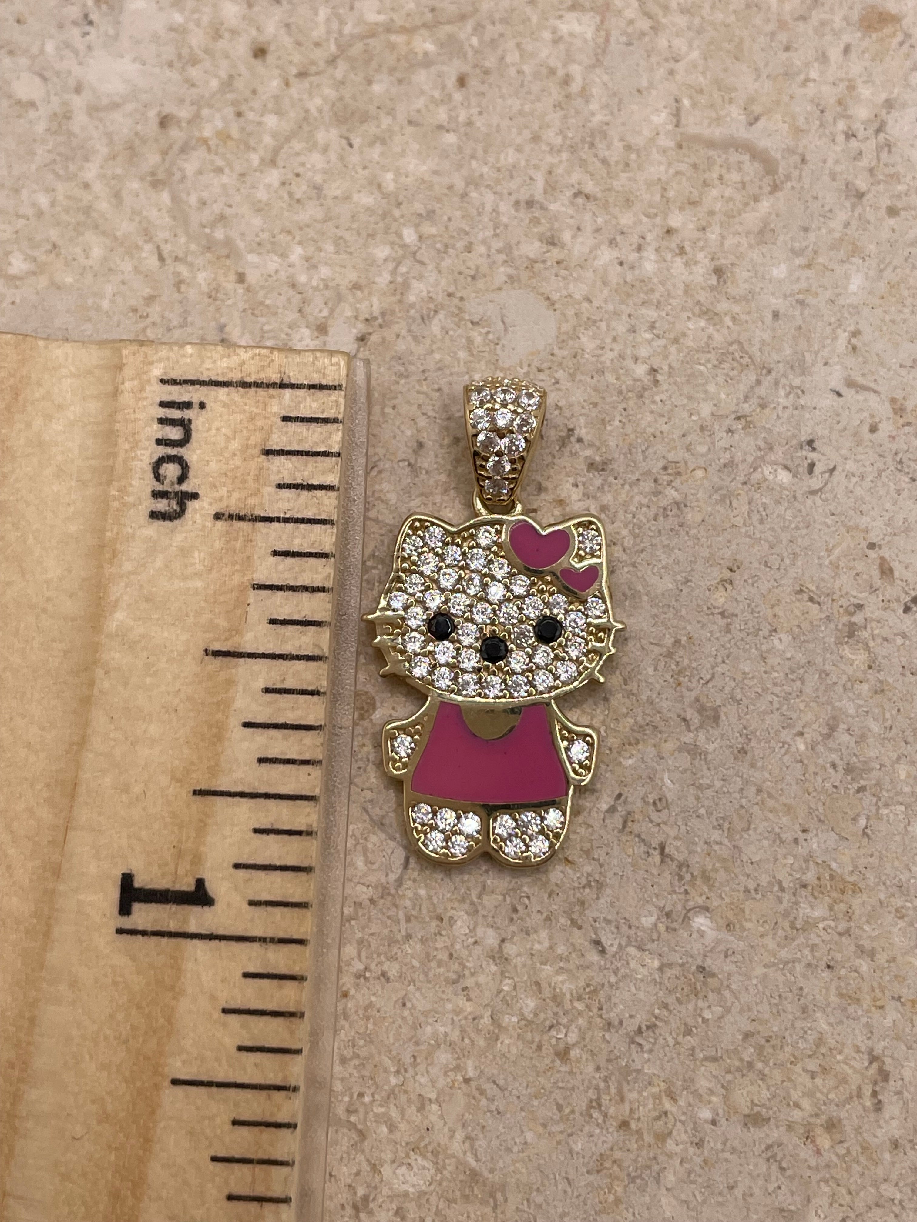 This 14K solid gold Hello Kitty pendant is a playful yet elegant accessory. Kitty’s dress and bow are beautifully colored, available in two designs:
