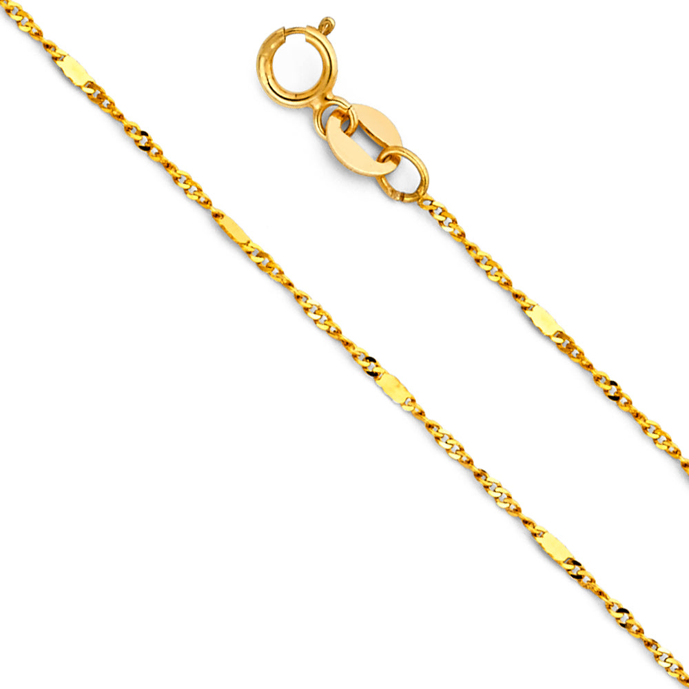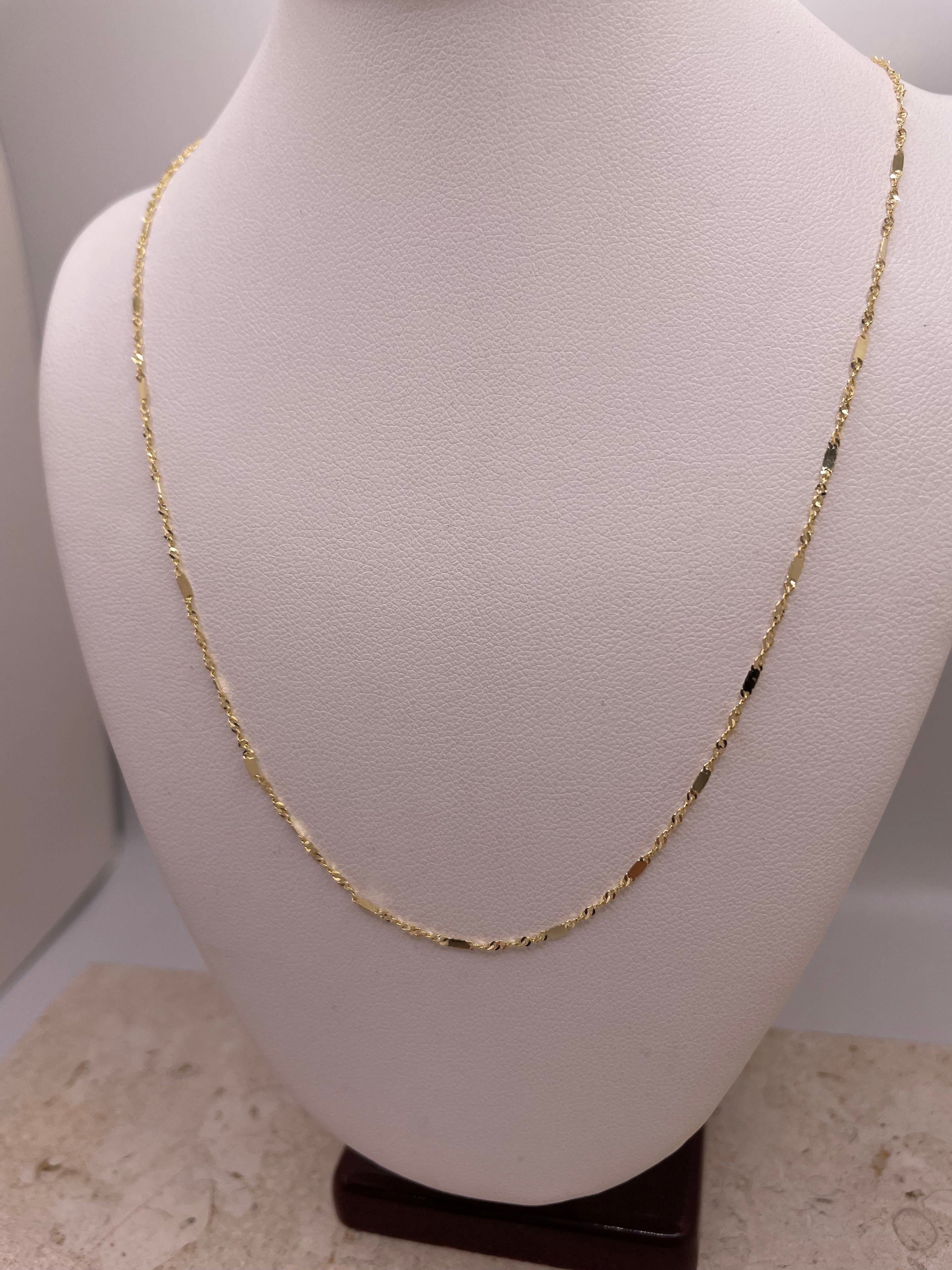 This 14K gold 1.3mm Singapore chain necklace features a stunning stamp bar and twisted design that shines beautifully in the light. Its delicate and classy style adds a timeless elegance to any outfit, making it perfect for everyday wear or special occasions. Available in 16", 18", 20", and 22" lengths, this versatile necklace pairs effortlessly with pendants or looks stunning on its own.
