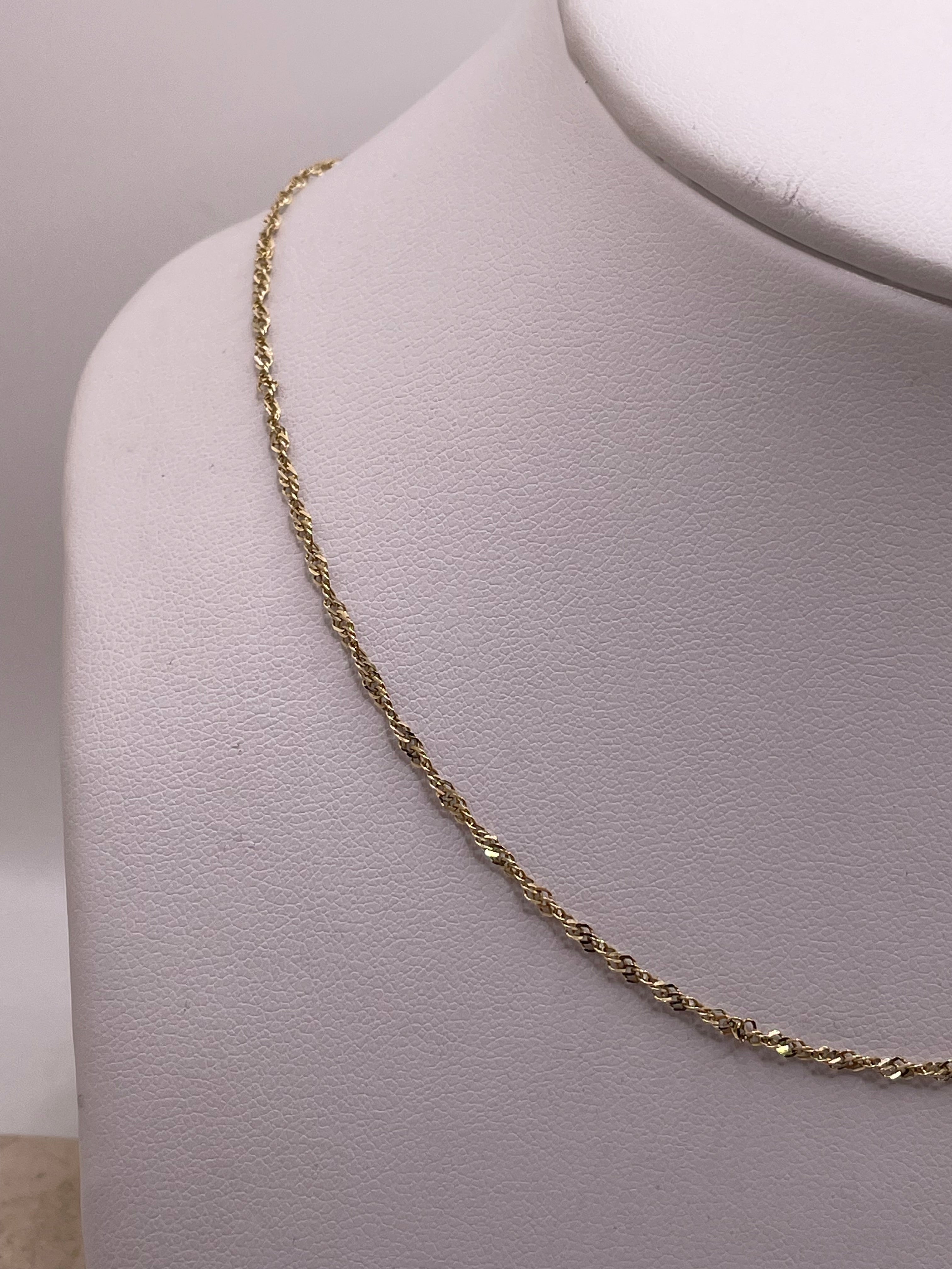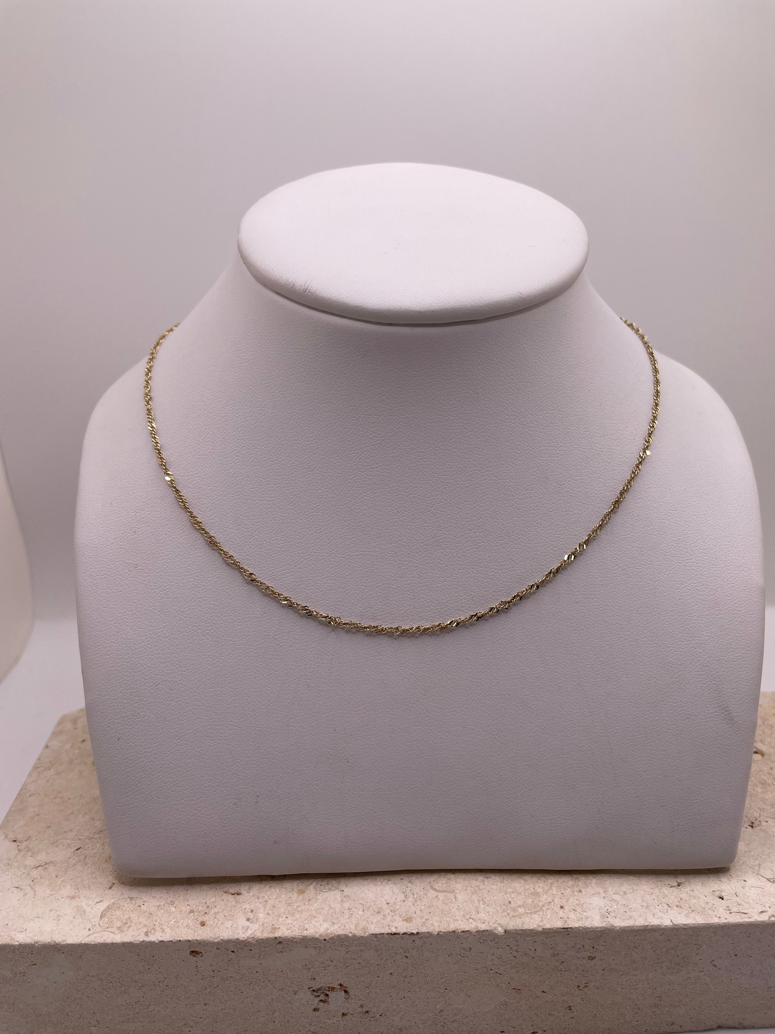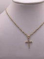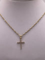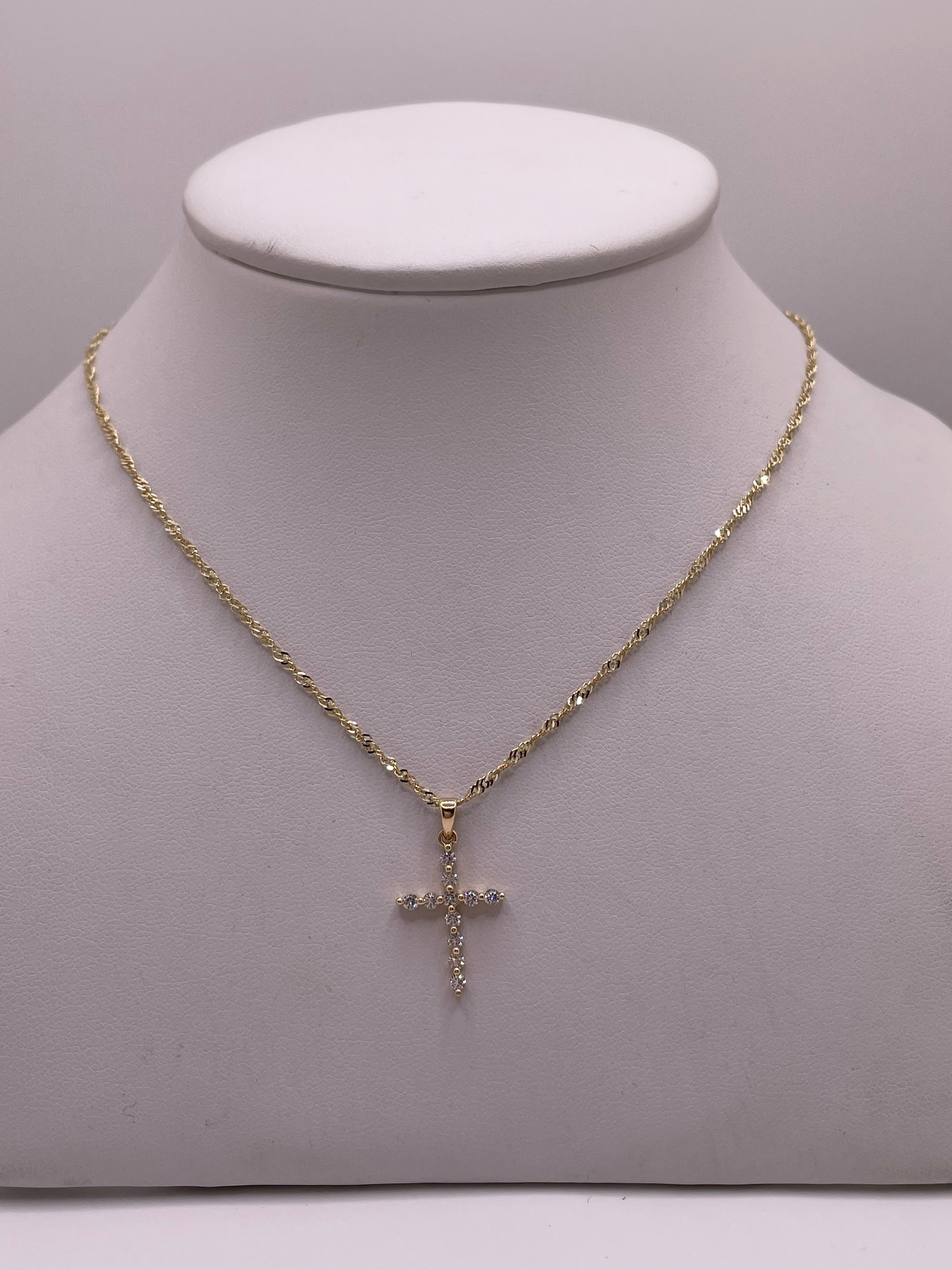 This stunning jewelry set includes a 14k gold 1.8mm Singapore chain available in lengths of 16, 18, 20, 22, and 24 inches, paired with a delicate CZ cross pendant. The cross features a timeless design with sparkling CZ stones and measures approximately 1 inch in height (20mm) and 14mm in width, including the bail. Customers also have the option to purchase the pendant separately.