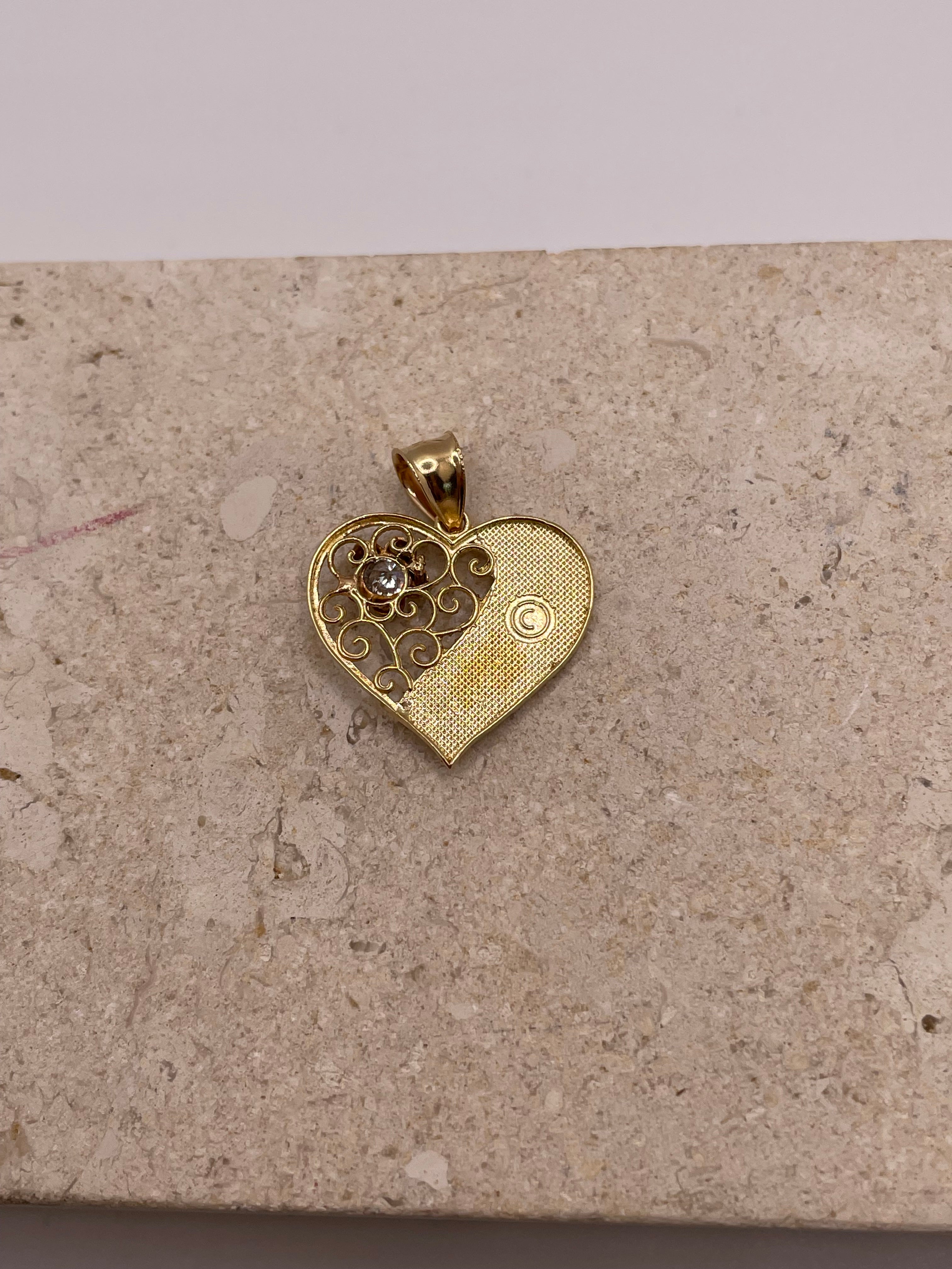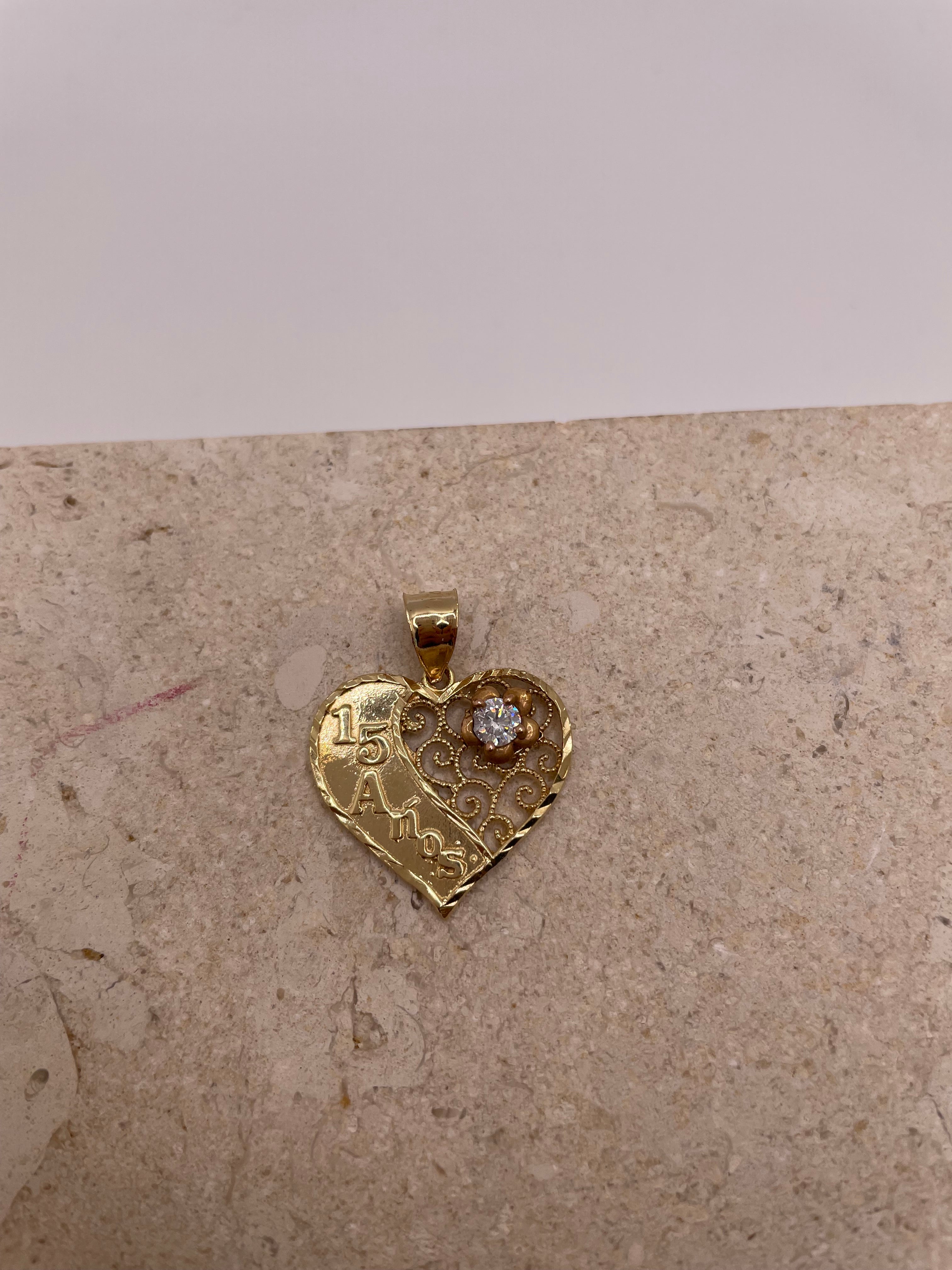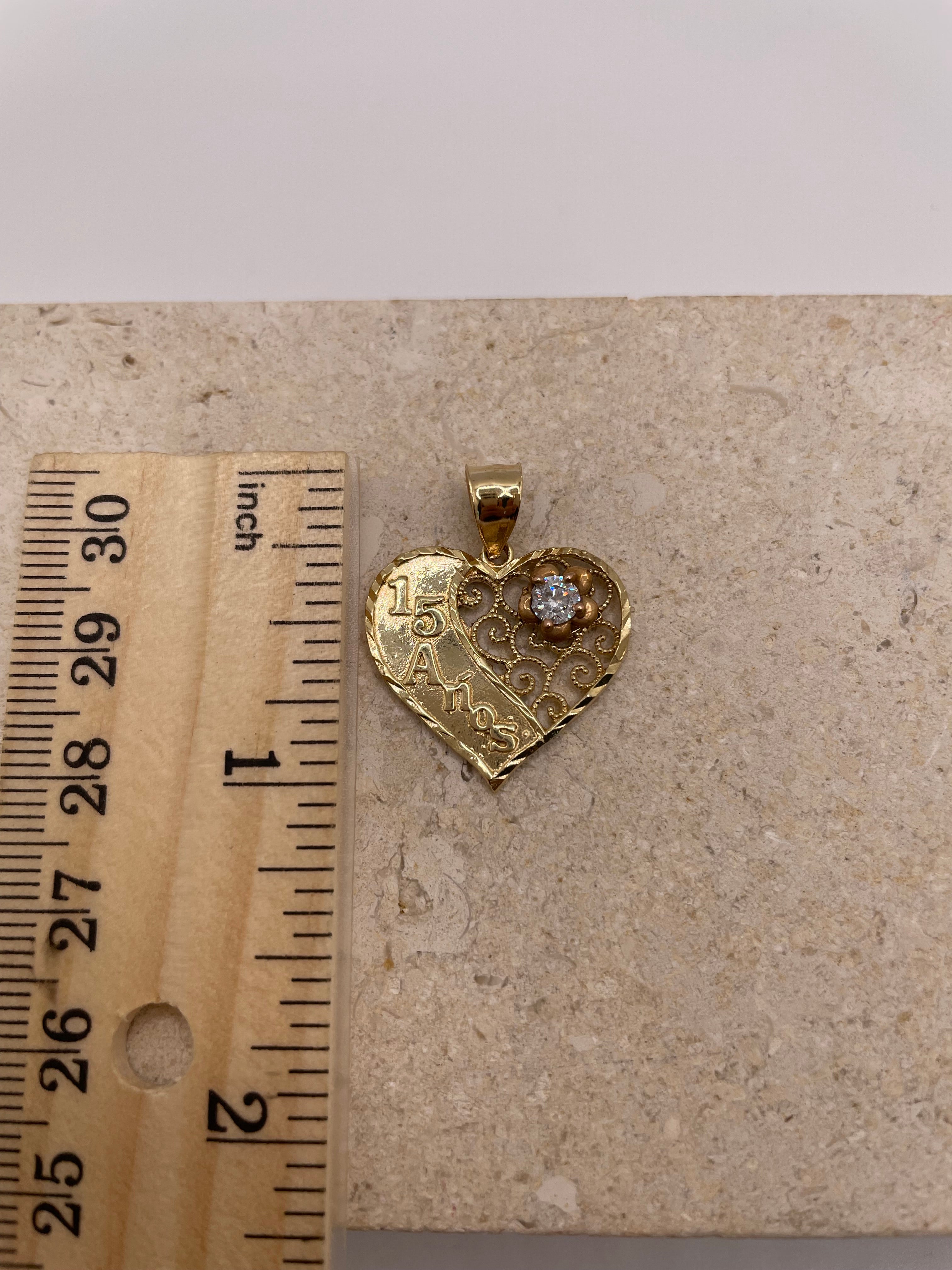 Celebrate a special milestone with this elegant 14k gold Quinceañera pendant. The design features the number "15" on the left side, symbolizing the quinceañera, with a delicate see-through twirl pattern on the right. A beautiful rose gold flower with a CZ stone at its center completes the look. The pendant measures 1 inch in diameter.