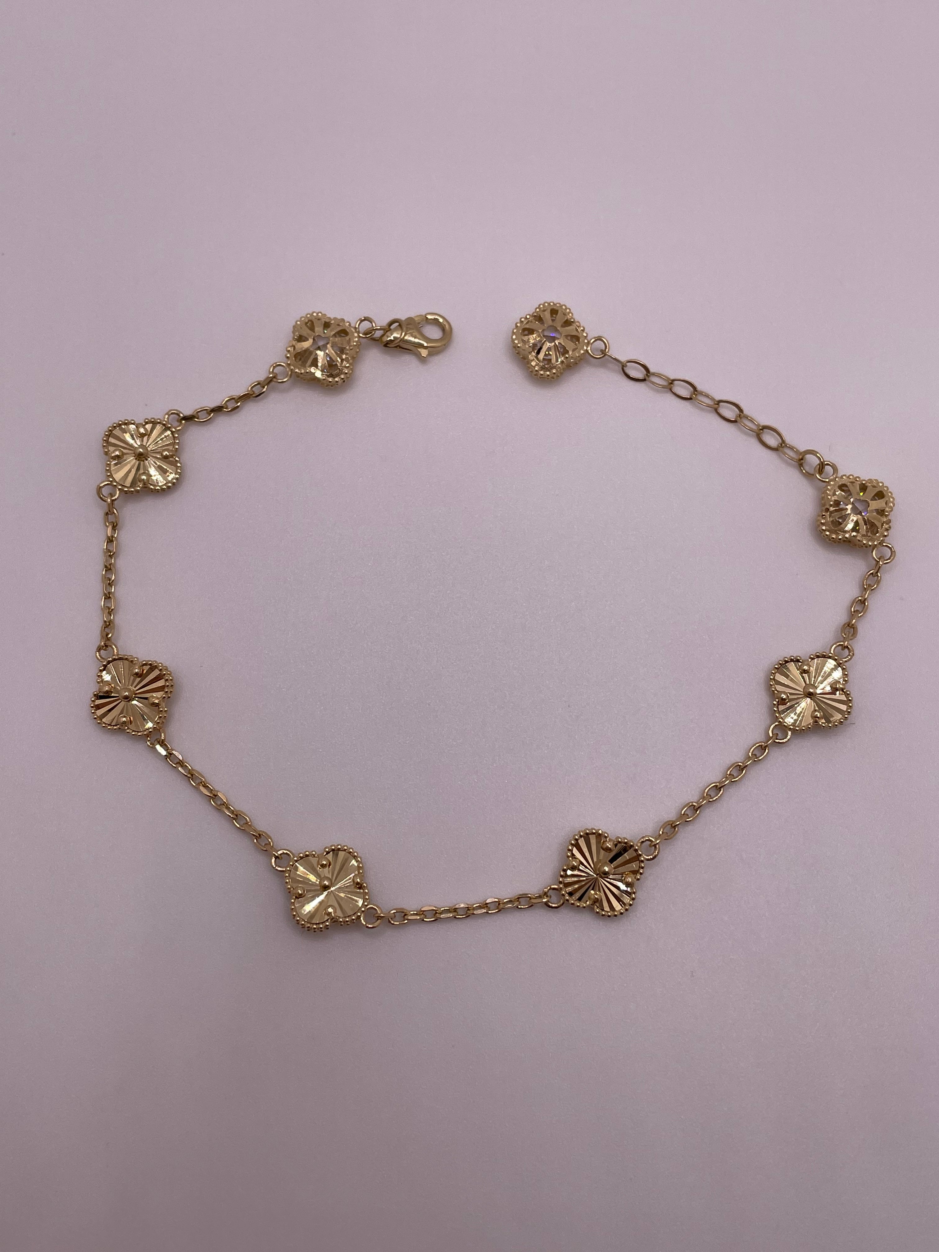 Add a little luck and a lot of shine to your stack with this 14K gold clover trébol bracelet. Designed with five smaller clover motifs, this bracelet has a regular, solid build while keeping the overall motif size more subtle compared to larger clover styles. Each clover is polished to perfection, giving it a timeless and meaningful look that you can wear every day or gift as a symbol of good fortune.