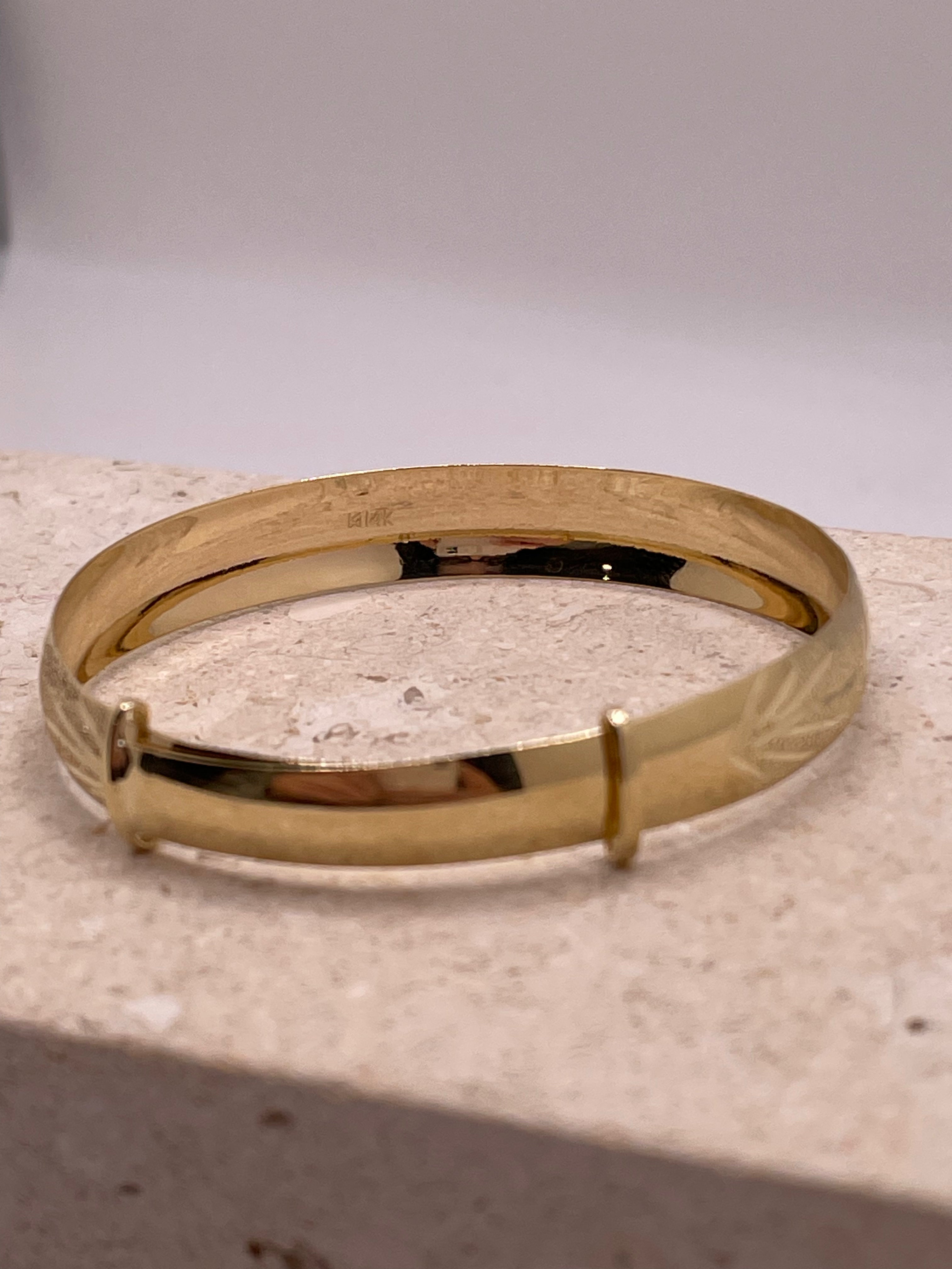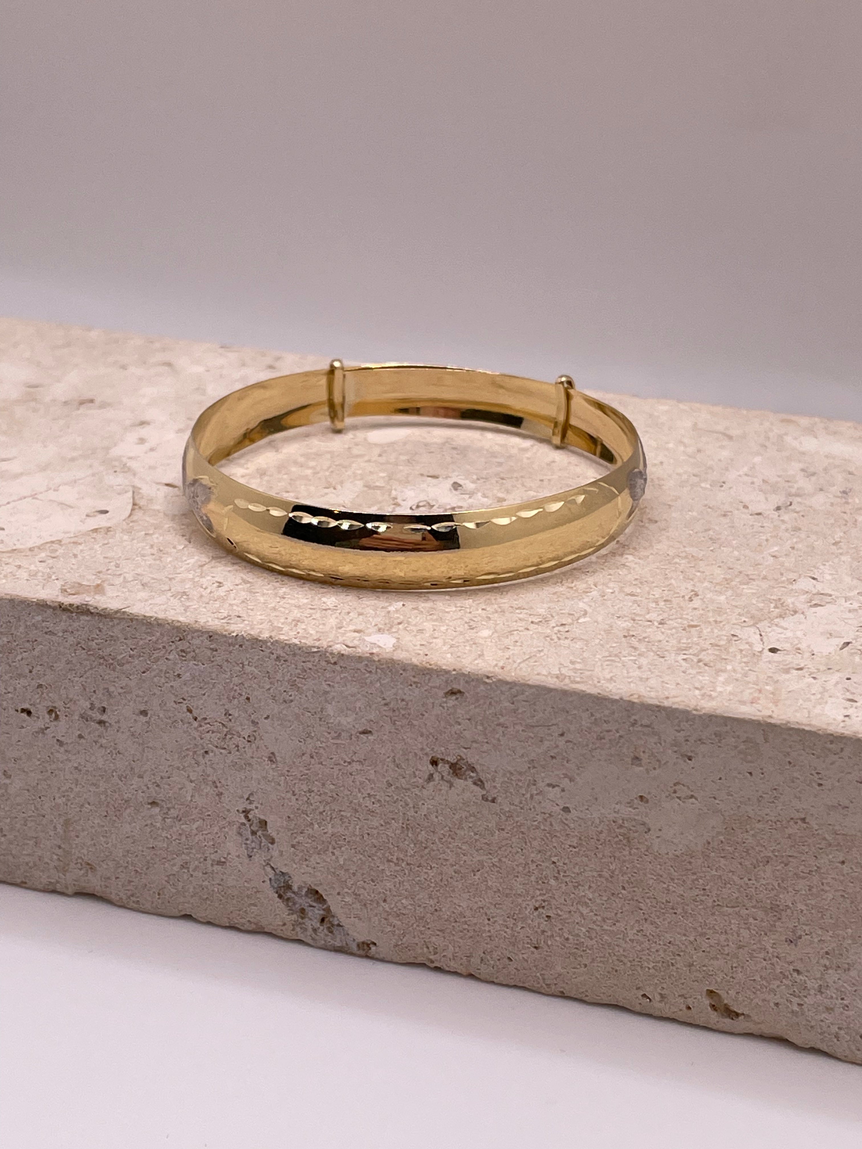 This adorable 14K gold baby bangle is perfect for your little one. Adjustable from 4 to 5.5 inches, it ensures a comfortable and secure fit as your child grows. The bangle features an all-yellow gold design, accented by a unique double sideways heart in white gold. The hearts are beautifully enhanced with a subtle diamond-cut pattern, adding a touch of sparkle and charm to this timeless piece.