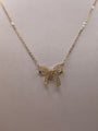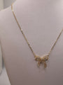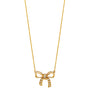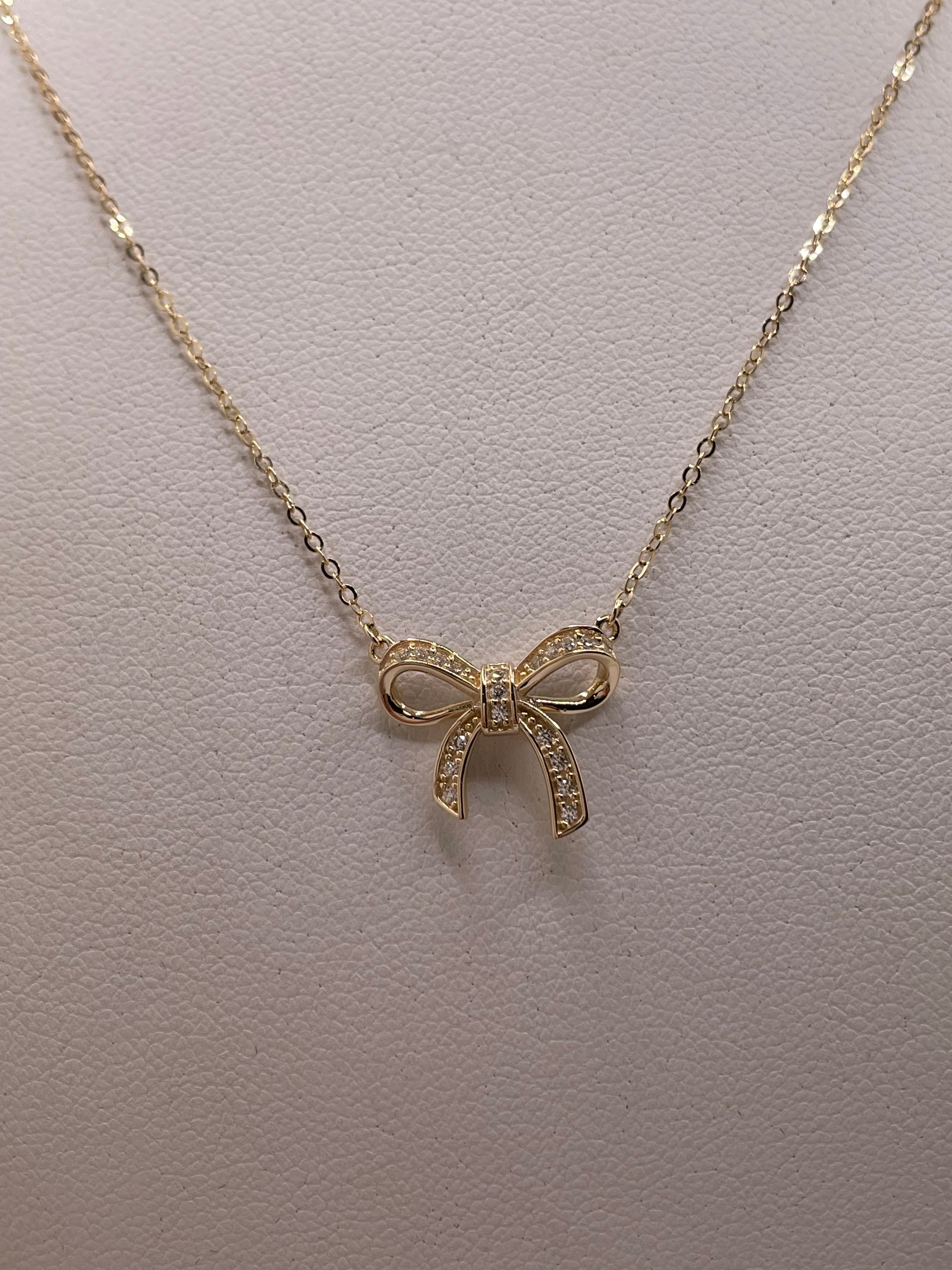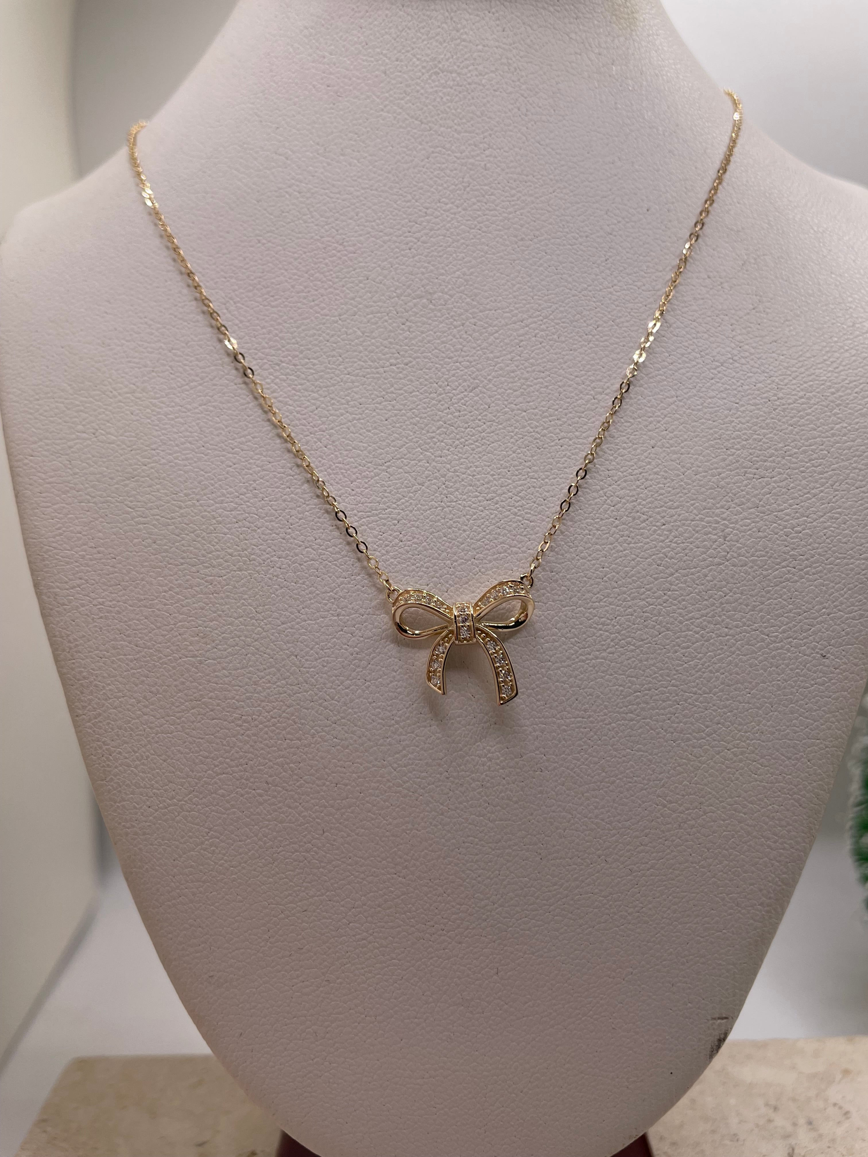 This 14k gold necklace features a delicate bow adorned with sparkling CZ stones, creating a dainty and elegant design. The adjustable chain allows you to wear it at 17 or 18 inches, making it versatile for any neckline. Perfect for adding a touch of charm and sophistication to your everyday look or gifting to someone special.