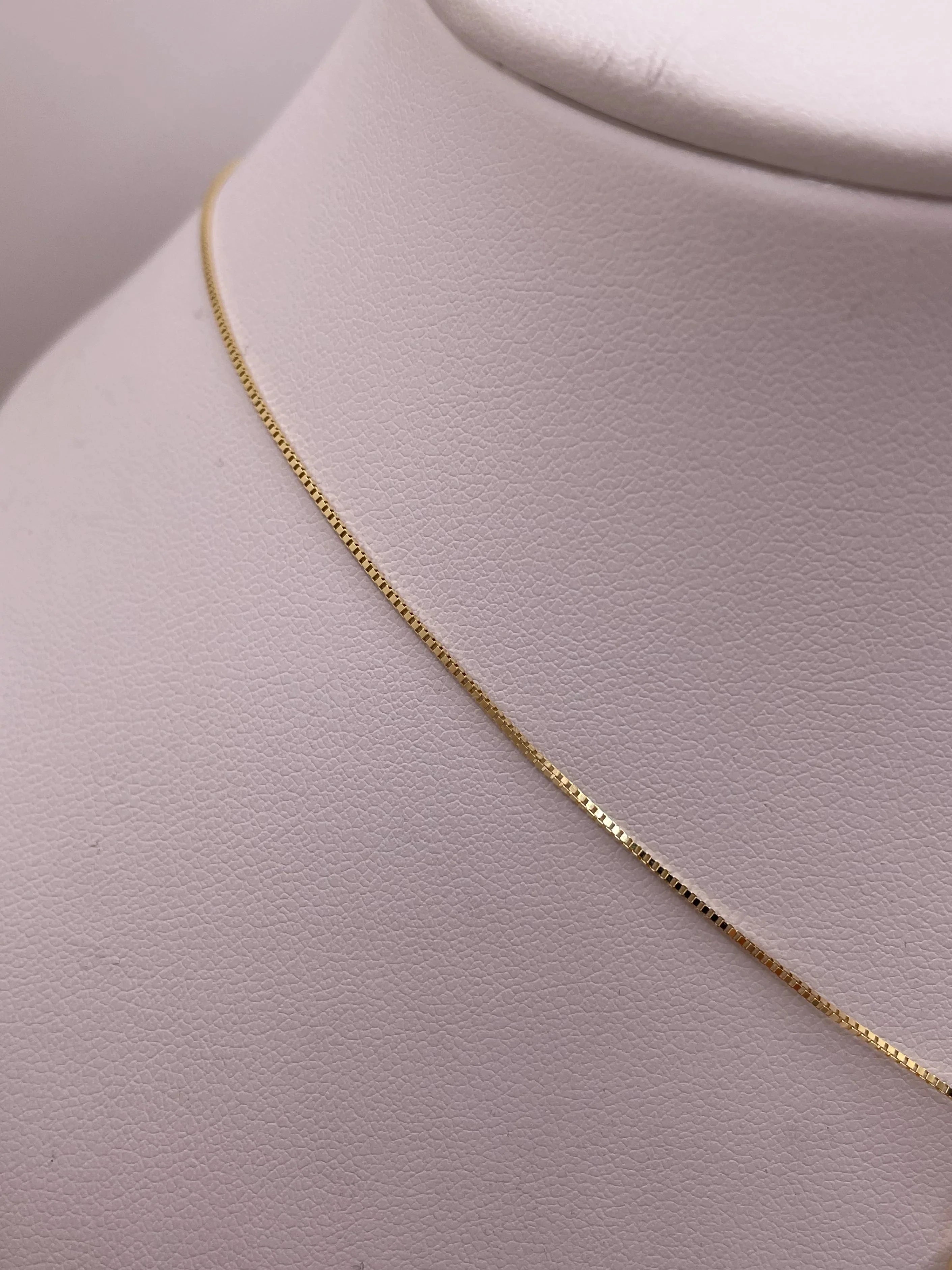 This 14K solid gold box chain features a sleek, square-link design that delivers a smooth, polished look with just the right amount of shine. Known for its durability and timeless appeal, the box chain is perfect for everyday wear—whether worn on its own for a minimal look or paired with your favorite pendant.