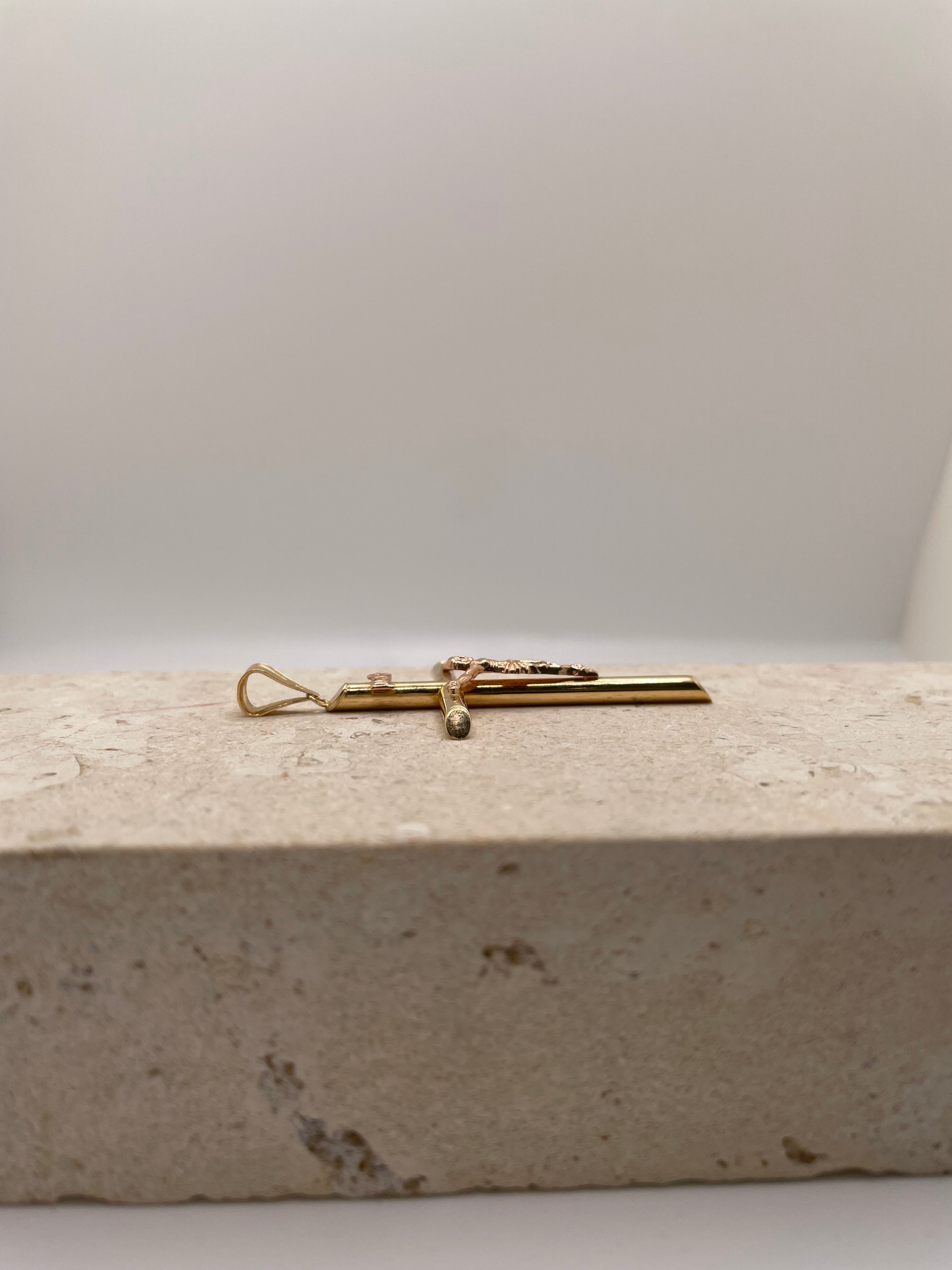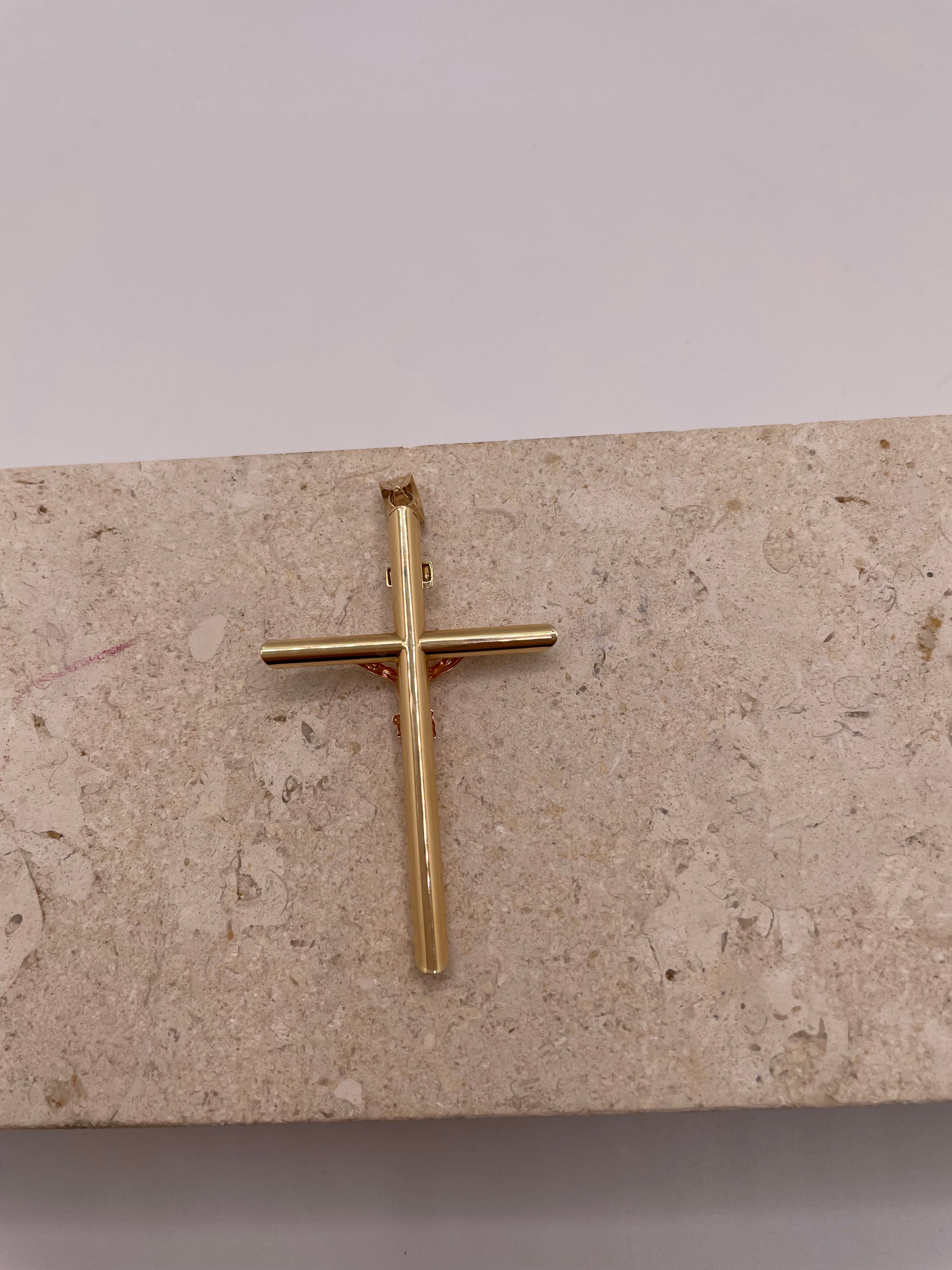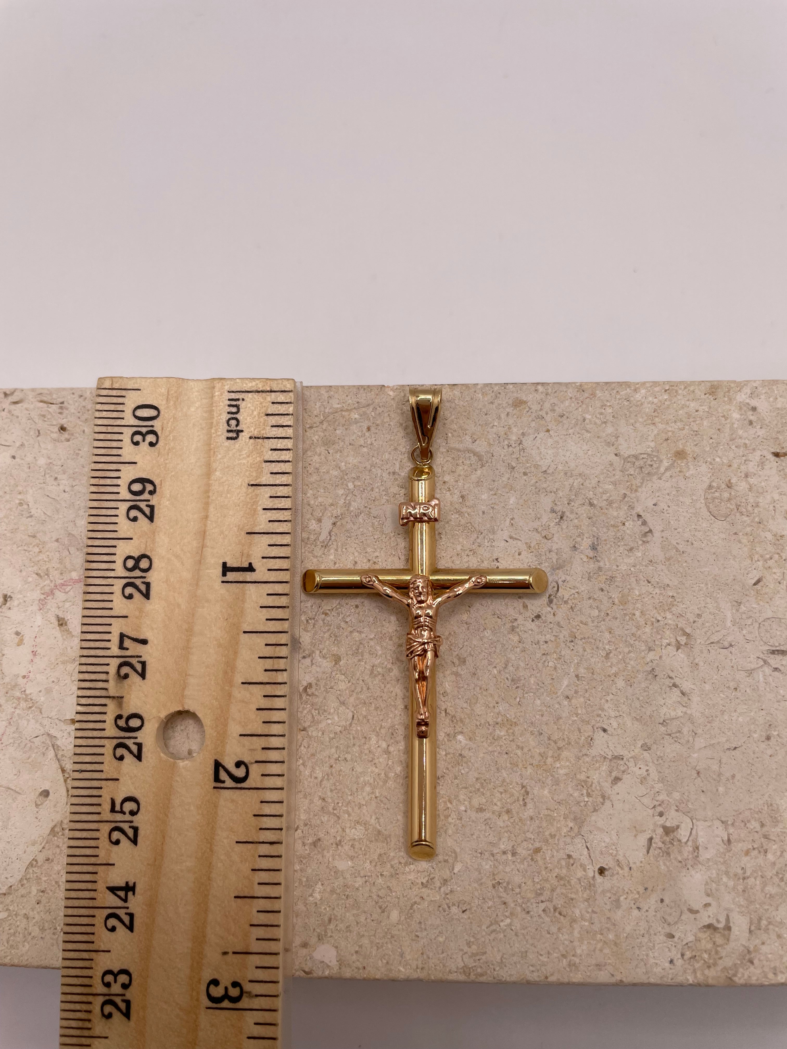 This stunning 14k gold classic tube cross features a beautifully detailed Jesus crucifix in rose gold. The combination of yellow and rose gold gives this pendant a timeless and elegant look, perfect for any occasion. Measuring 55 mm in height and 30 mm in width, this piece is both striking and meaningful.