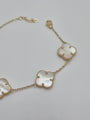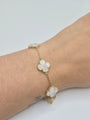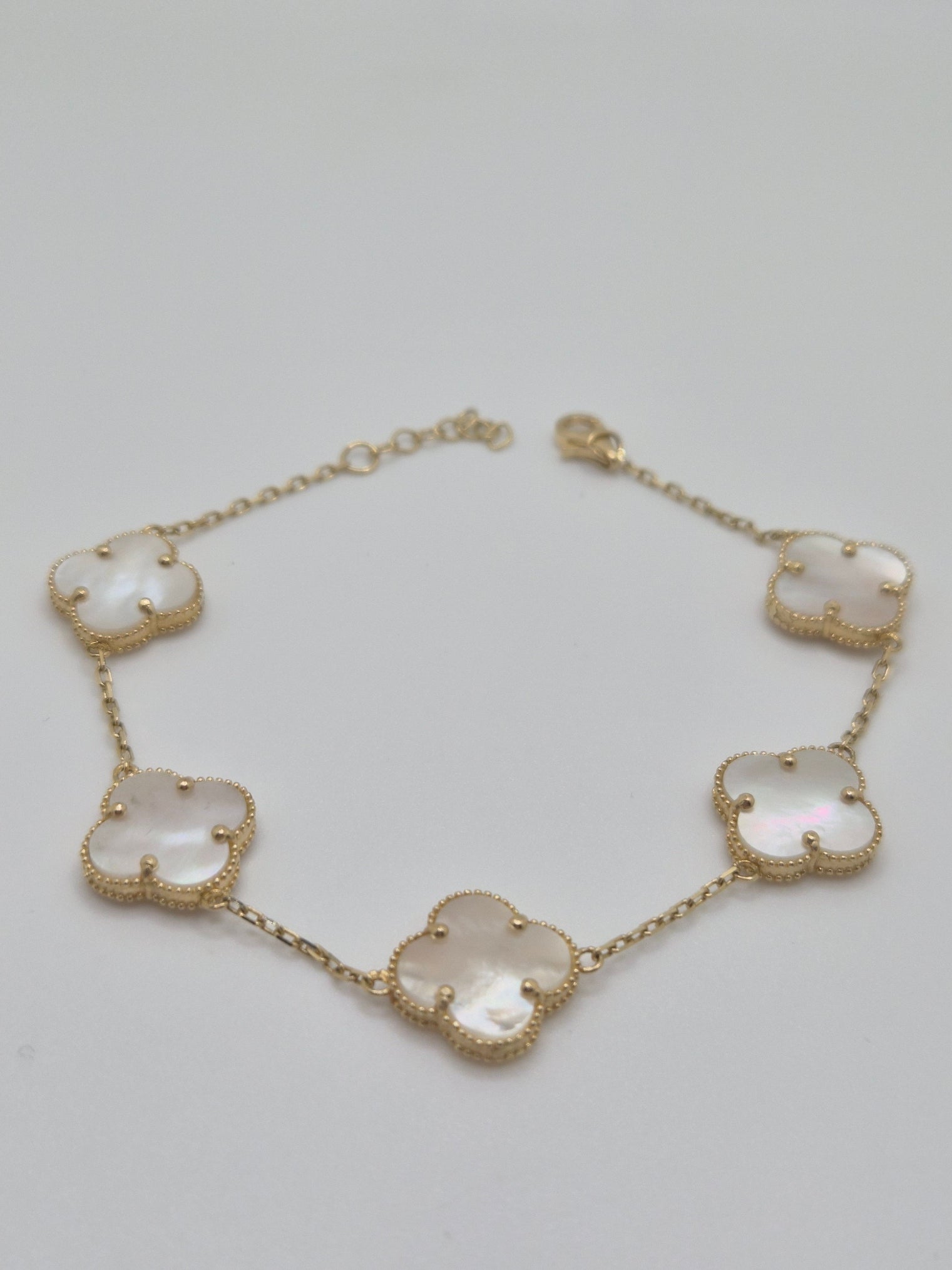 This 14K gold bracelet showcases delicate clover motifs set with shimmering mother of pearl inlay, finished with a fine beaded gold border. The soft iridescence of the inlay catches the light beautifully, making it a chic and timeless piece that elevates any jewelry collection.