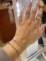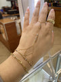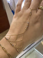 Item Description: This delicate hand chain is crafted in 14K solid gold, featuring a graceful design with tri-color beads in yellow gold, white gold, and rose gold. The "ring" fits up to size 11, and the wrist size is 6.5 inches, making it a perfect fit for most. It adds a sophisticated touch to any outfit, offering a unique blend of gold hues for an elegant look.