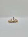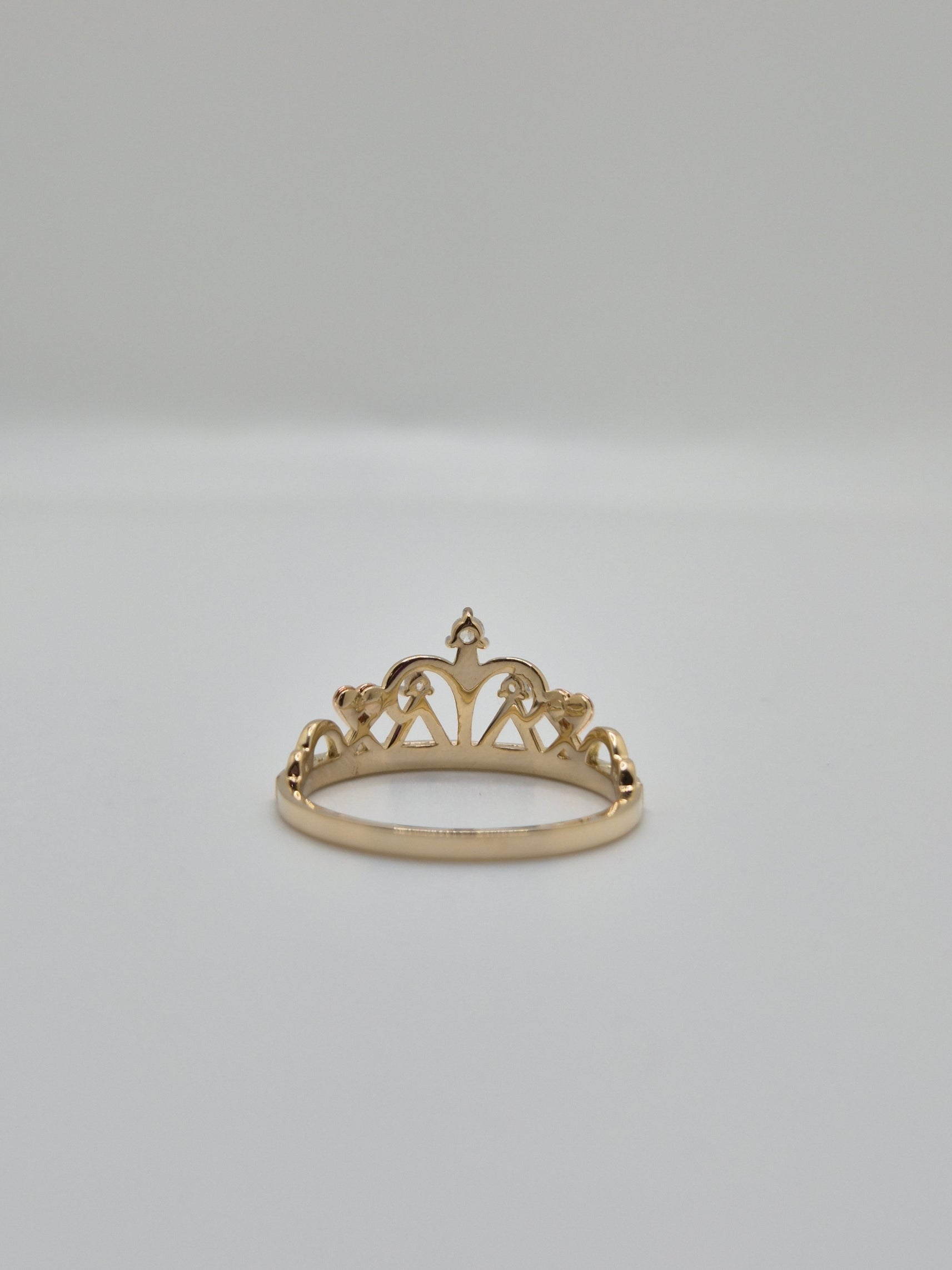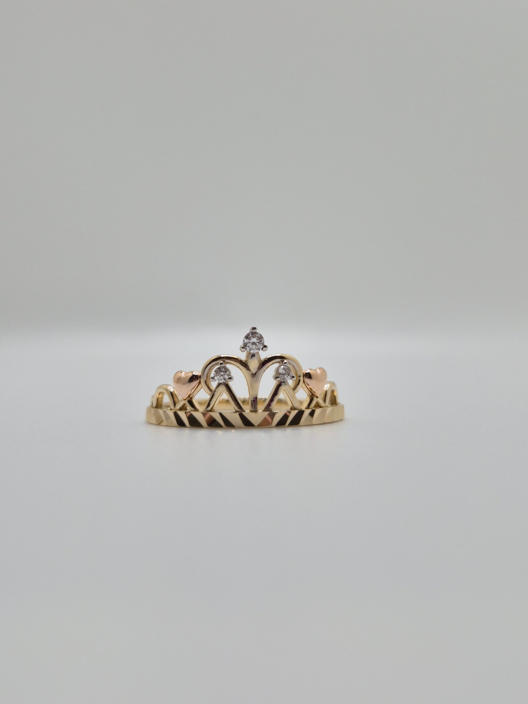 This 14K yellow gold ring features a delicate crown-inspired design accented with sparkling cubic zirconia and dainty rose gold hearts. The polished band and detailed cutwork give it a regal yet playful look, perfect for adding charm to any jewelry collection. Lightweight and elegant, it’s a beautiful piece for everyday wear or as a special gift.