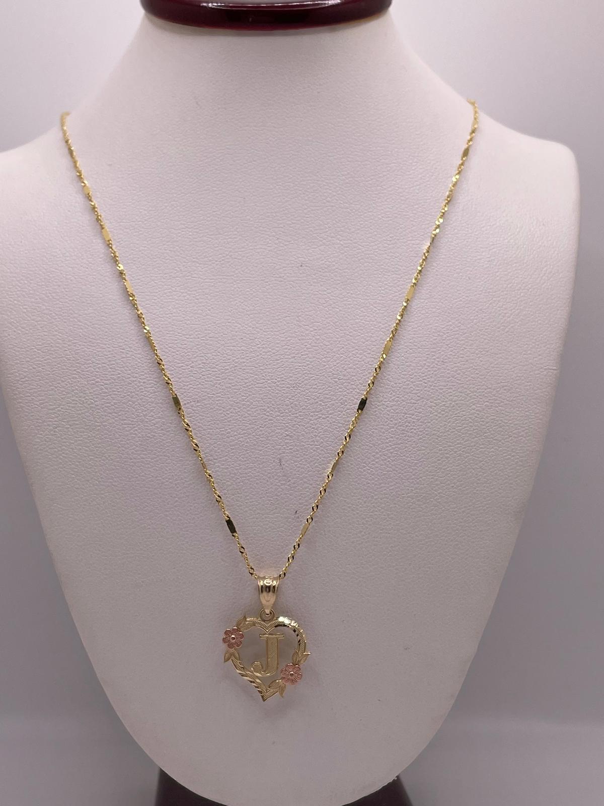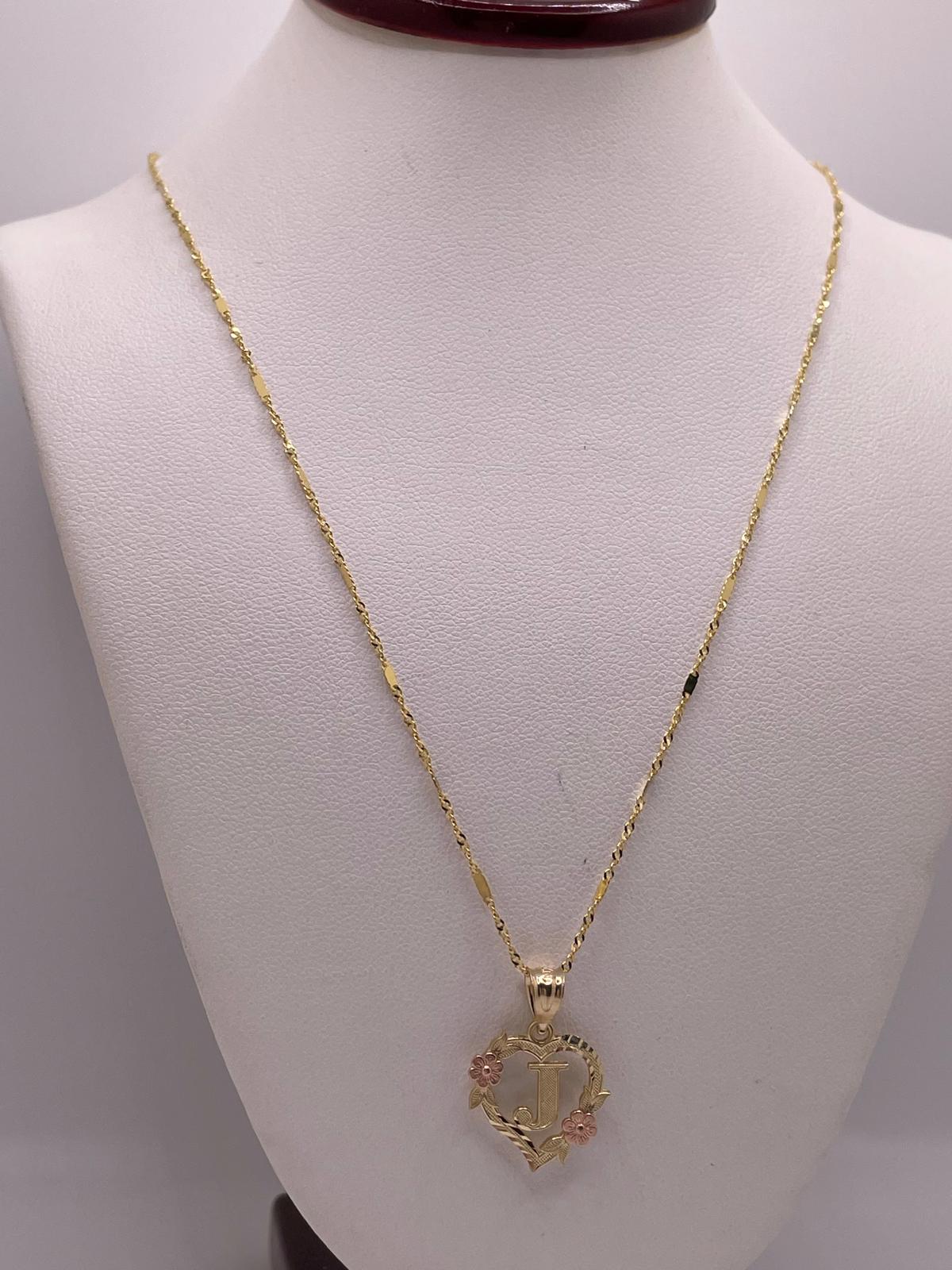 This stunning set includes a personalized 14K gold heart-shaped pendant and a dainty 1.3mm Singapore chain. The pendant features a capital initial in the center, framed by intricate detailing and two delicate rose gold flowers for an extra touch of elegance and charm. Paired with our twisted bar-style Singapore chain, this set catches the light beautifully and adds a timeless sparkle to any look.