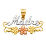 Our Flores Para Mamá pendant is a stunning tri-color design made to celebrate the heart of the family. The word Madre shines in white gold script, surrounded by yellow and rose gold flowers with delicate swirl detailing — a floral tribute that’s as timeless as her love.