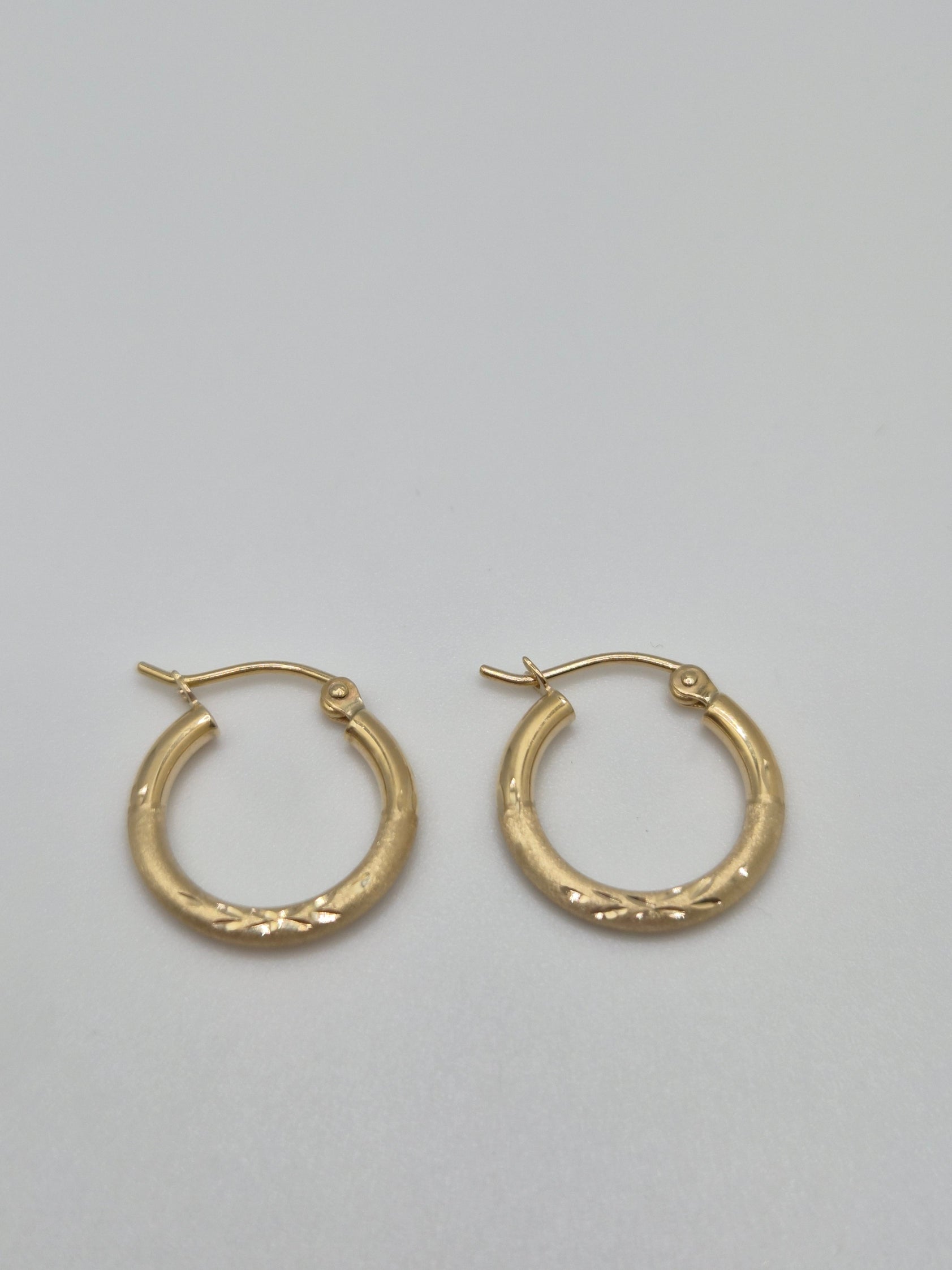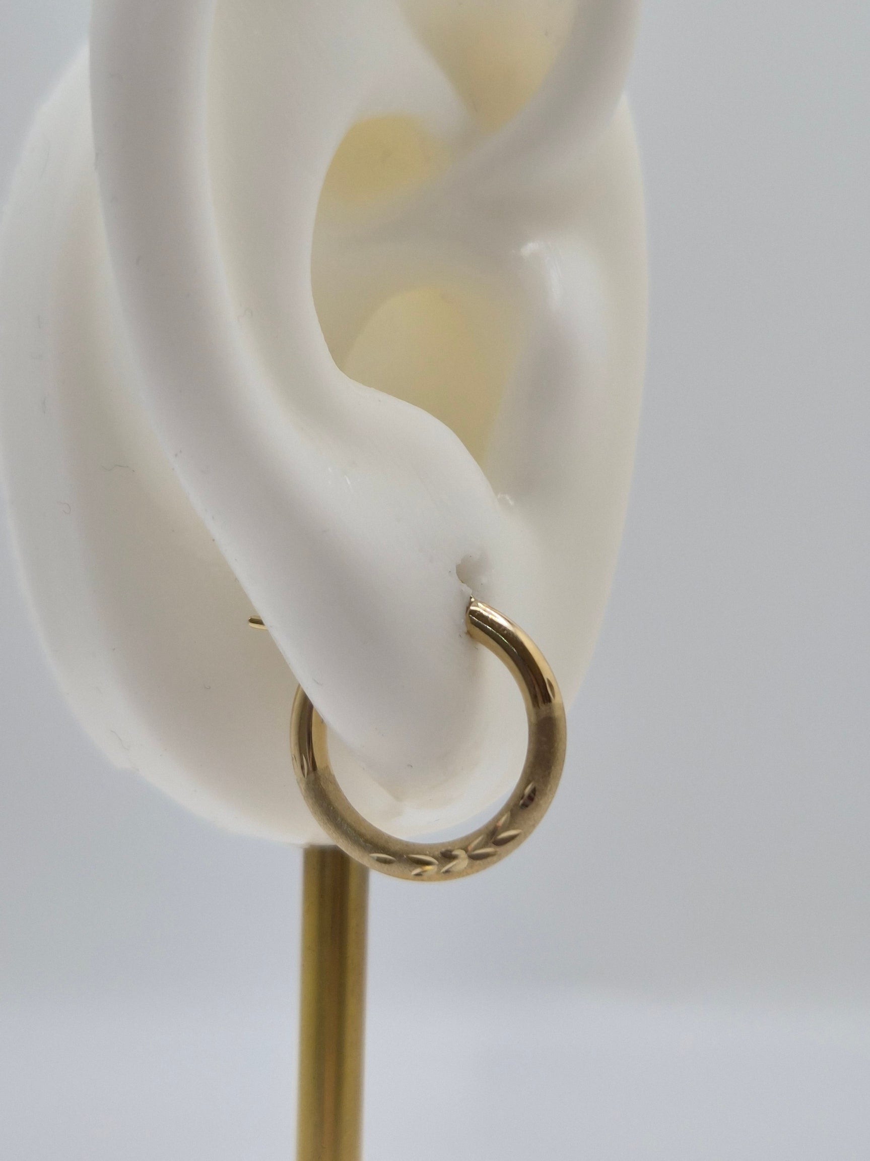 A dainty twist on a classic, these petite round hoops feature a beautiful textured finish with subtle diamond-cut budded detailing along the front. Crafted in real 14K yellow gold, they're the perfect everyday hoop for a touch of shine without overpowering your look.