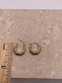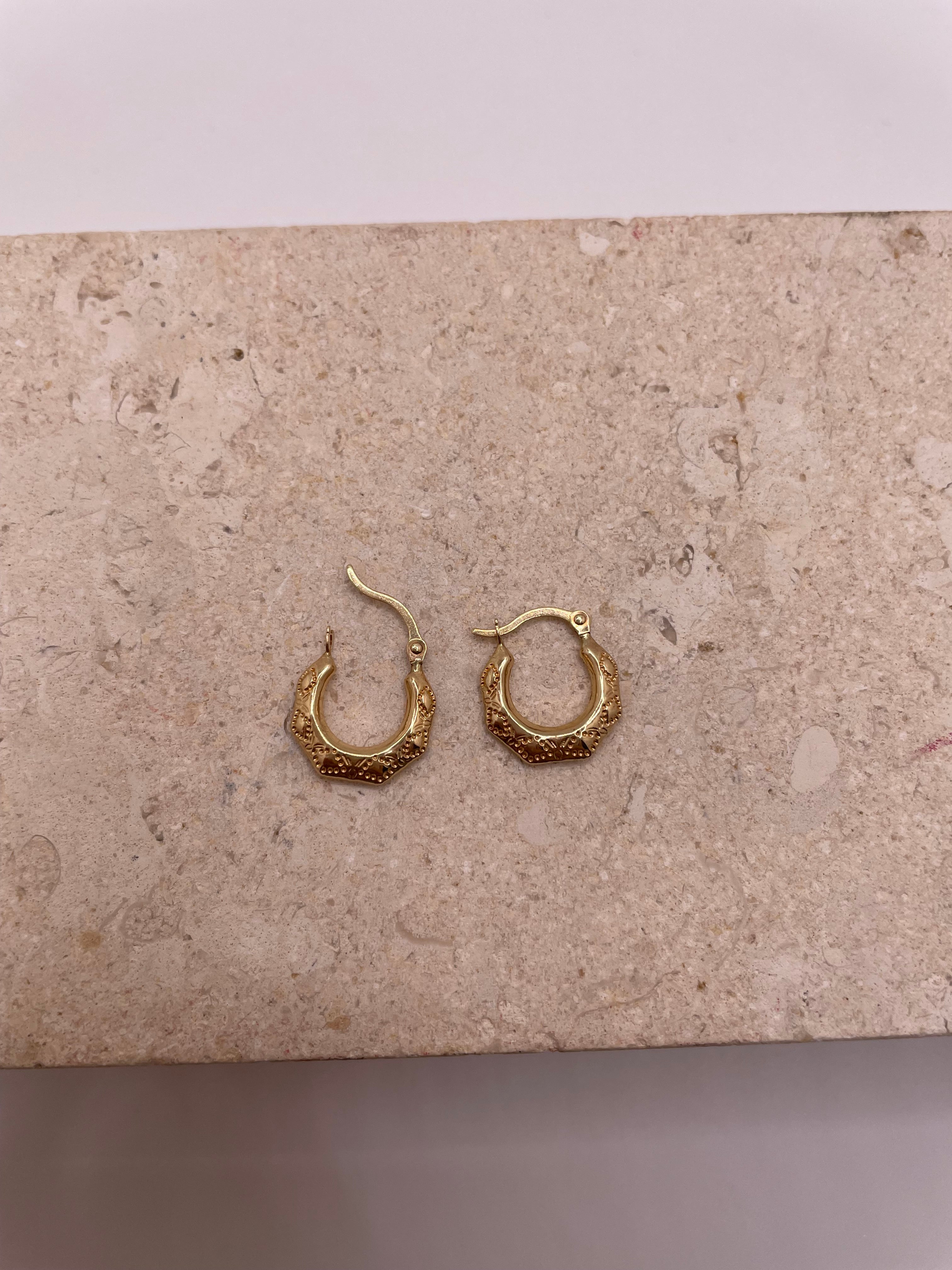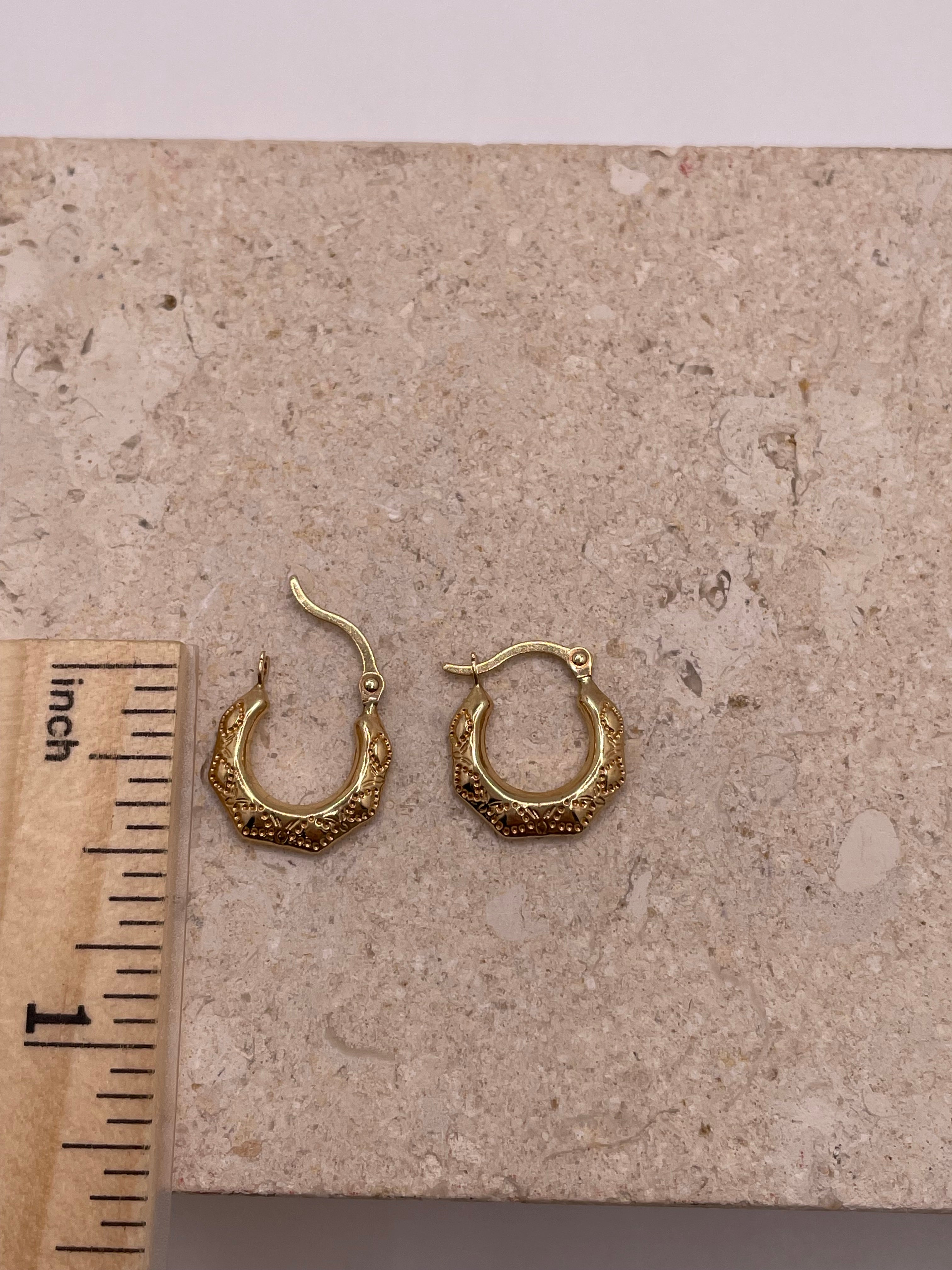 Petite and elegant, these 14K yellow gold fancy hoop earrings feature a unique engraved texture that adds a soft shimmer from every angle. Their lightweight, hollow design makes them extra comfortable — perfect for everyday wear.