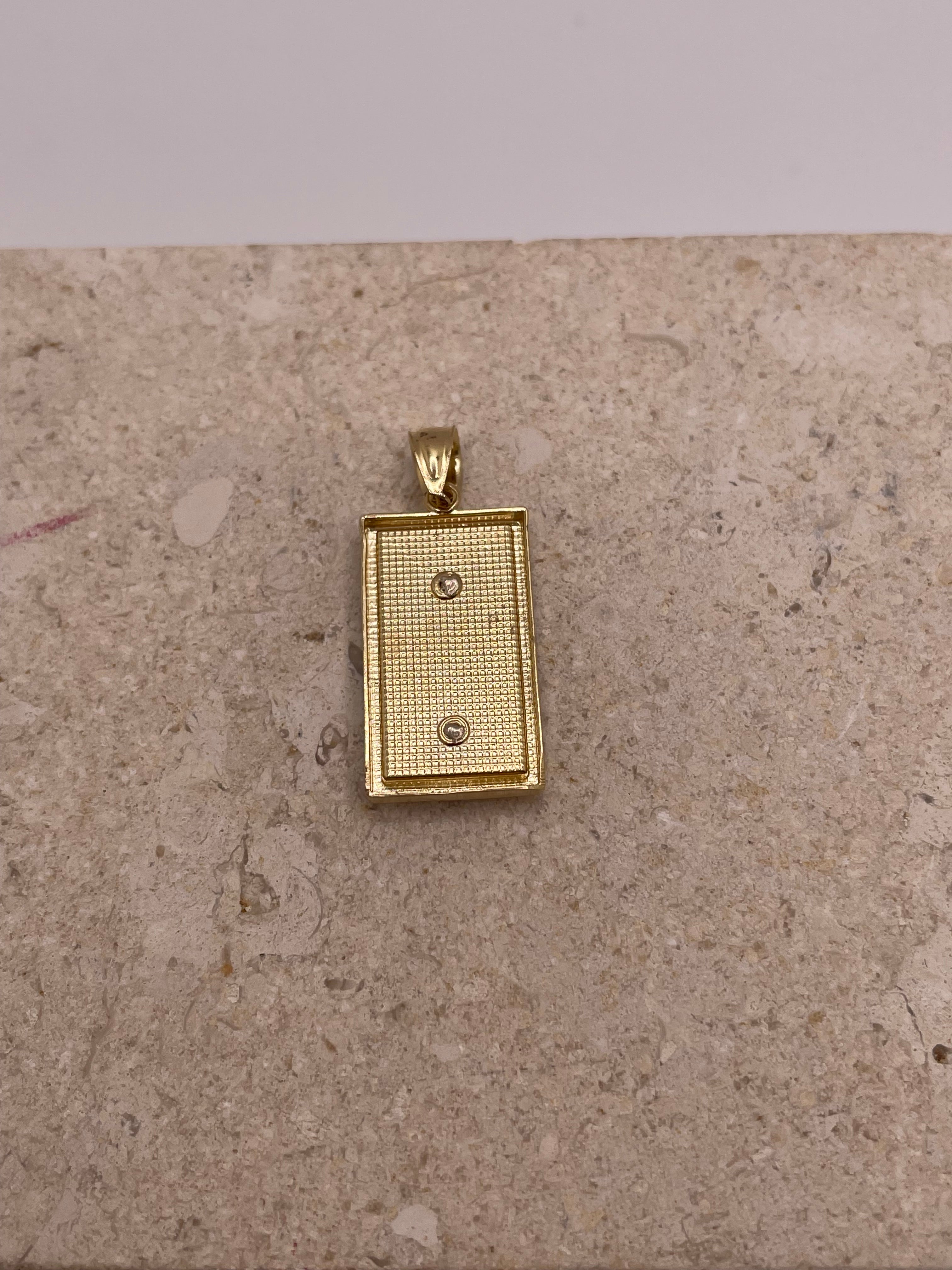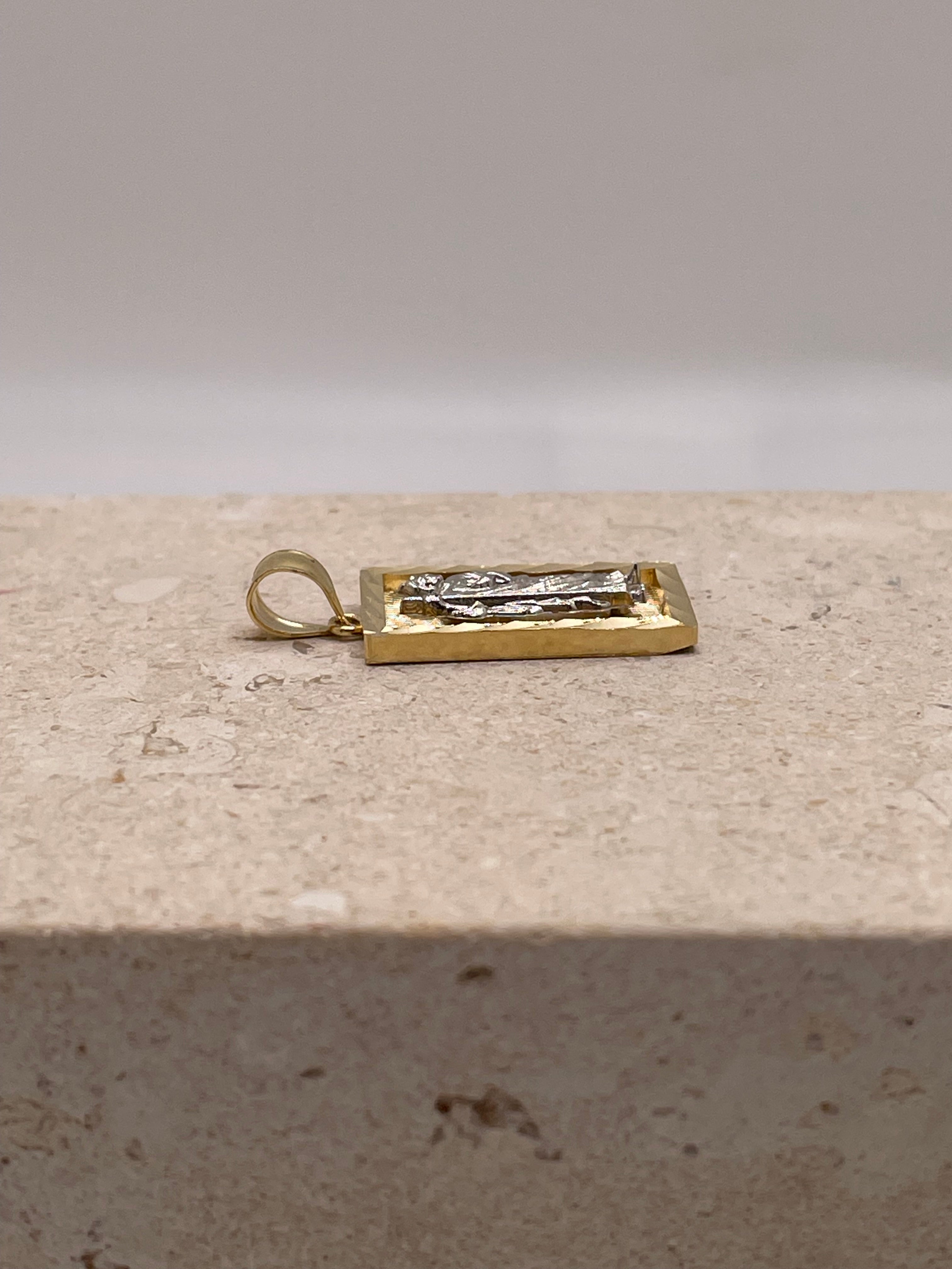 This stunning 14K two-tone gold San Judas pendant combines timeless faith with elegant craftsmanship. Shaped like a rectangle with soft edges, it features a beautifully detailed depiction of San Judas in contrasting gold tones. The border is adorned with a diamond-cut design that adds a radiant sparkle, catching the light with every movement.