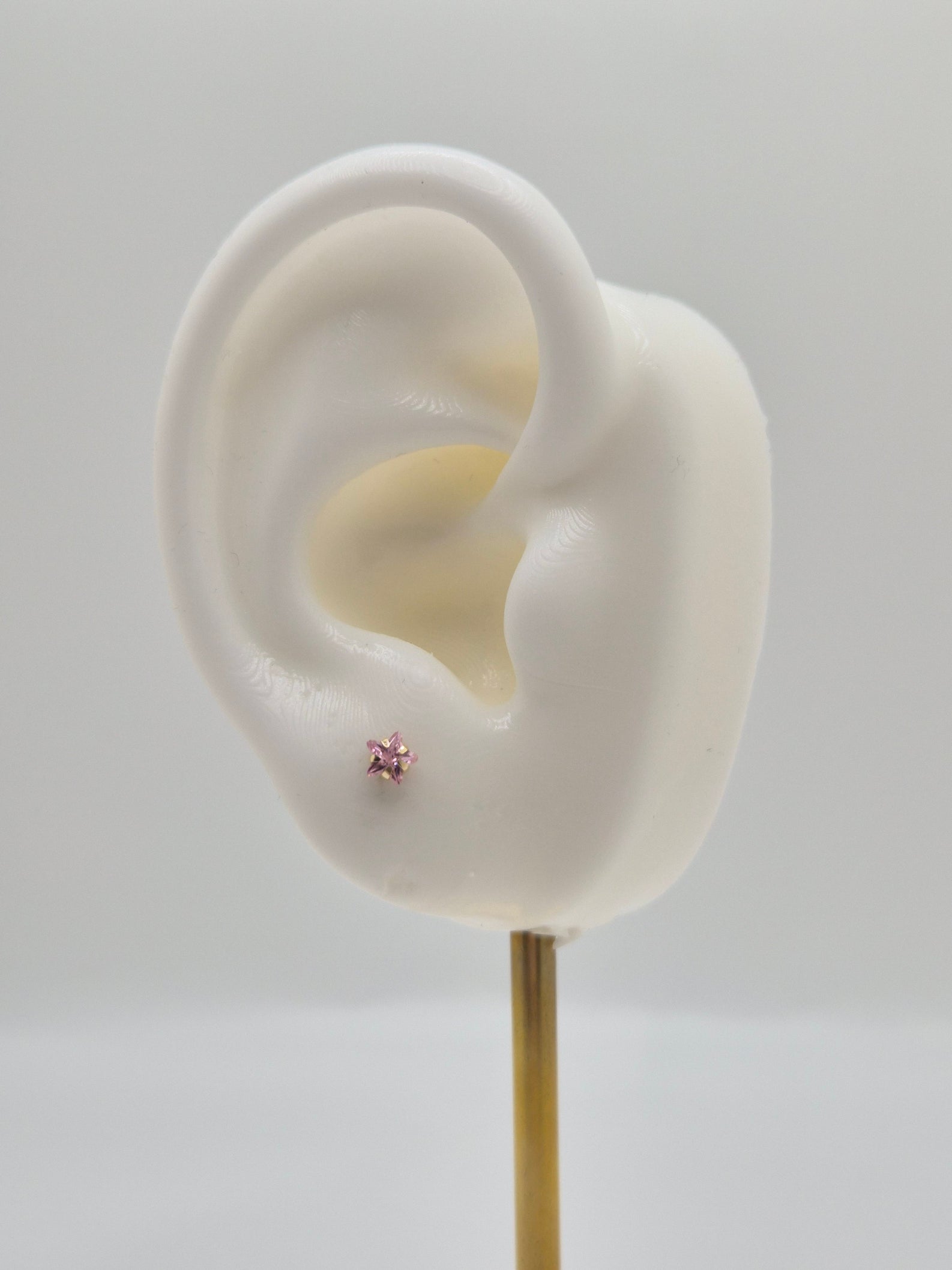 Add a touch of sparkle with these dainty 14K gold star stud earrings. Each pair features a 4mm cubic zirconia in your choice of pink or white, set in a secure peg head design. The screw-back closure offers both comfort and extra security, making them perfect for everyday wear or as a sweet gift.