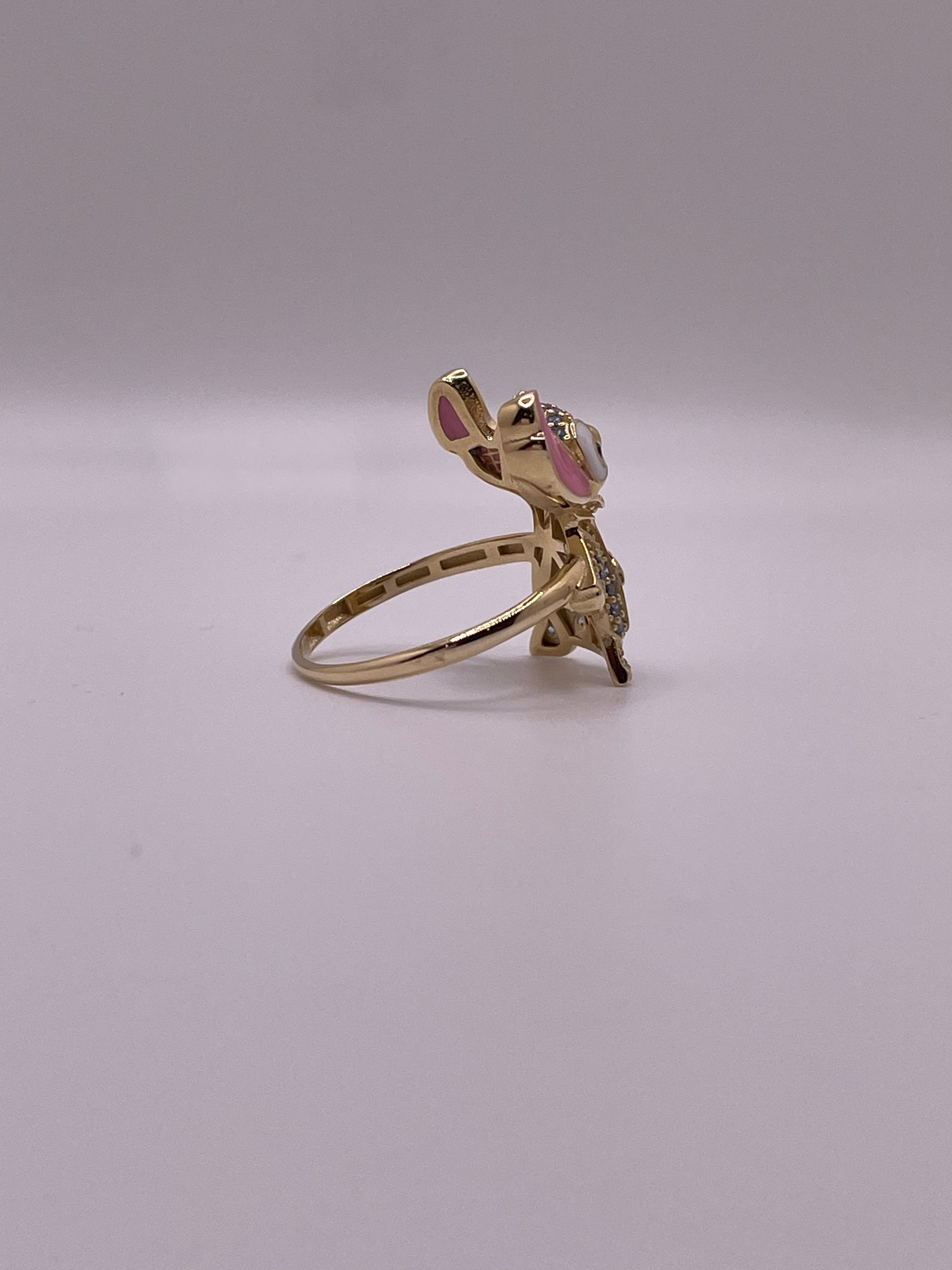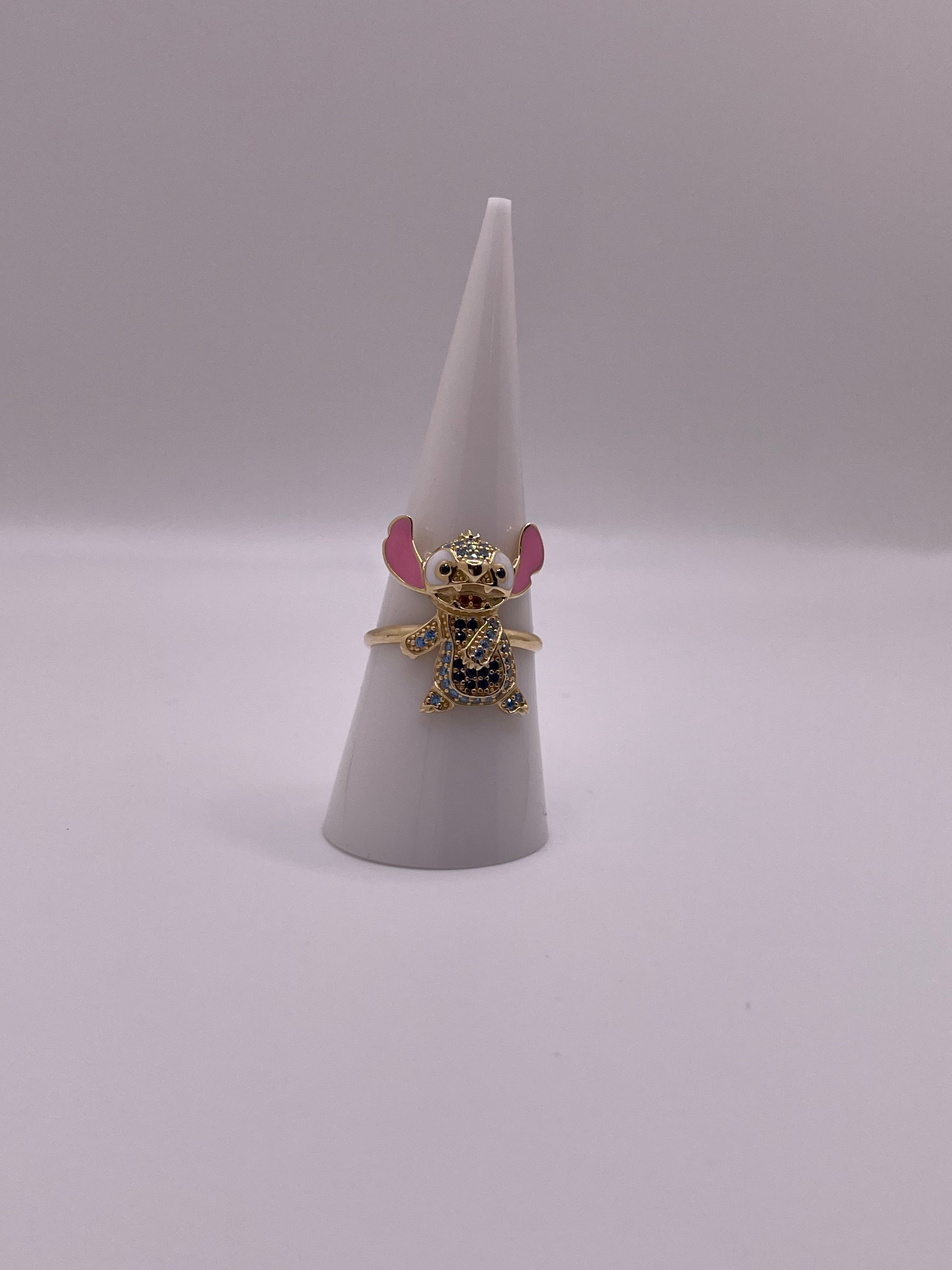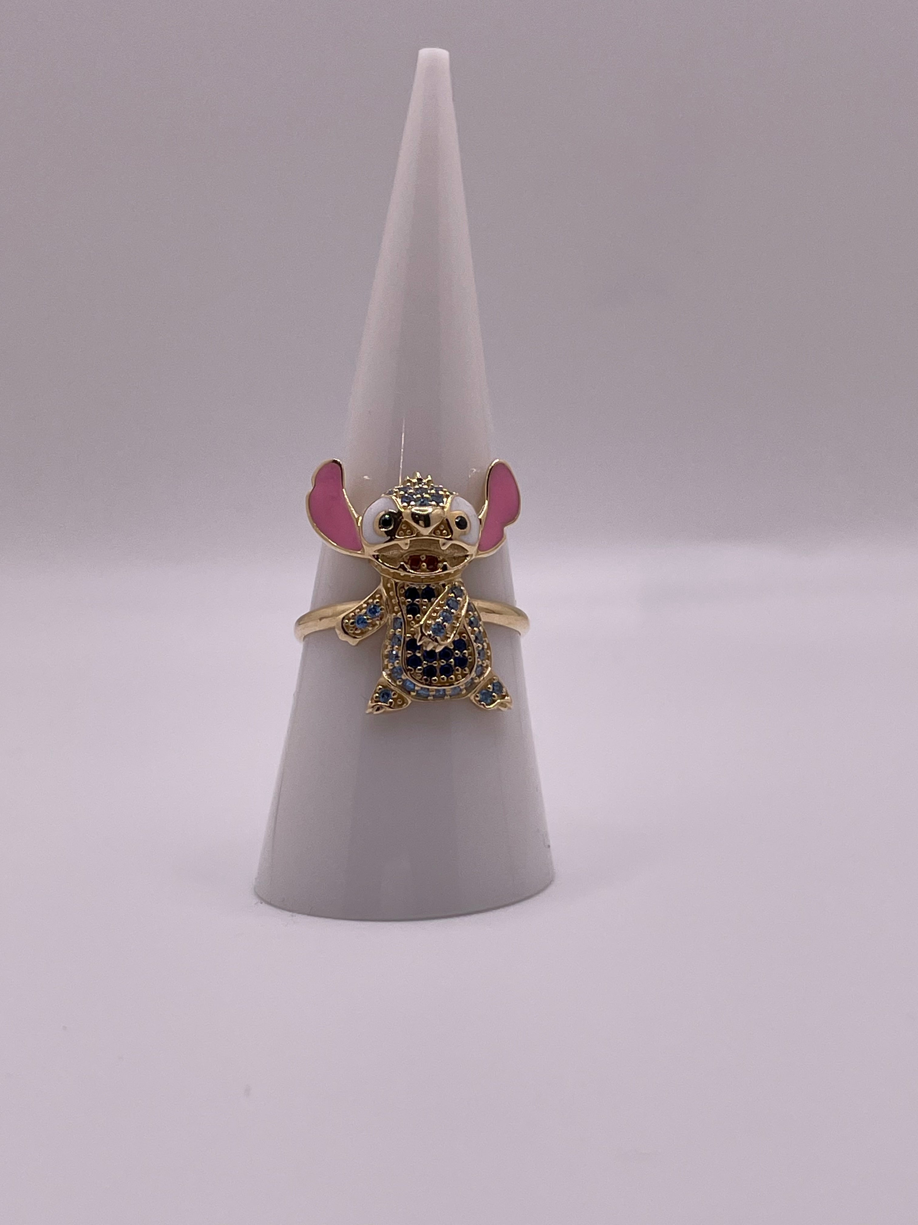 This playful 14K yellow gold ring features Stitch in all his sparkly glory — complete with deep blue cubic zirconia stones, pink enamel ears, and the cutest little smile. Crafted with attention to detail, this character ring is perfect for collectors, Disney lovers, or anyone who wants to carry a little chaos (and cuteness) wherever they go.