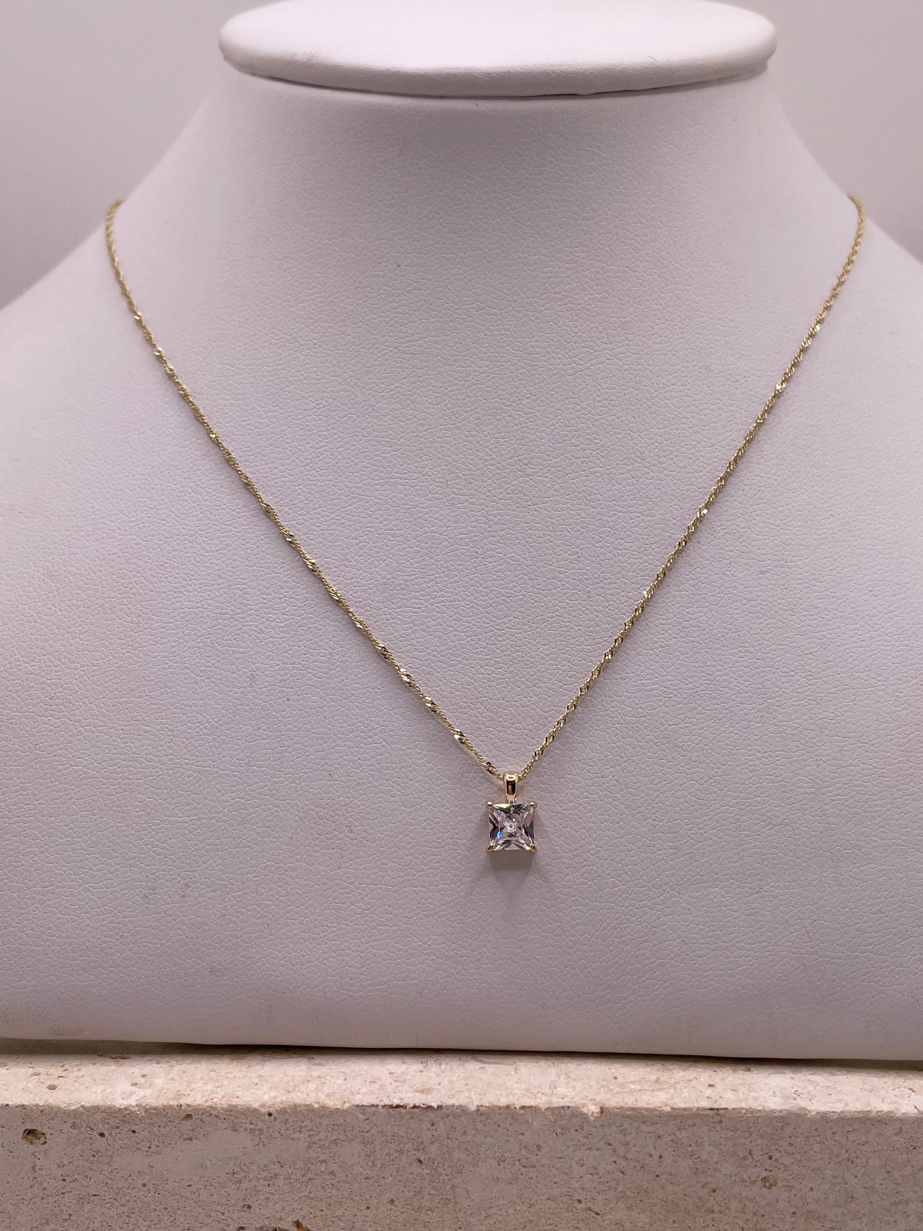 This 14K gold dainty Singapore necklace is the perfect blend of elegance and sophistication. Featuring a delicate 0.9mm twisted design, it catches the light beautifully, creating a stunning shimmer with every movement. Paired with a classic 5mm square CZ pendant, this set exudes timeless charm and effortless style. Whether worn alone or layered, it’s the perfect piece for adding a touch of sparkle to any look.