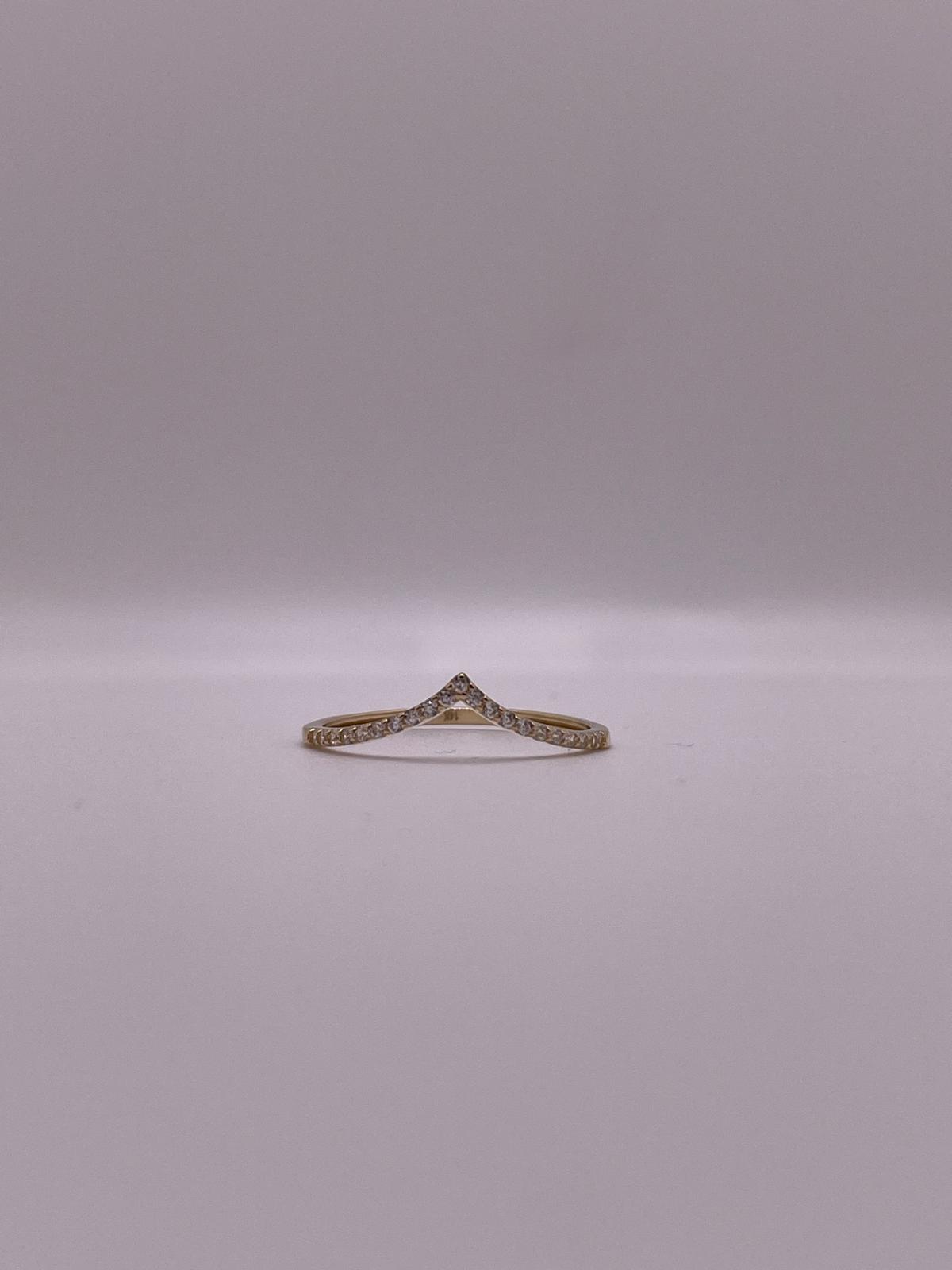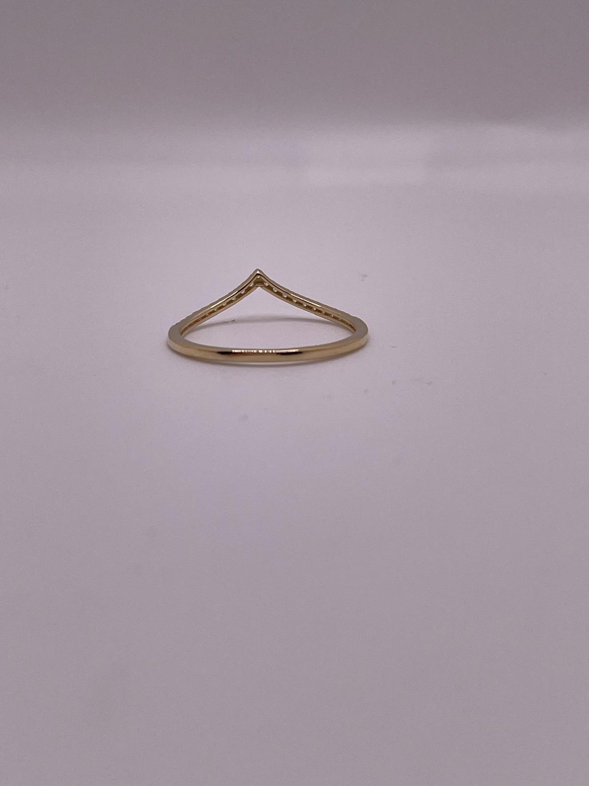This elegant V-curve ring features a delicate row of shimmering cubic zirconia stones set in 14K yellow gold. Its pointed chevron design makes it perfect for stacking or wearing as a dainty statement on its own. Whether you’re pairing it with other rings or letting it shine solo, this piece adds just the right amount of sparkle.