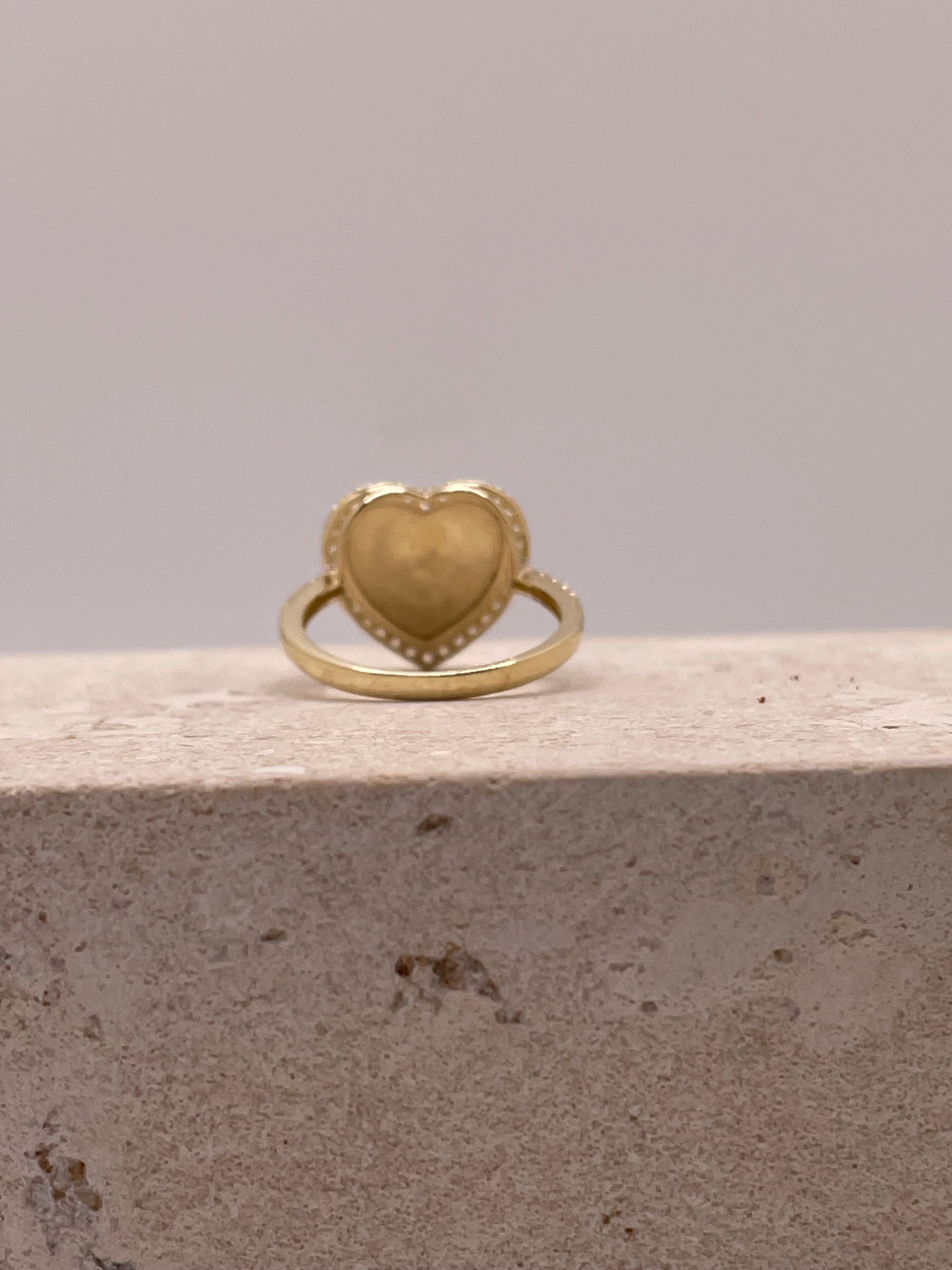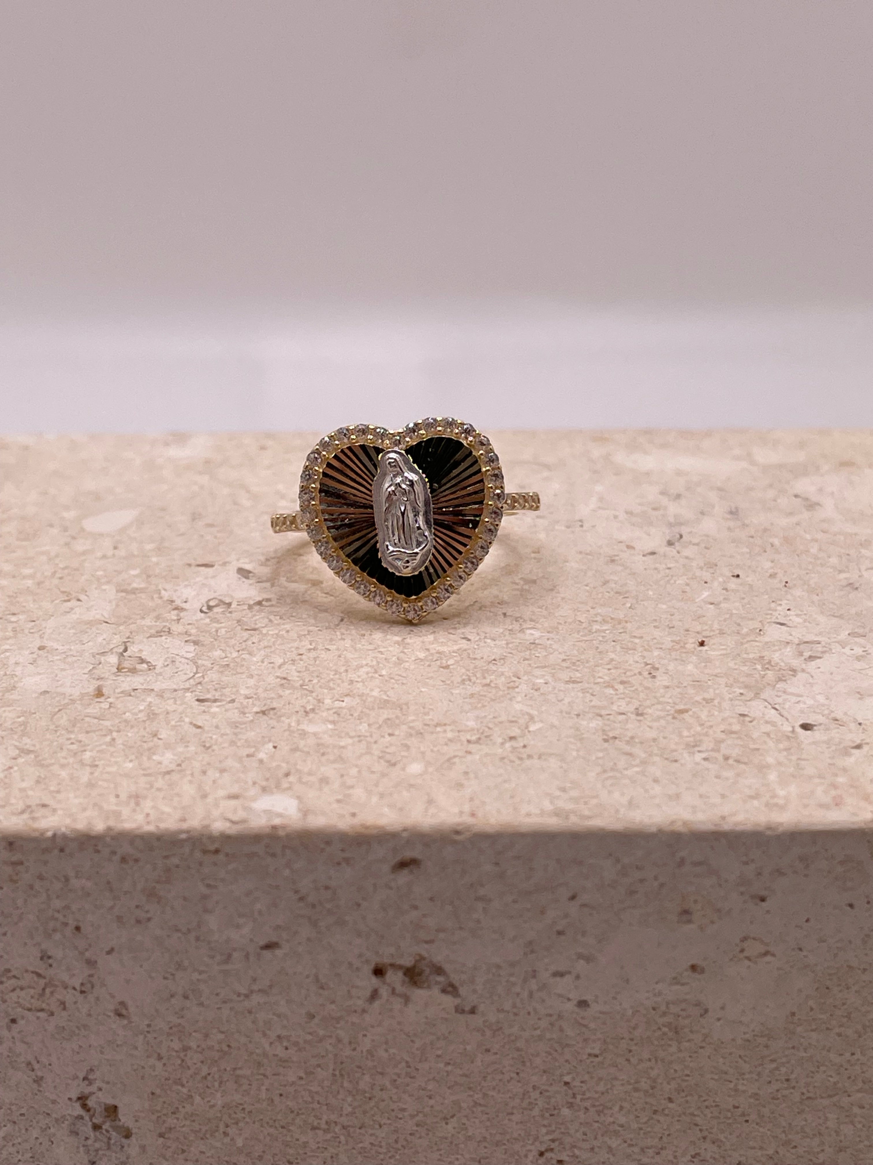 Adorn yourself with this breathtaking 14K gold ring featuring a large, beautifully crafted heart. The heart showcases an intricate diamond-cut design, with a detailed white gold depiction of the Virgencita (Virgin of Guadalupe) at its center. Surrounding the heart, shimmering white CZ stones add a radiant sparkle.