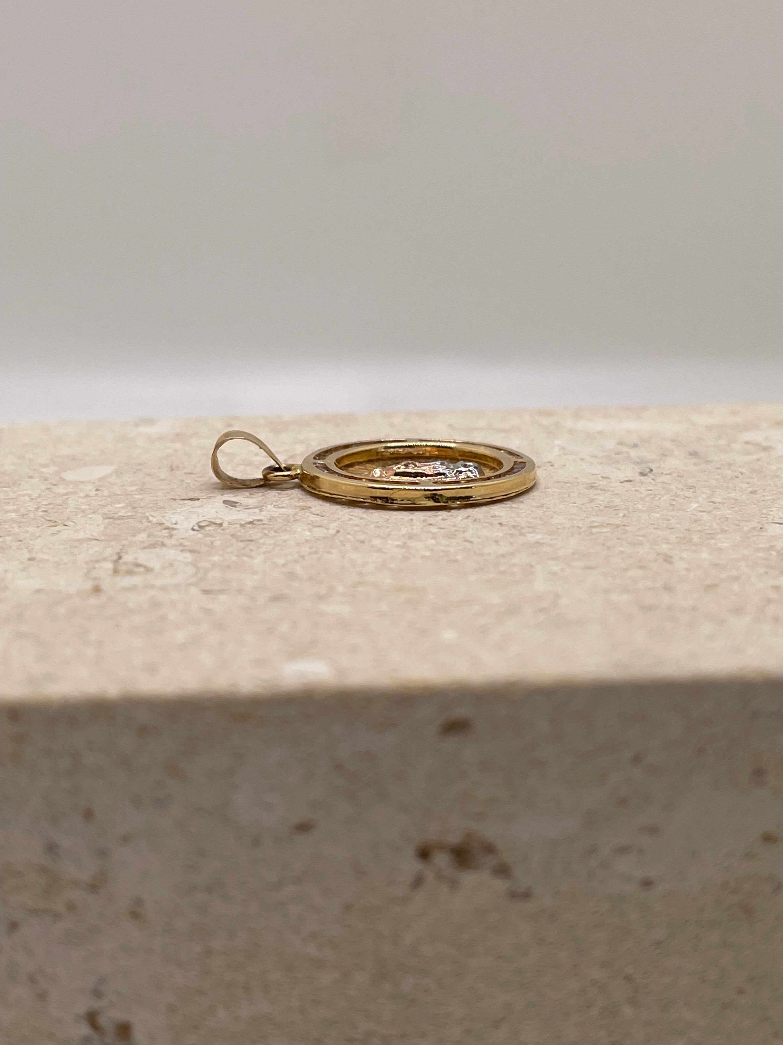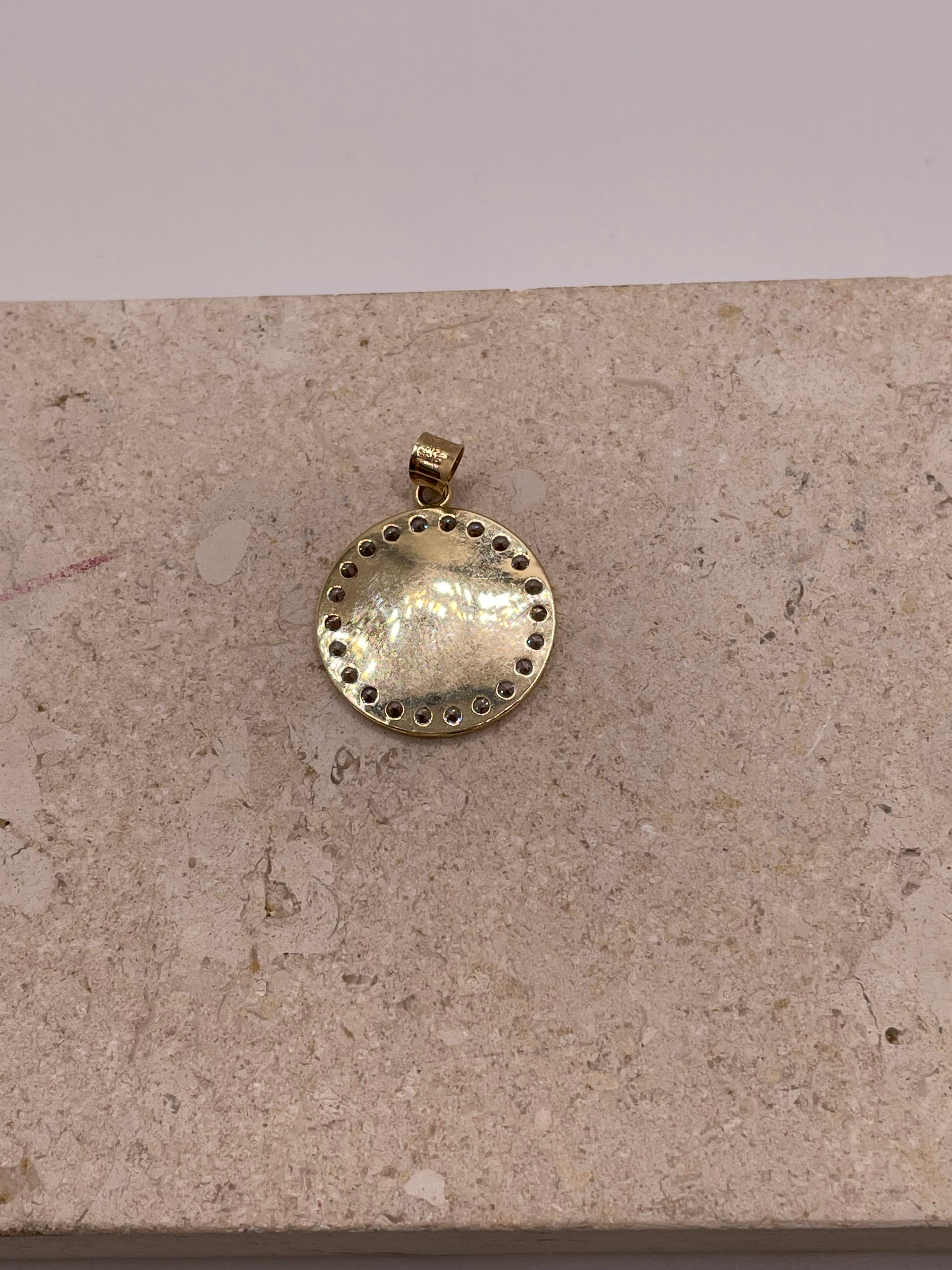 This elegant 14K yellow gold round pendant features a stunning cubic zirconia (CZ) border, encircling a beautiful design. At the center of the pendant is a delicate Virgencita (Virgin Mary), with half of the figure in white gold and the other half in rose gold, creating a beautiful contrast. Measuring approximately 1 inch, including the bail, this pendant is perfect for those seeking a meaningful and stylish piece of jewelry to wear every day.