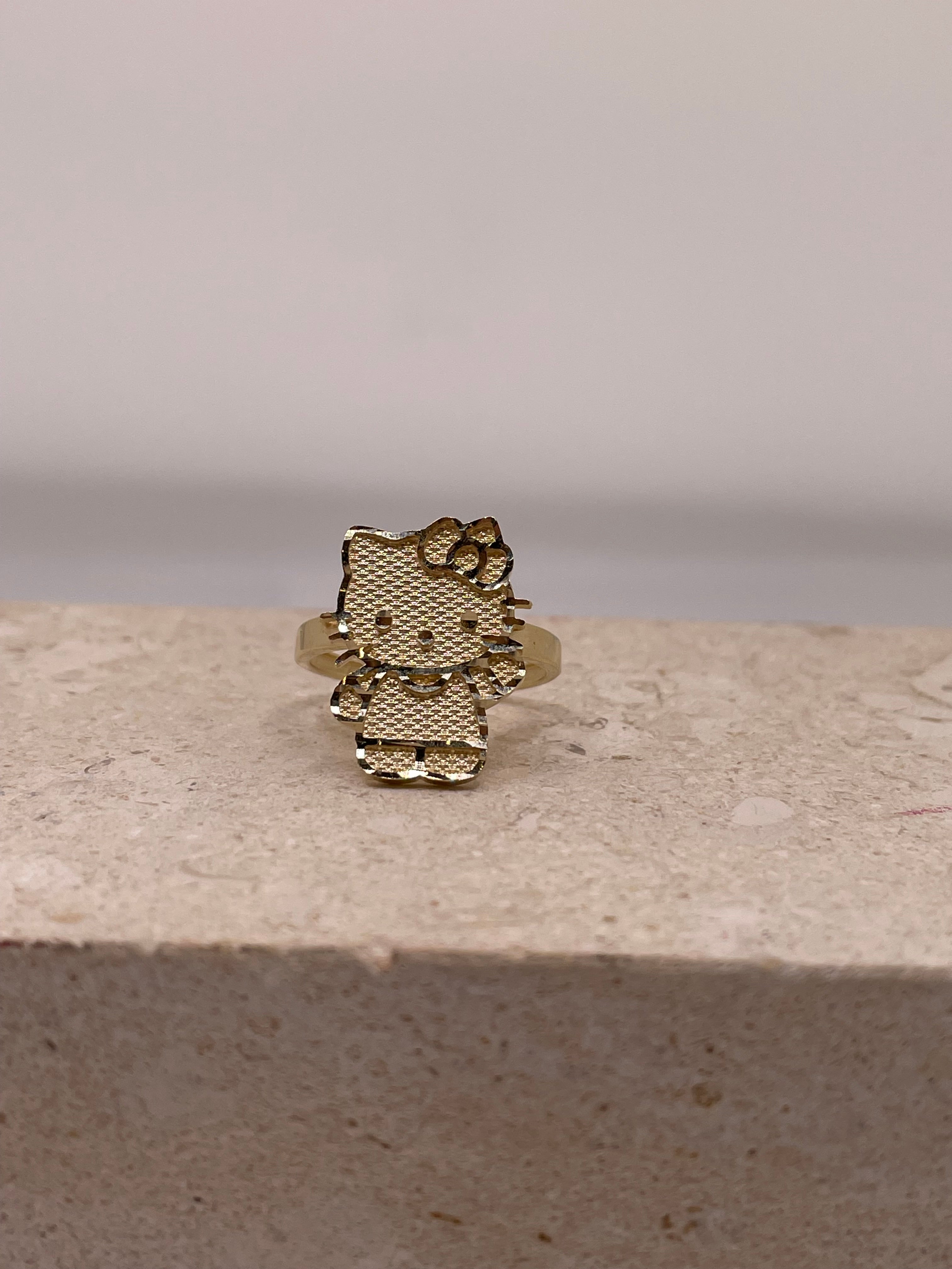 This 14K gold ring features Hello Kitty in a playful full-body waving pose, bringing extra charm to this adorable piece. Crafted entirely in gold, this ring is perfect for Hello Kitty collectors and those who love unique, eye-catching jewelry. Available in multiple sizes, this piece is both fun and stylish. For exact dimensions, please refer to the pictures. Don’t forget to check out our full Hello Kitty collection for more rings and pendants in different designs!