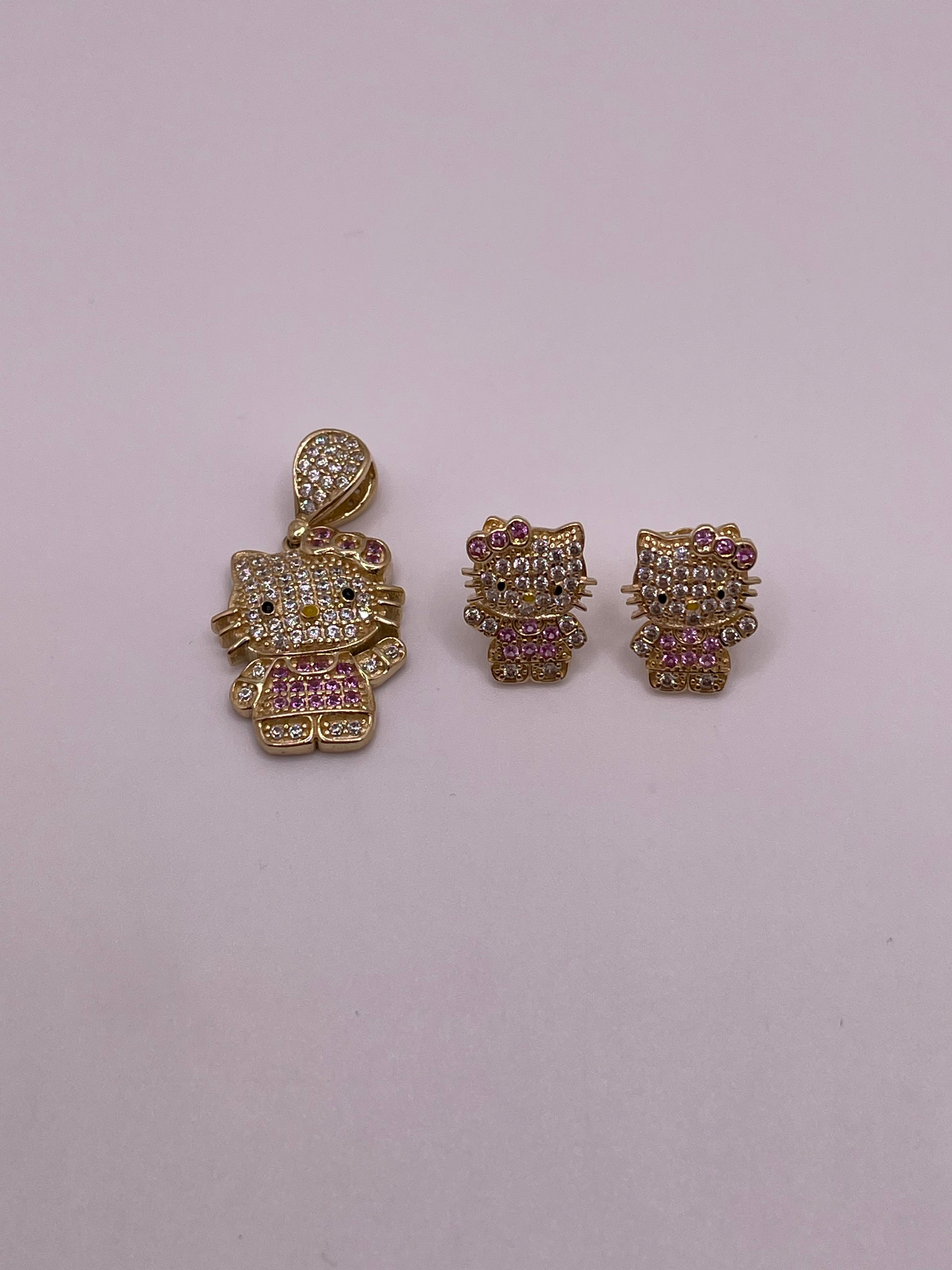 14K Hello Kitty Pendant & Earrings Set with Pink & White CZs