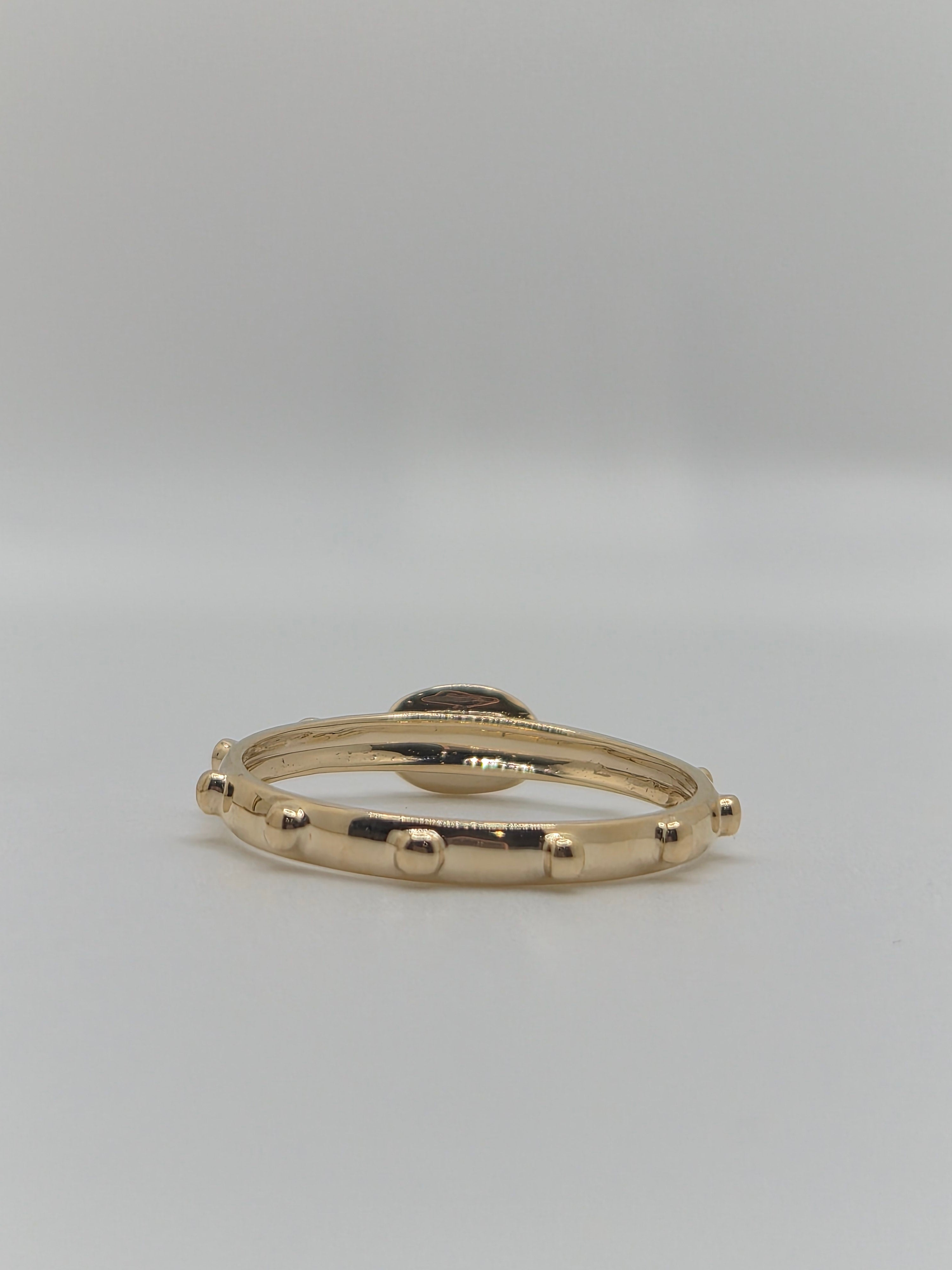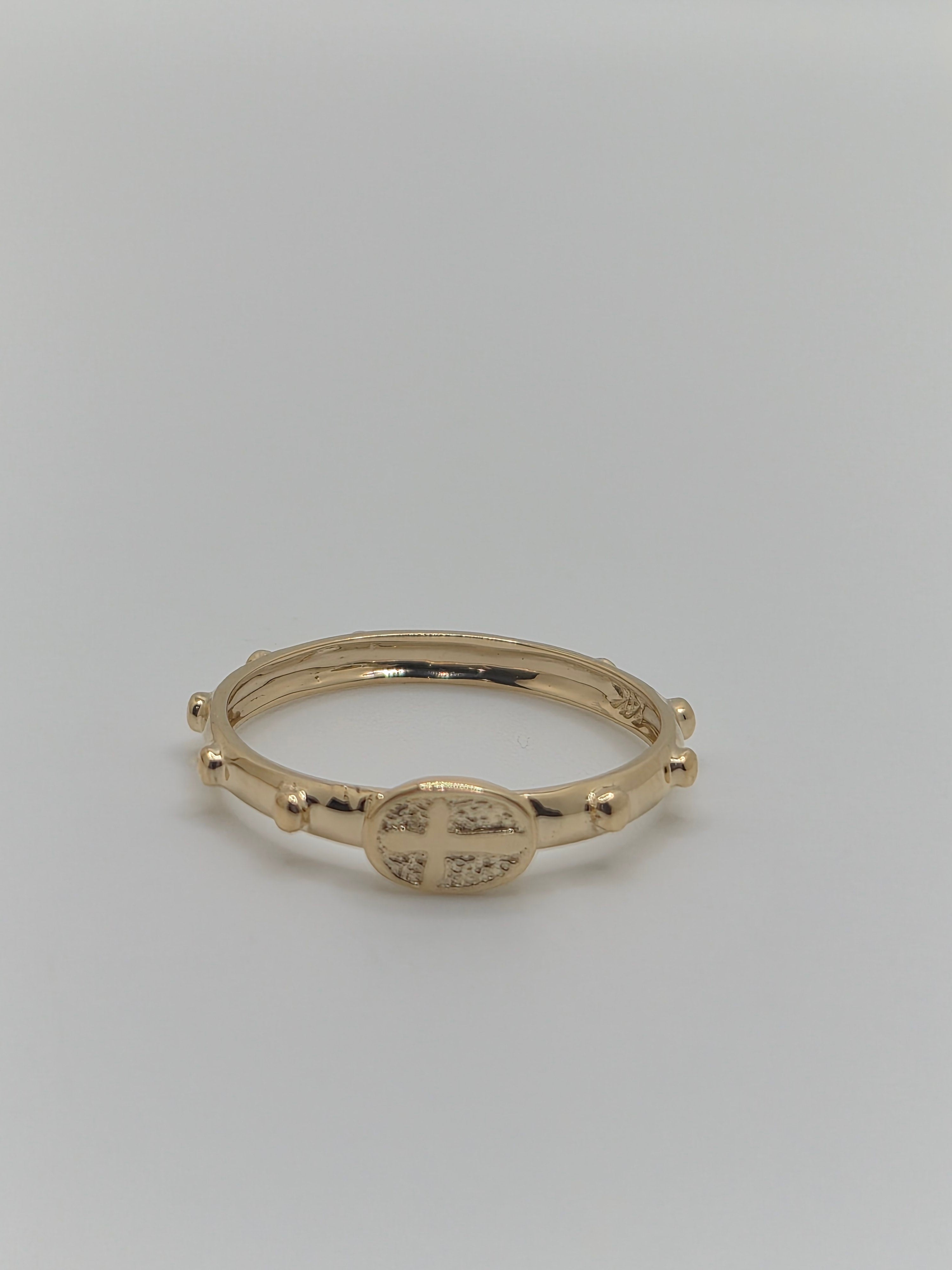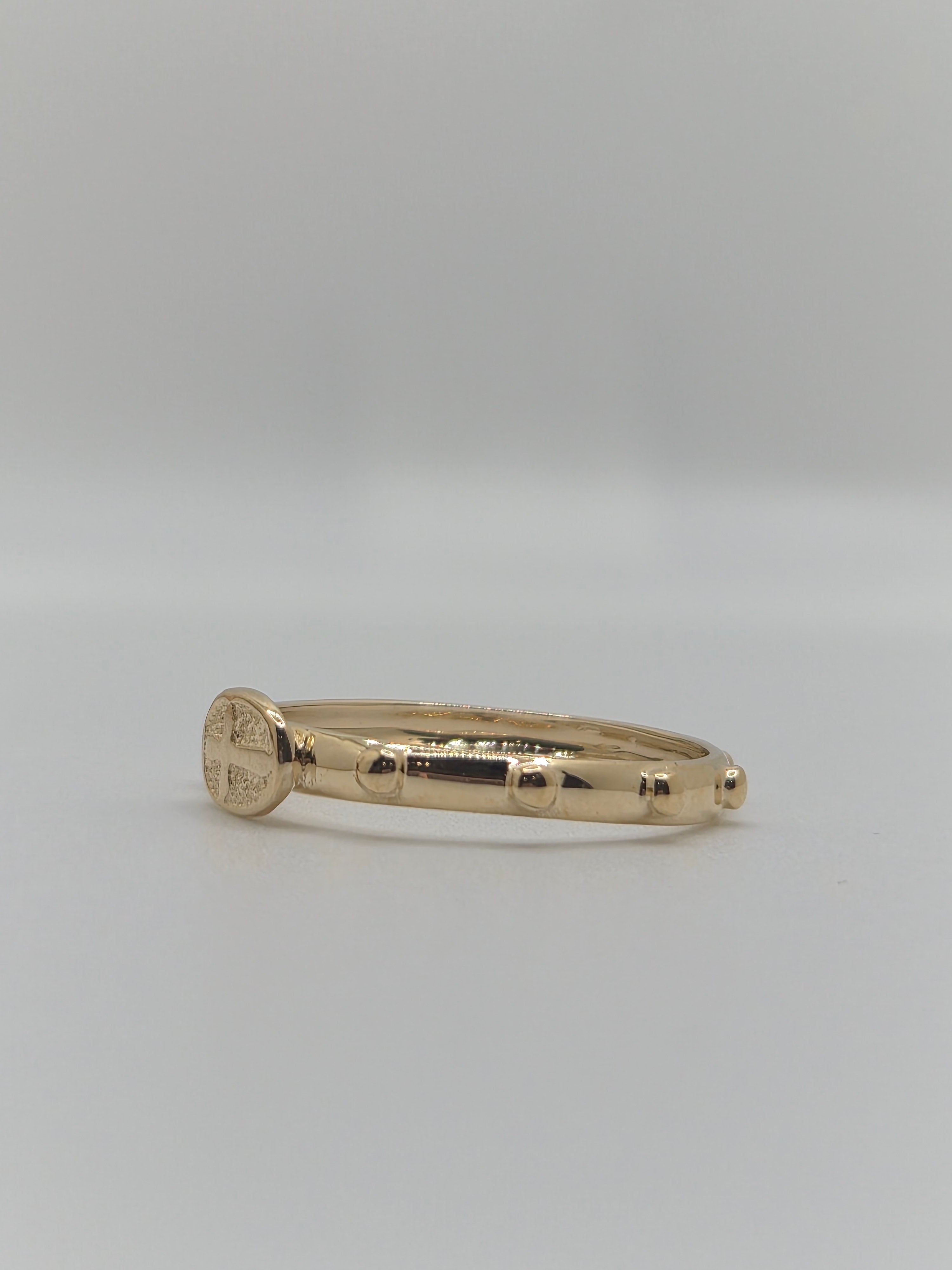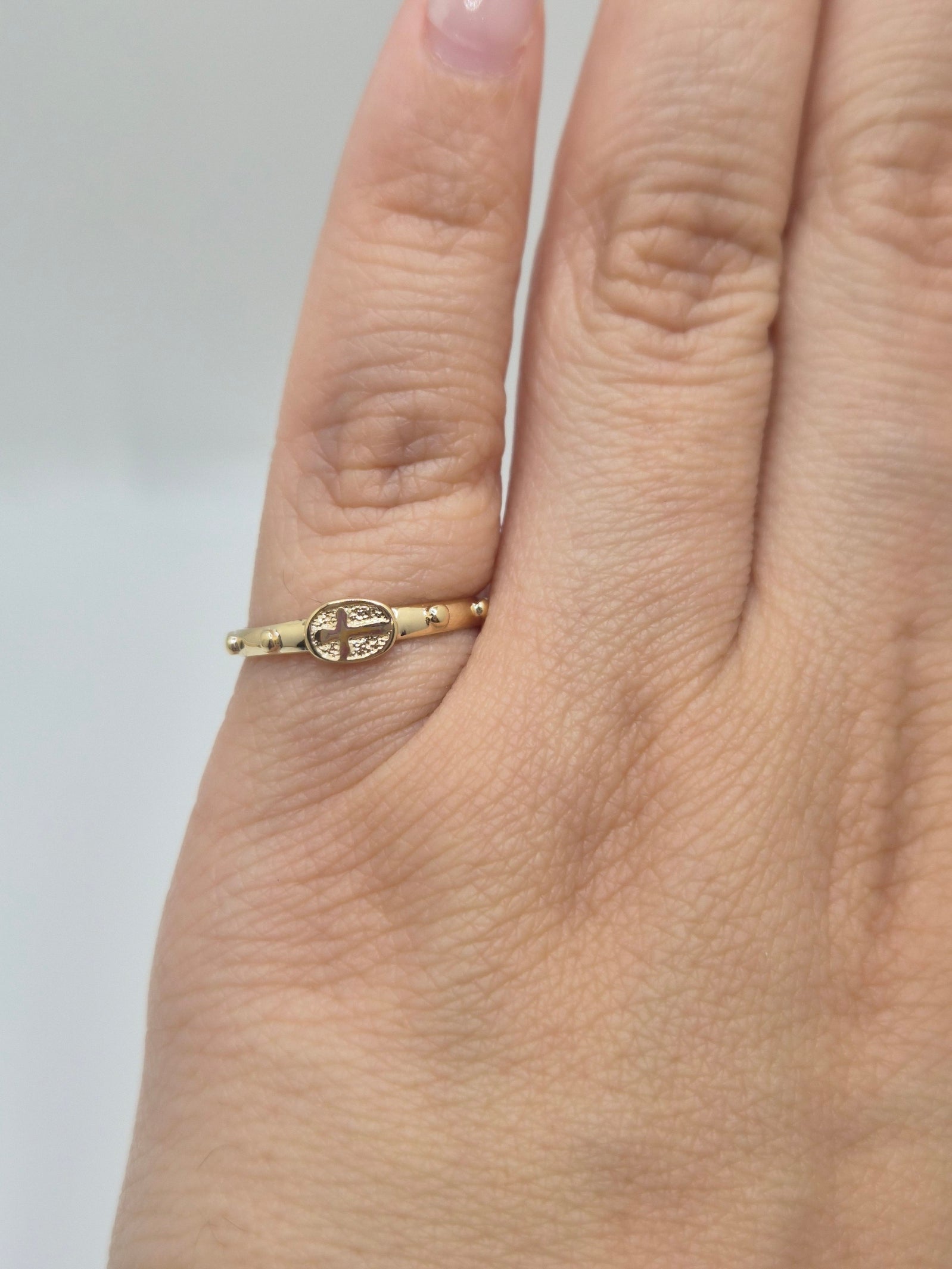 A dainty faith-inspired piece designed for everyday wear. This 14K gold stackable ring features a petite sideways cross that sits softly along the band, creating a minimal, elegant look. Perfect on its own or layered with your favorite rings for a chic, meaningful stack.