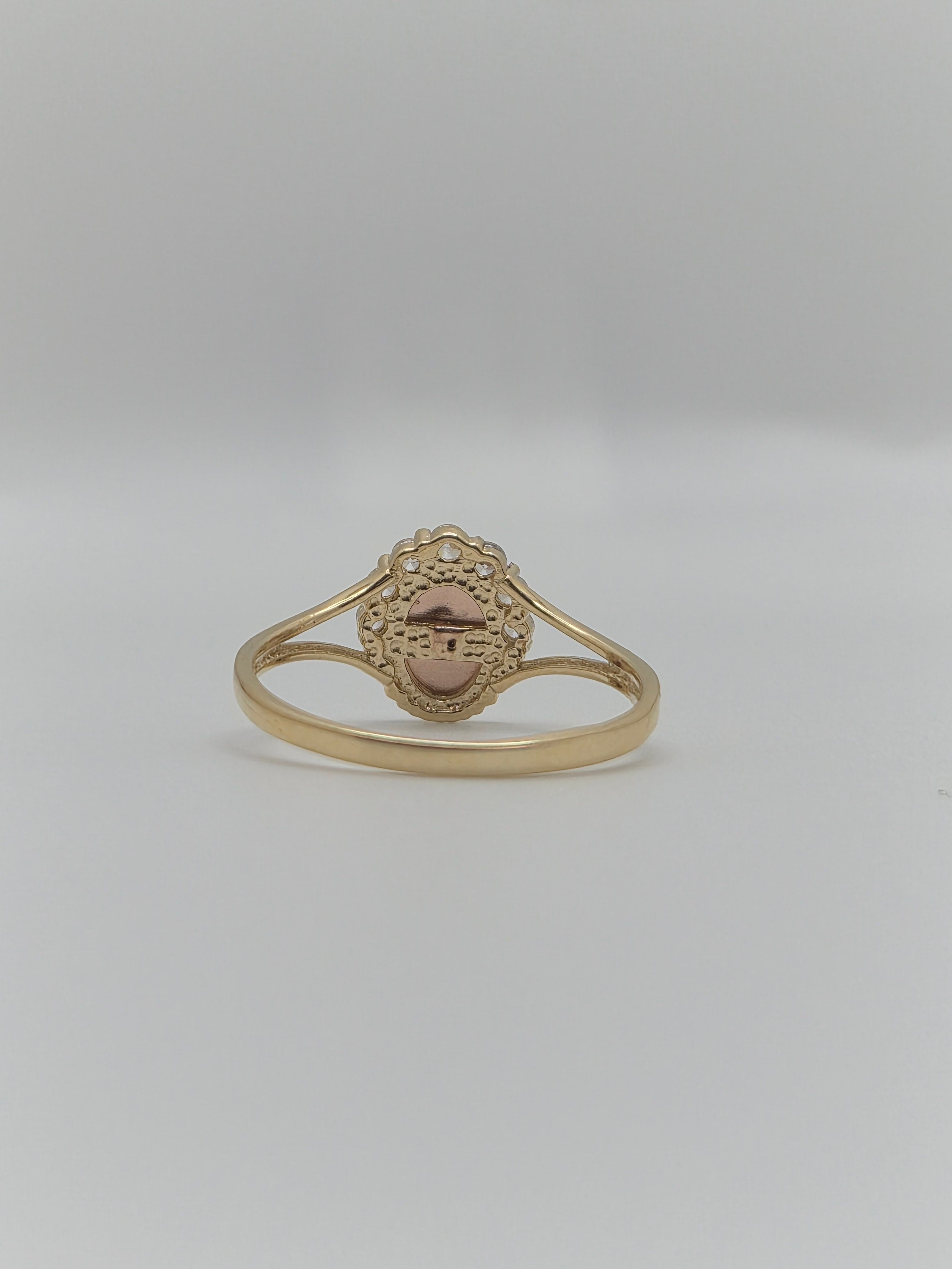 A dainty and meaningful 14K tri-color gold ring featuring La Virgencita de Guadalupe (the Virgin Mary) surrounded by a delicate halo of sparkling CZ stones. The blend of rose, white, and yellow gold gives this piece a timeless elegance — representing love, faith, and devotion in perfect harmony.