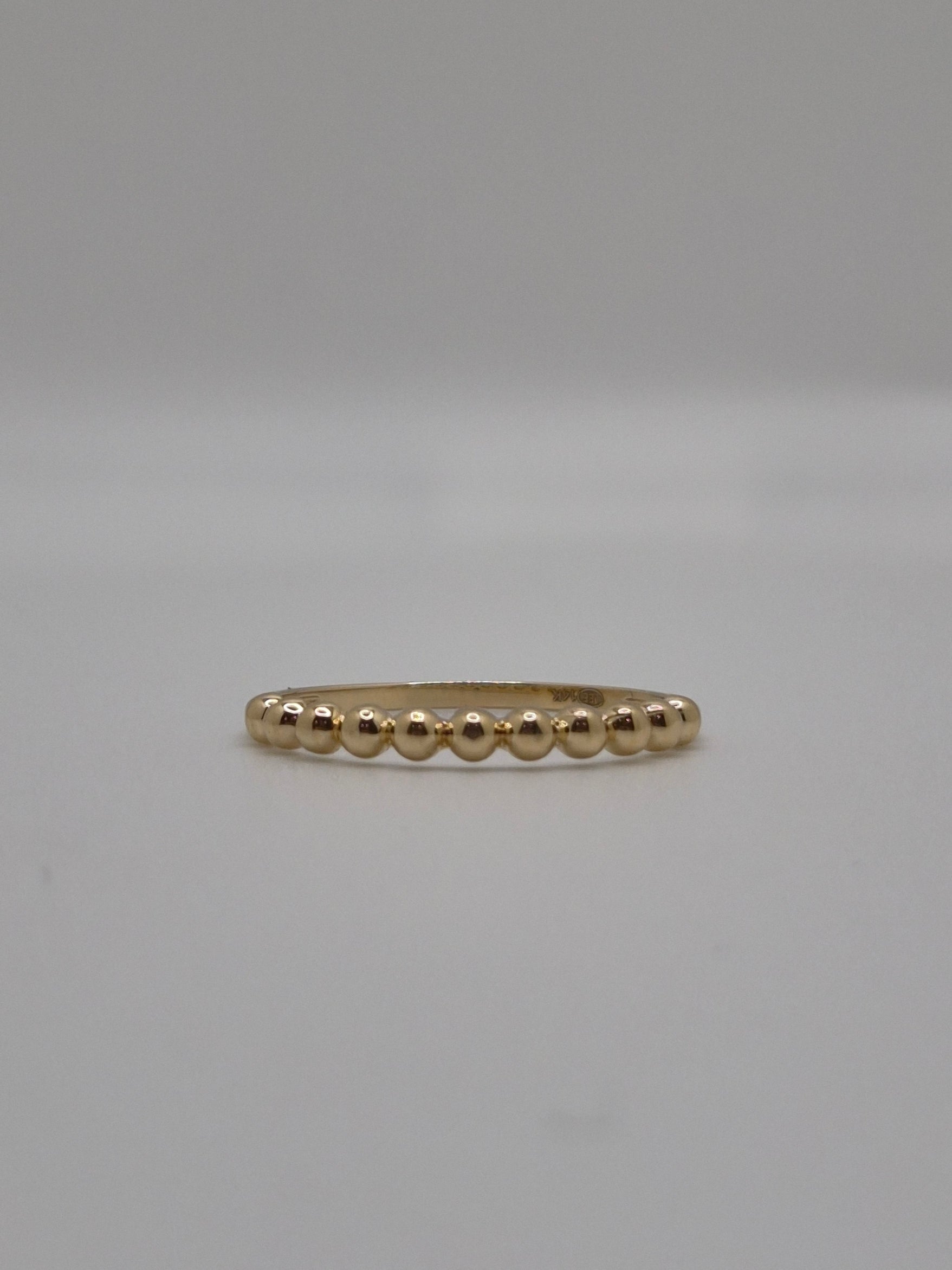 This 14K yellow gold thumb ring features a dainty and chic beaded design that adds a touch of elegance to any look. Its delicate craftsmanship makes it perfect for stacking or wearing alone as a statement piece. A versatile addition to your jewelry collection, this ring is both timeless and stylish.