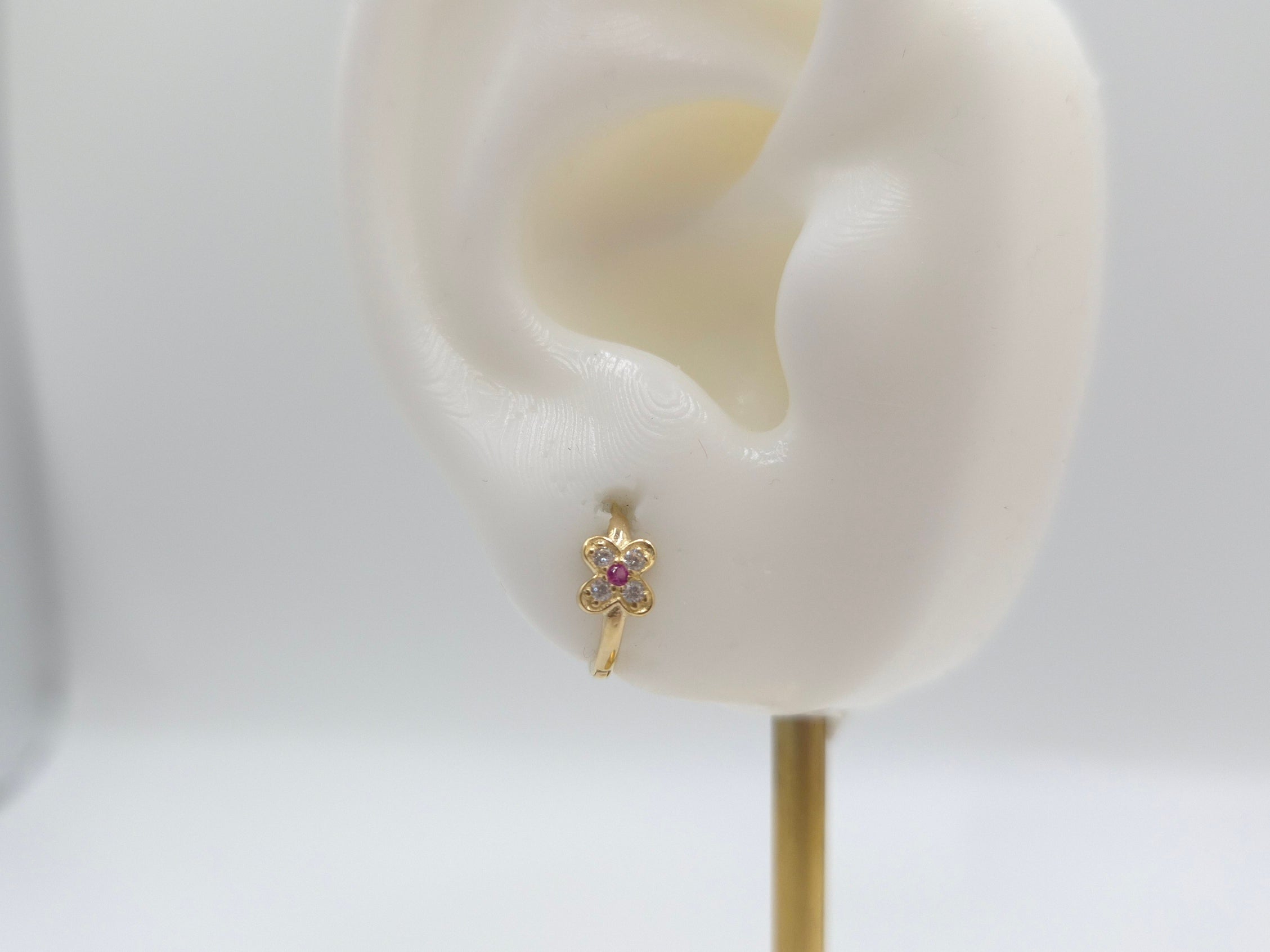 Add a playful sparkle to your collection with these 14K yellow gold huggie hoops, designed with a dainty flower-shaped cubic zirconia detail. The center features a pop of pink, surrounded by clear CZ accents for the perfect mix of charm and elegance. At 10mm, these lightweight huggies hug the earlobe comfortably—making them a sweet everyday choice for both women and little girls.