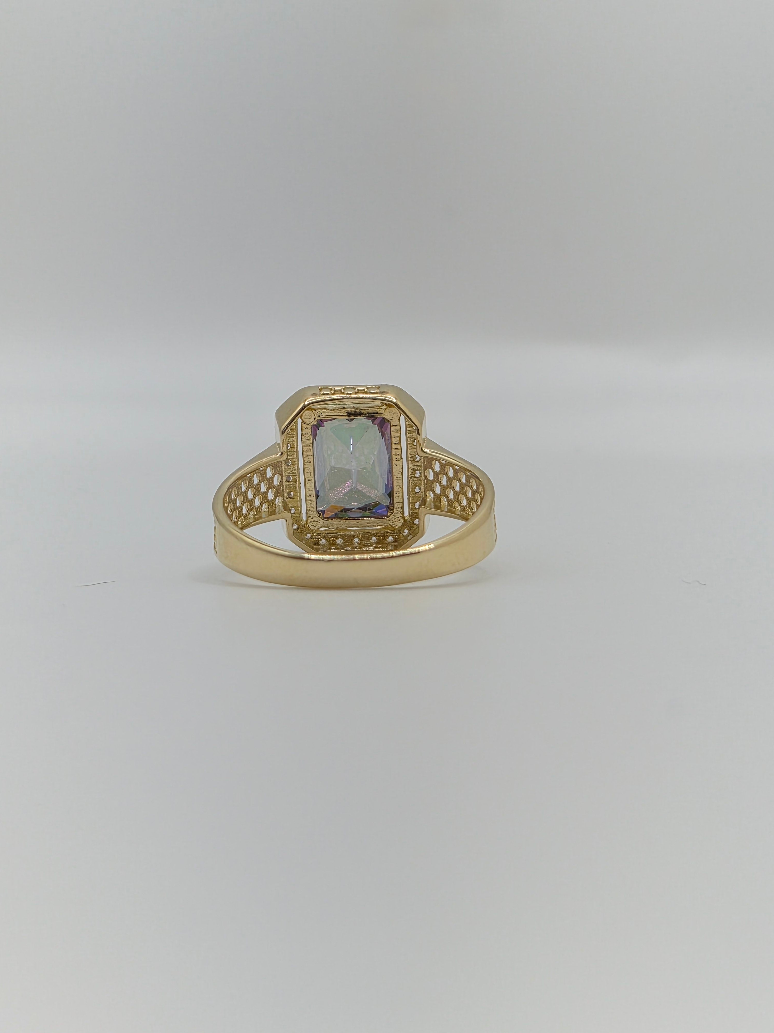 Make a bold statement with this 14K yellow gold ring featuring a radiant fancy-cut mystic topaz cubic zirconia. The center stone shines with iridescent hues of green, purple, and blue, framed by a sparkling halo of clear CZ accents. The band showcases a unique openwork design that adds extra detail and elegance. With its eye-catching colors and refined finish, this ring is perfect for those who love standout jewelry pieces.