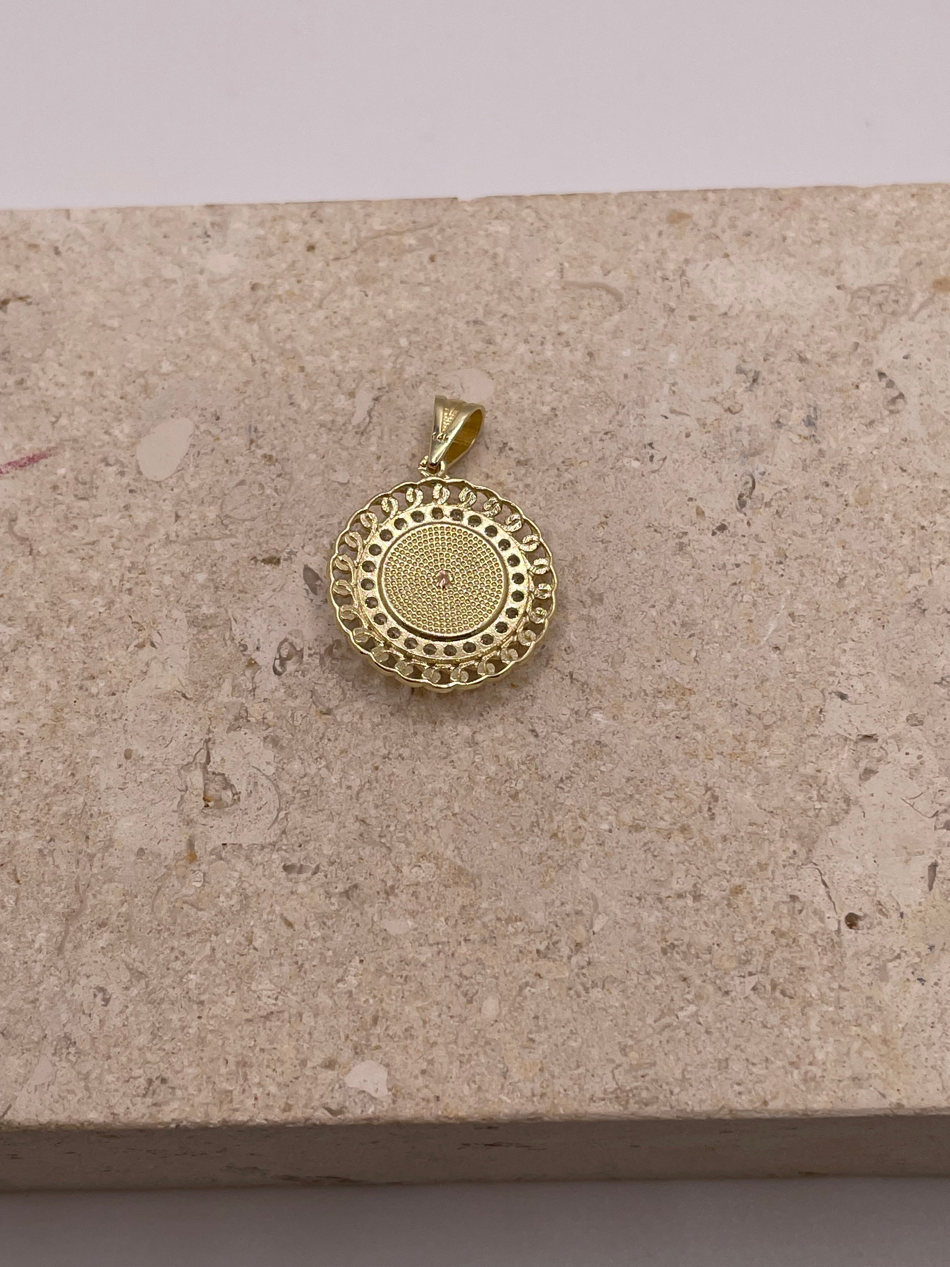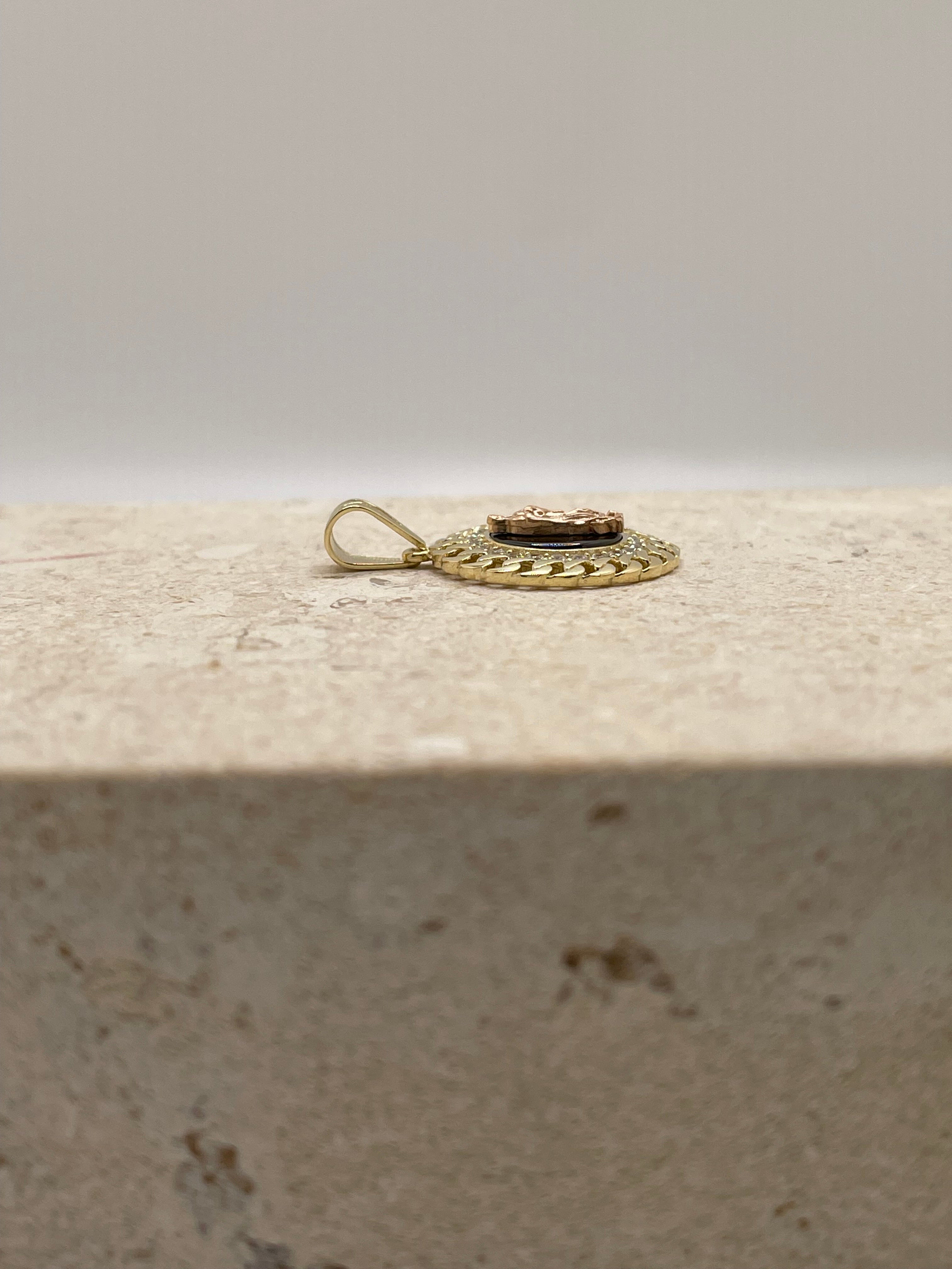This stunning 14K yellow gold pendant features a unique design, starting with a black onyx circle at the center, beautifully framing a delicate rose gold Virgen de Guadalupe (Virgin Mary). Surrounding the onyx is a sparkling border of cubic zirconia stones, adding a brilliant touch of elegance. The outer edge of the pendant is finished with a bold Cuban link-style border, creating a dynamic and striking contrast.
