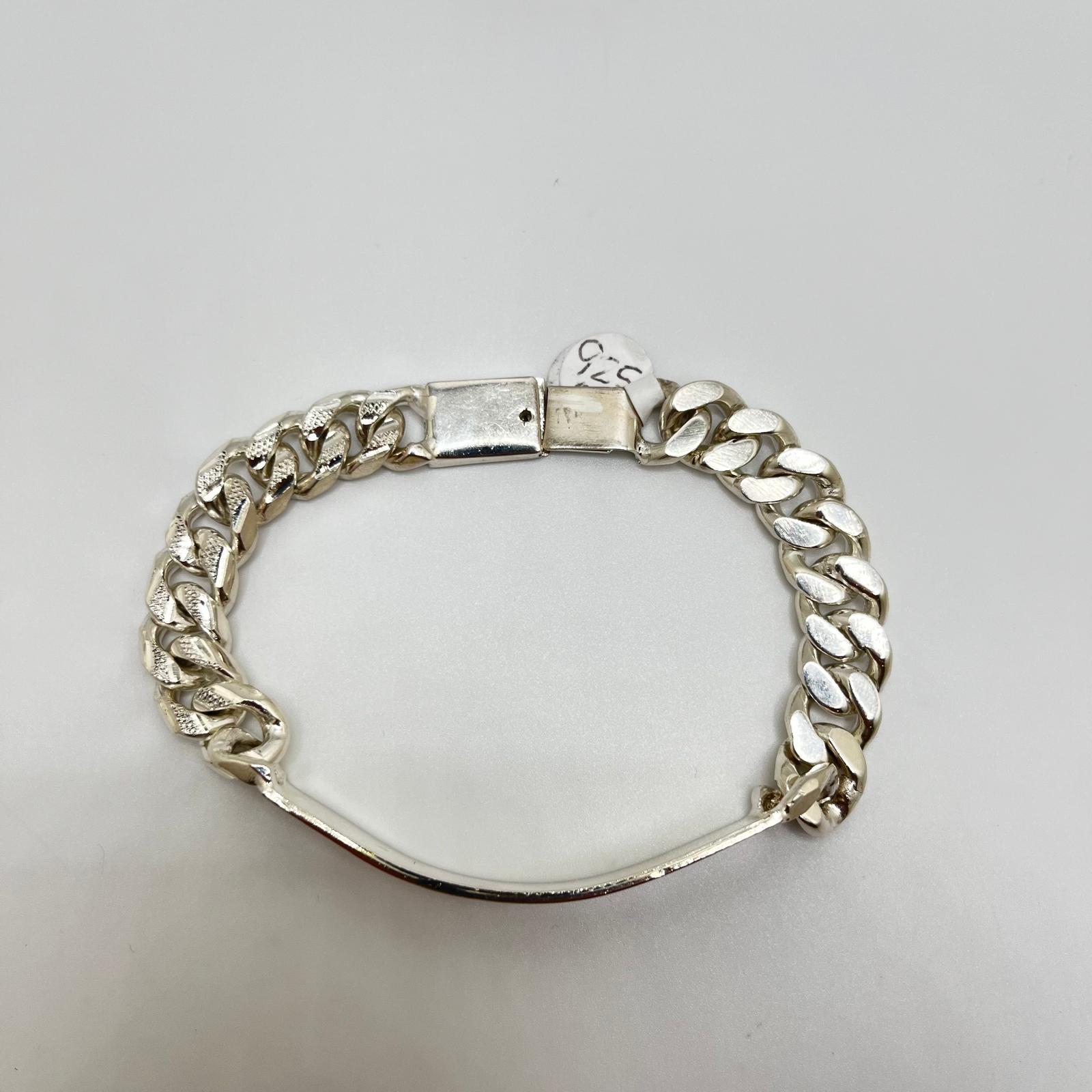 This bold 925 sterling silver bracelet features classic diamond-cut Cuban links with a sleek blank ID plate, perfect for engraving or wearing as-is. The links have a polished finish with textured accents that catch the light just right, giving it that extra detail without being too flashy. Secured with a sturdy box clasp for peace of mind.