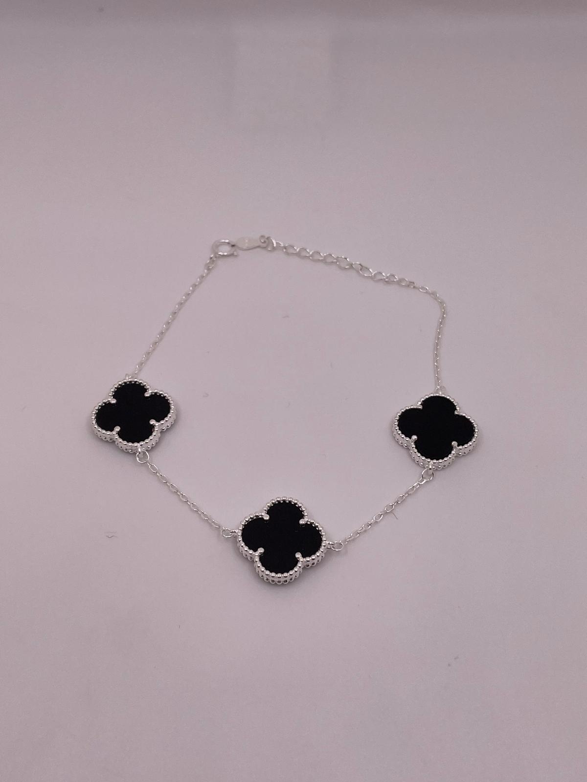 This stunning 925 sterling silver bracelet features three clover-shaped motifs with a black center. The adjustable design fits comfortably from 7 to 8 inches, making it a perfect piece for both everyday wear and special occasions.