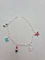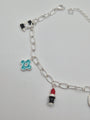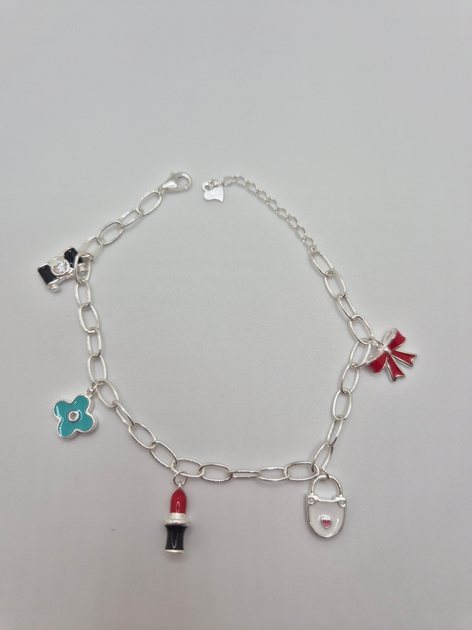 Elevate your style with this playful sterling silver charm bracelet featuring fashion-inspired enamel accents. The bracelet showcases a collection of chic charms, including a red bow, turquoise flower, lipstick, handbag, and sparkling camera, all linked on a classic silver chain.