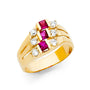 This 14K yellow gold 3-row Semanario ring features three stacked rows, each adorned with a vibrant red CZ center stone and two white CZ stones on the sides. A bold, stylish twist on a classic design — perfect for adding color and sparkle to your everyday look.