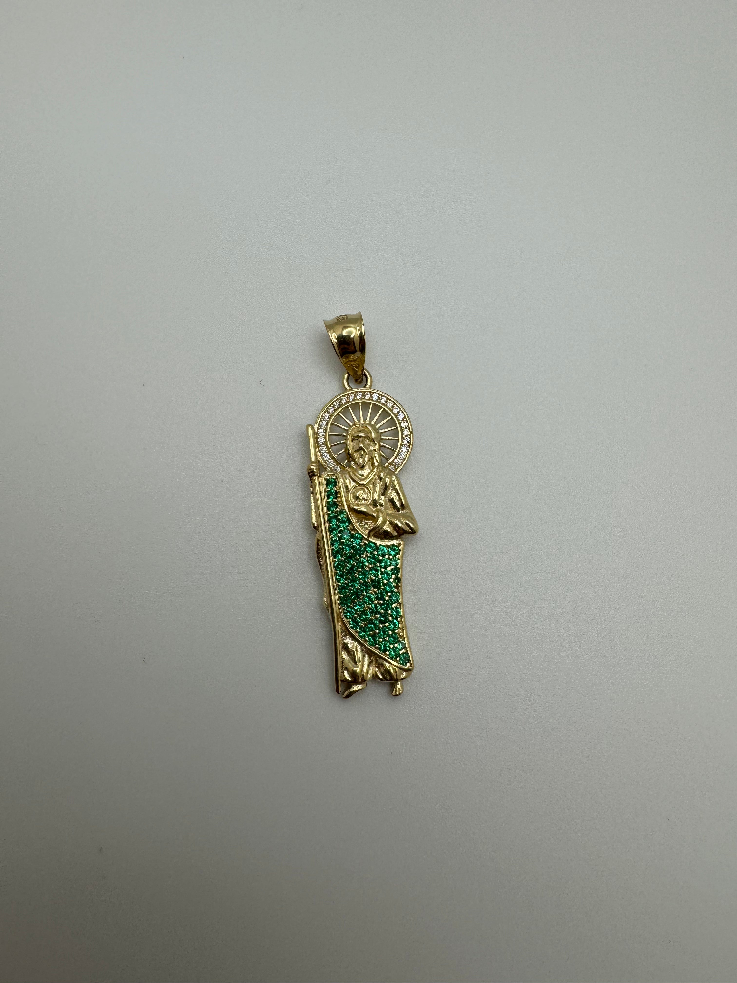 14k yellow gold san judas pendant with cz halo and green cz body(je02)