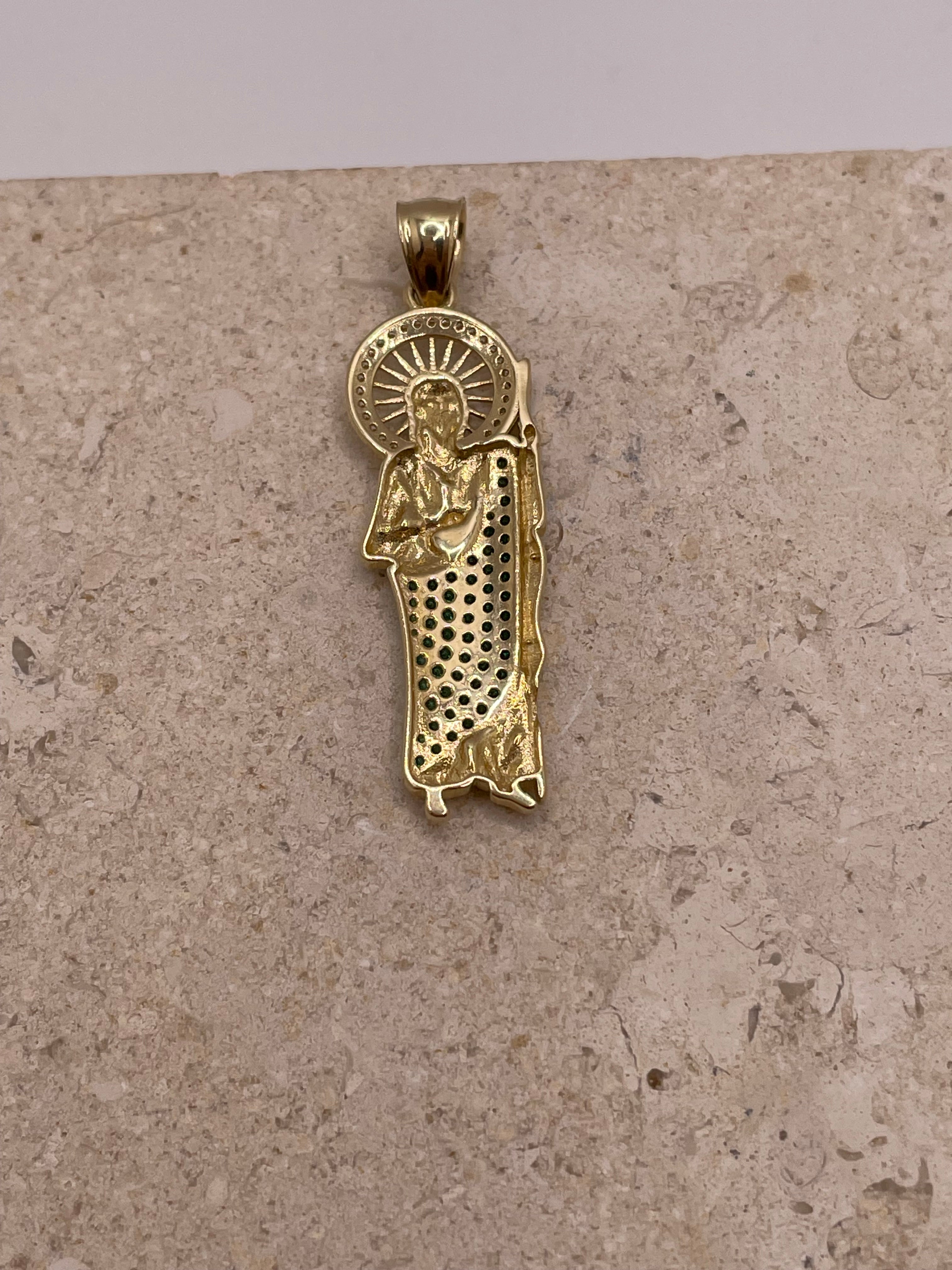 This 14K yellow gold San Judas pendant features a radiant round halo of cubic zirconia stones surrounding the head of Saint Jude. His body is beautifully detailed with green CZ stones, creating a striking contrast. Measuring approximately 1.5 inches, this pendant makes a bold and elegant statement of faith, perfect for those who appreciate intricate details and meaningful symbolism.