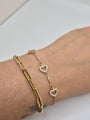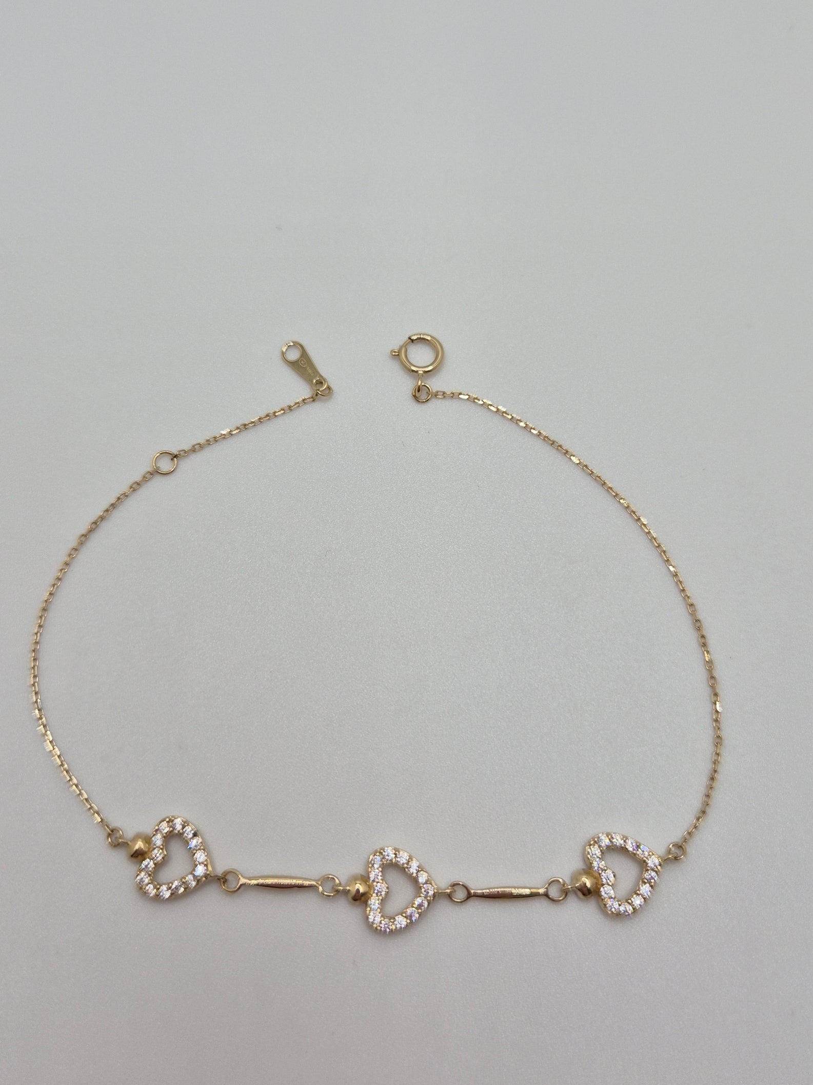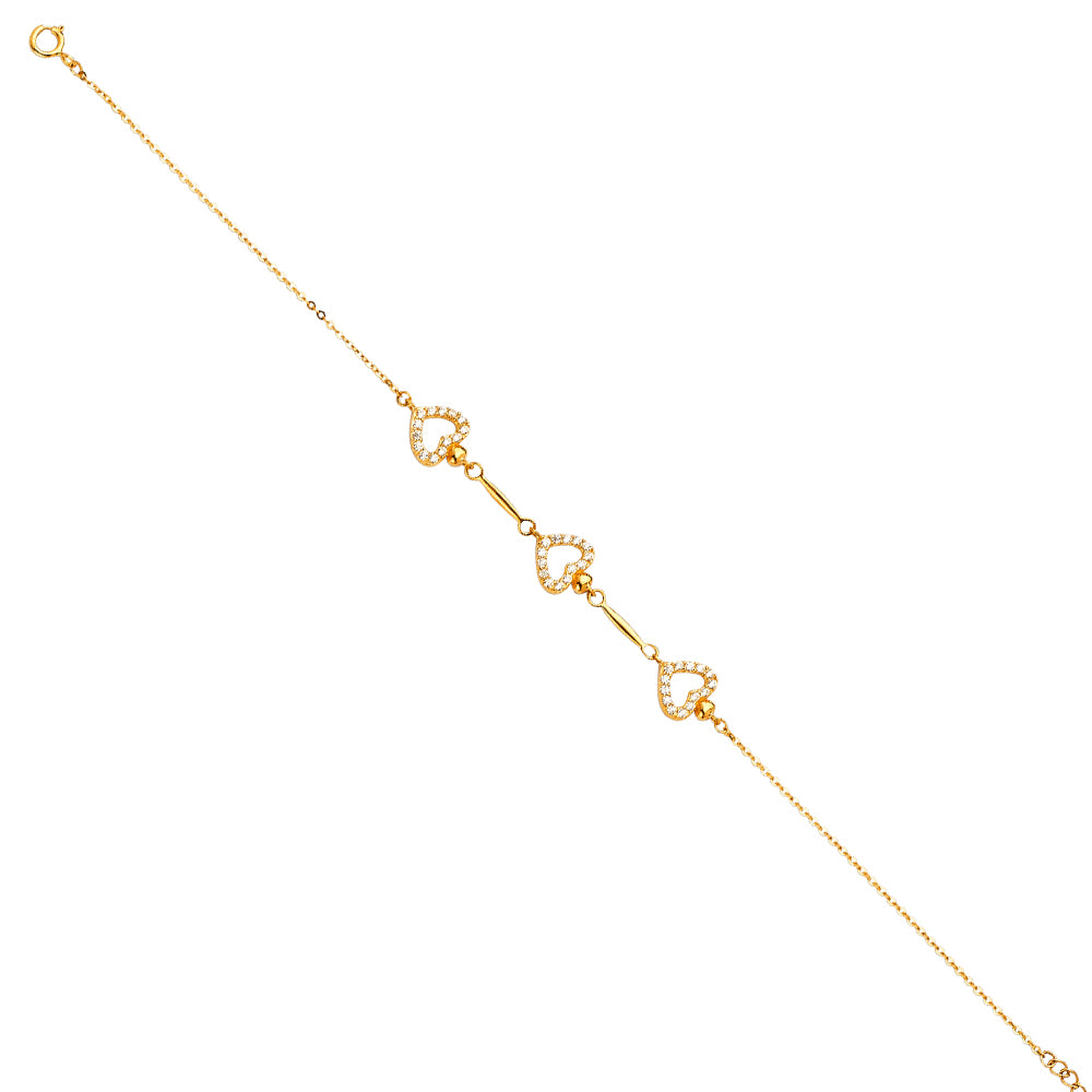 Delicate, sparkly, and full of love — this 14K gold bracelet features three open heart charms lined with dazzling cubic zirconia stones. Each heart is linked by polished gold bar accents, adding a unique touch to this elegant piece. Whether you're stacking or wearing it solo, it's the perfect little statement of love.