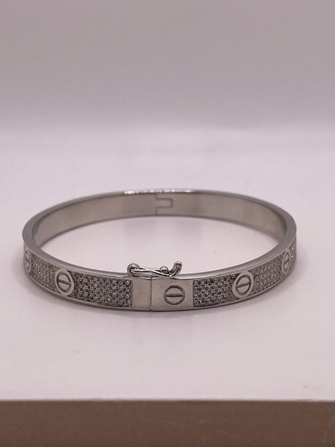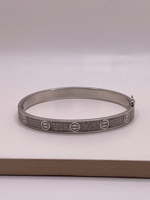 This stunning 925 silver love bangle dupe features dazzling cubic zirconia stones all around the bangle, measuring 6.4 cm (approximately 2.5 inches) in diameter. With its sparkling details and elegant design, it’s the perfect piece to express your style and sentiment effortlessly