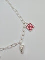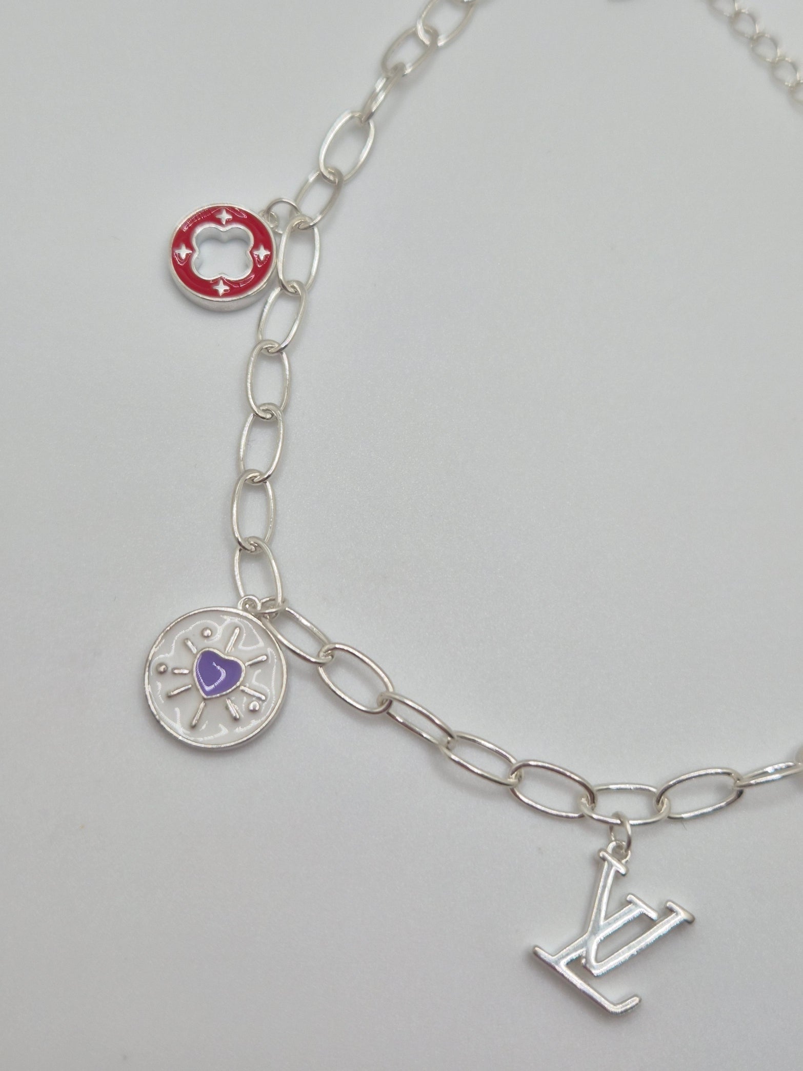 Add playful elegance to your look with this sterling silver charm bracelet, designed with bold pops of color and iconic accents. The bracelet features a classic silver link chain adorned with unique charms, including red enamel designs, a purple heart medallion, and a polished silver “LV”-style charm.